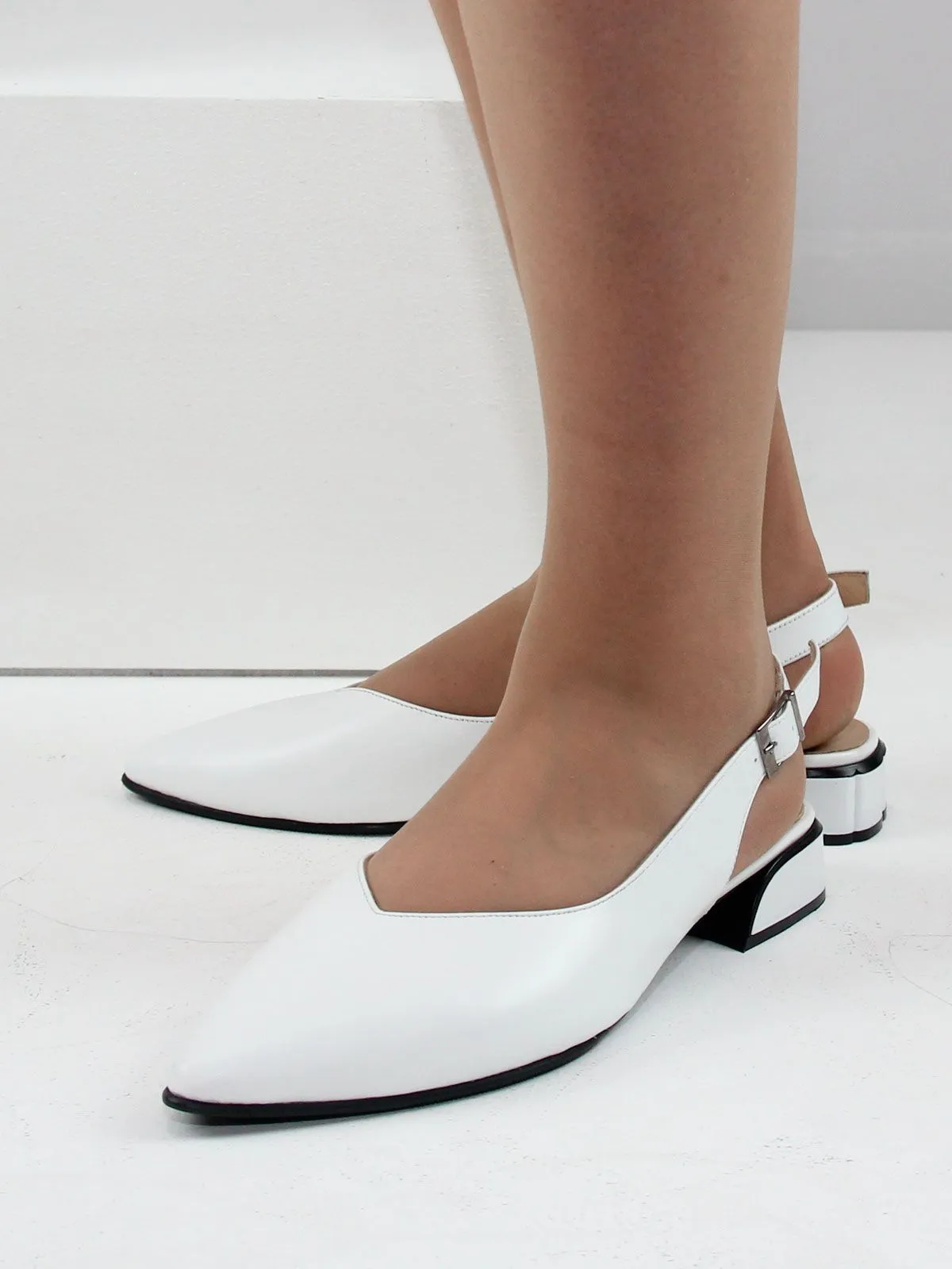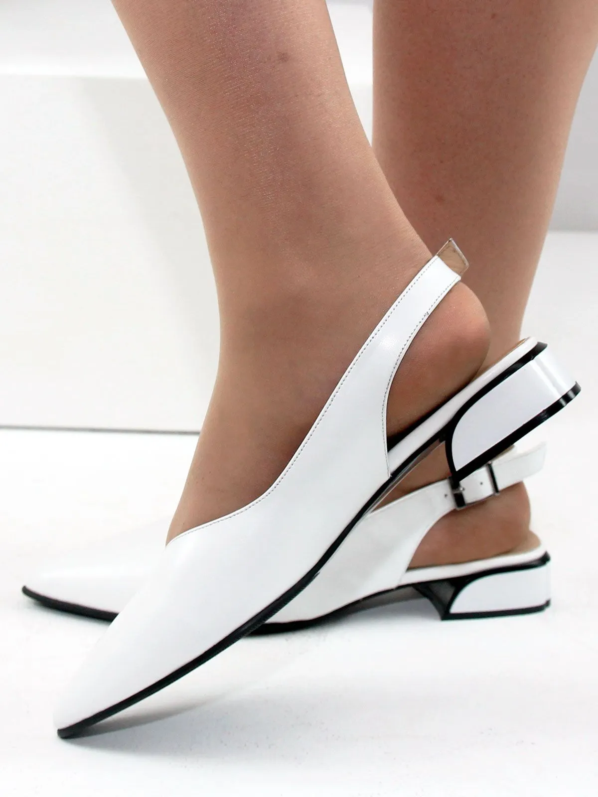 Туфли слингбэки больших размеров из белой натуральной кожи — элегантная модель с закрытым мысом и открытой пяткой. Узкий мыс в стиле туфель лодочки визуально вытягивает силуэт и делает обувь более изящной. Лаконичный дизайн без лишнего декора выглядит аккуратно и универсально, поэтому такие туфли с открытой пяткой легко вписываются в повседневные и нарядные образы.