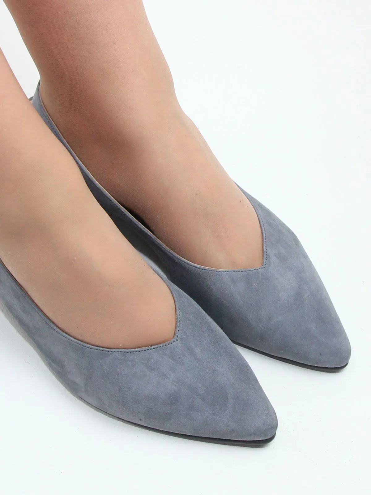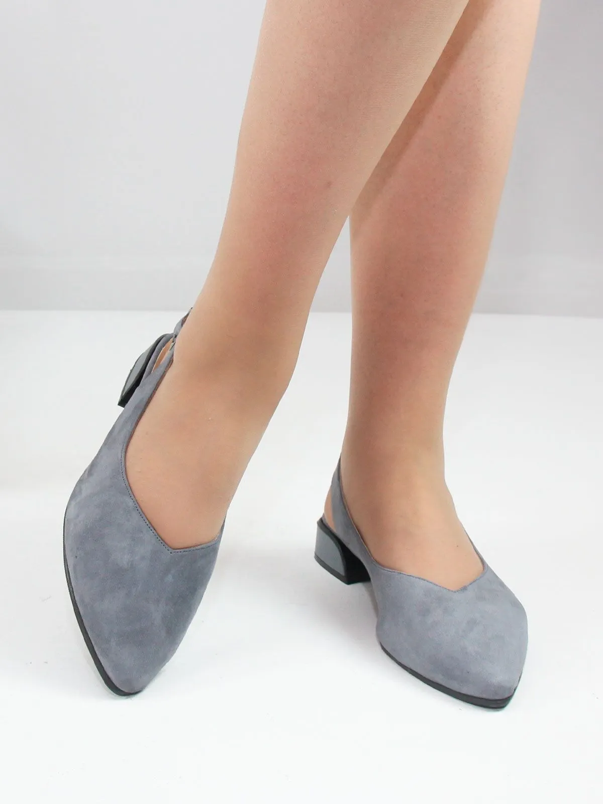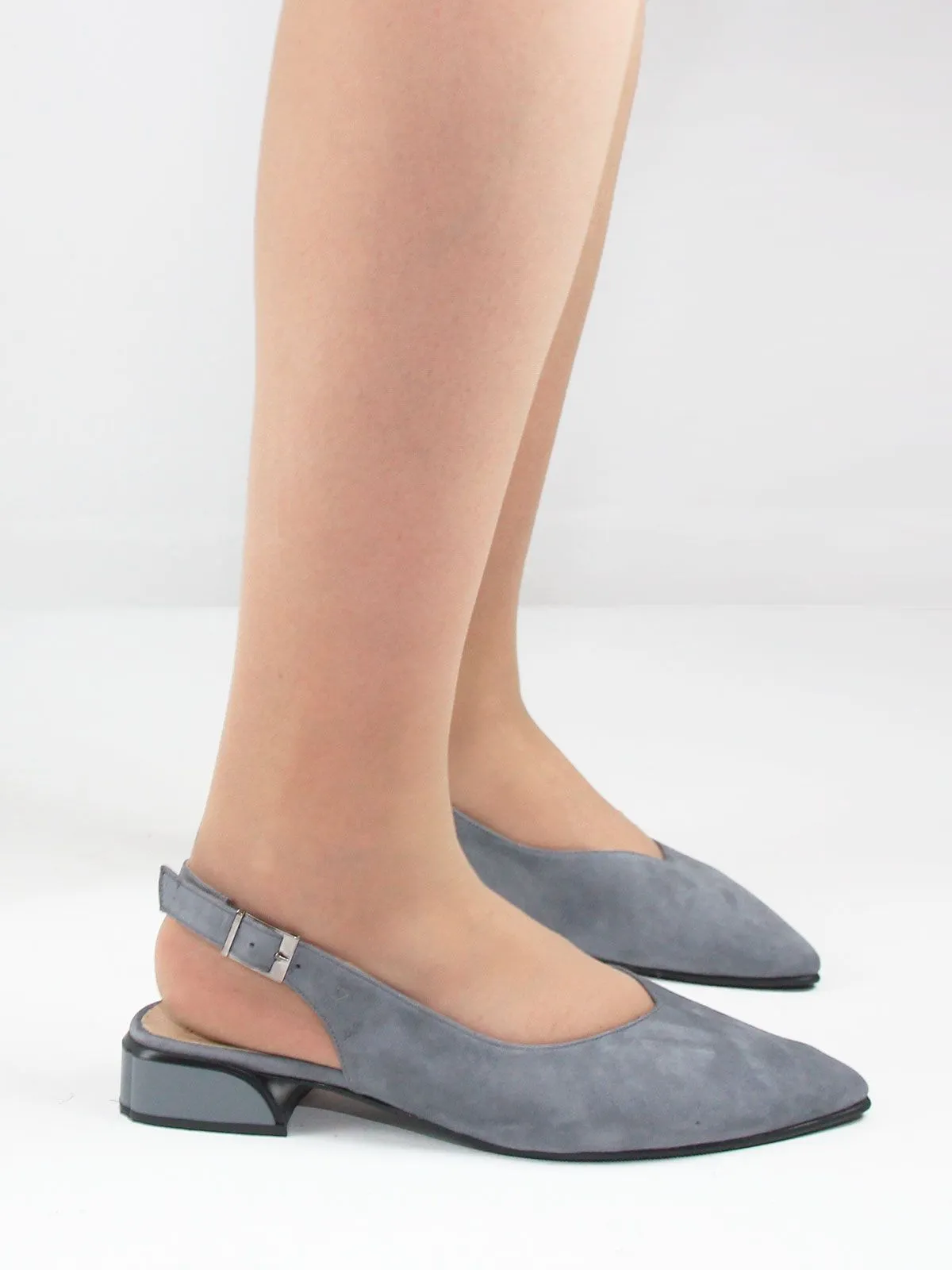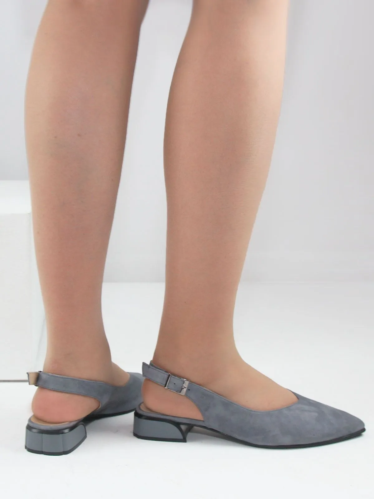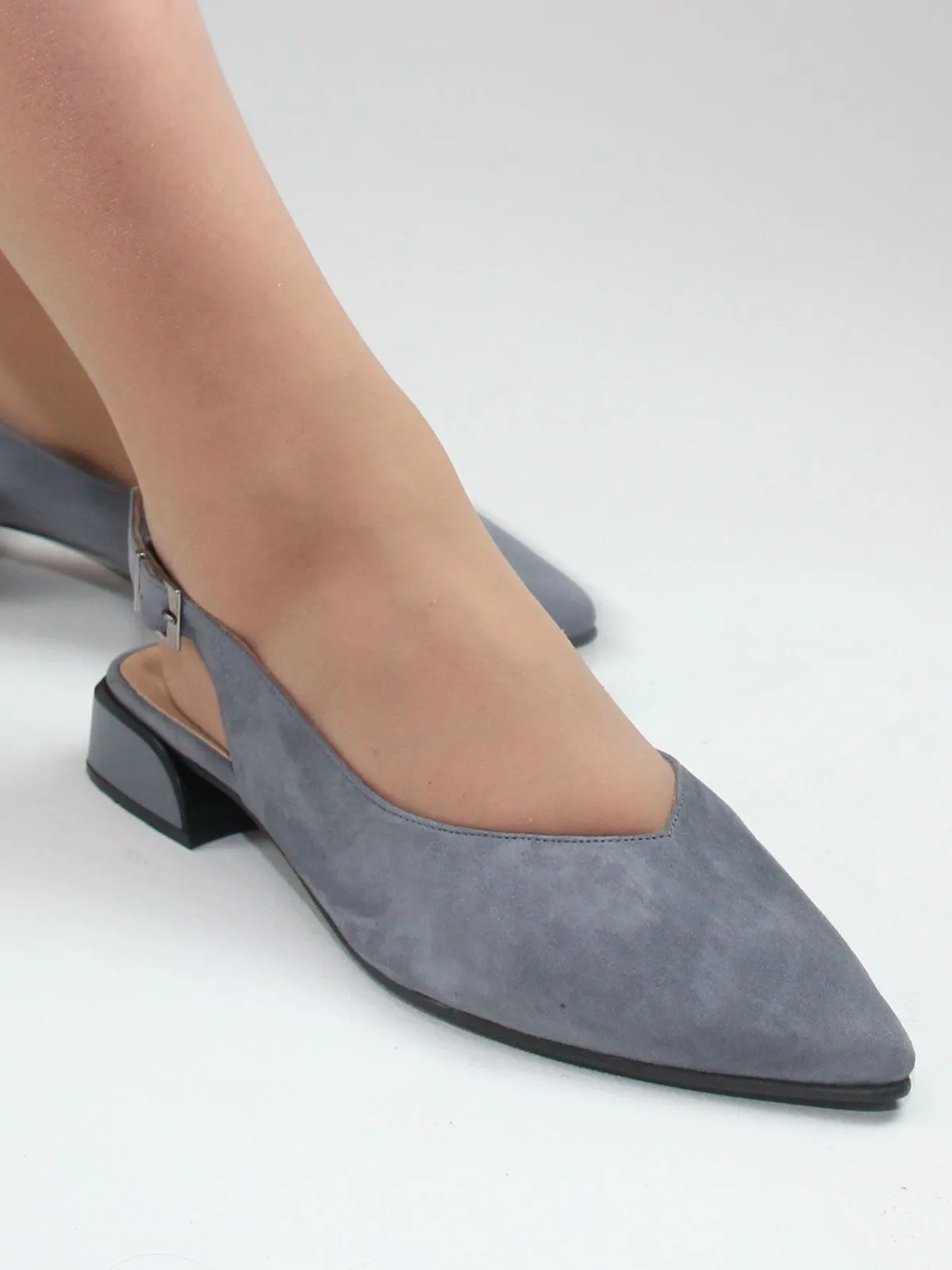 Туфли слингбэки больших размеров из натуральной серой замши — элегантная модель с закрытым мысом и открытой пяткой. Узкий мыс визуально вытягивает силуэт и делает обувь более изящной. Лаконичный дизайн без лишнего декора смотрится аккуратно и универсально, поэтому такие туфли с открытой пяткой легко вписываются в повседневные и деловые образы.