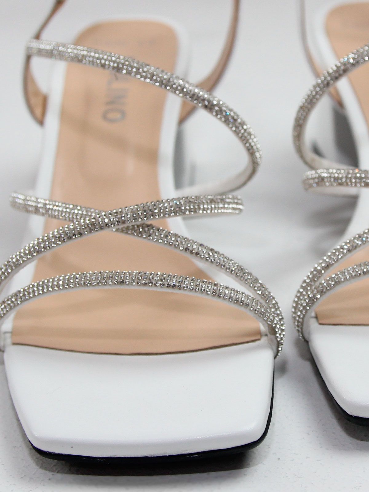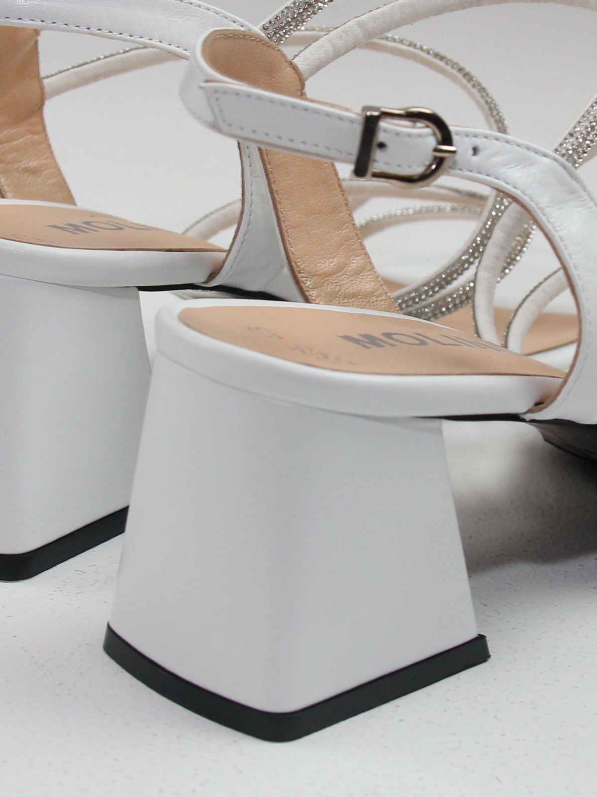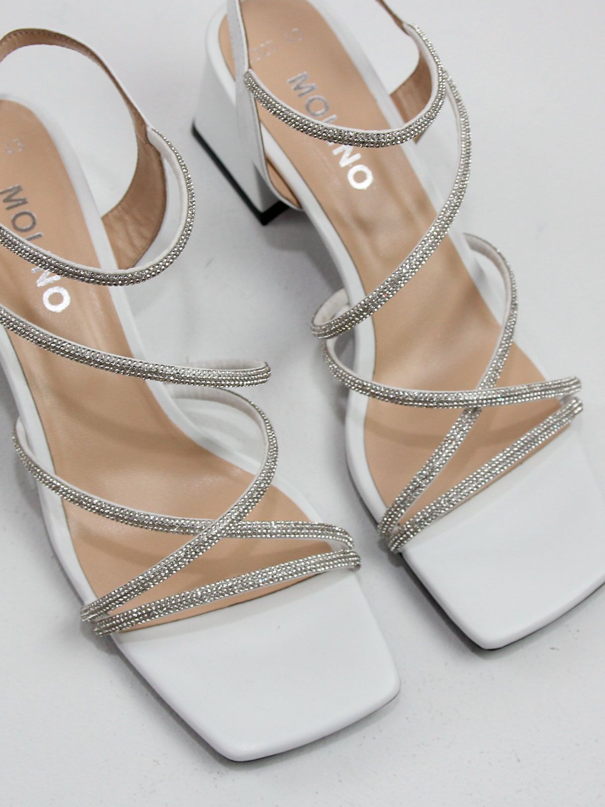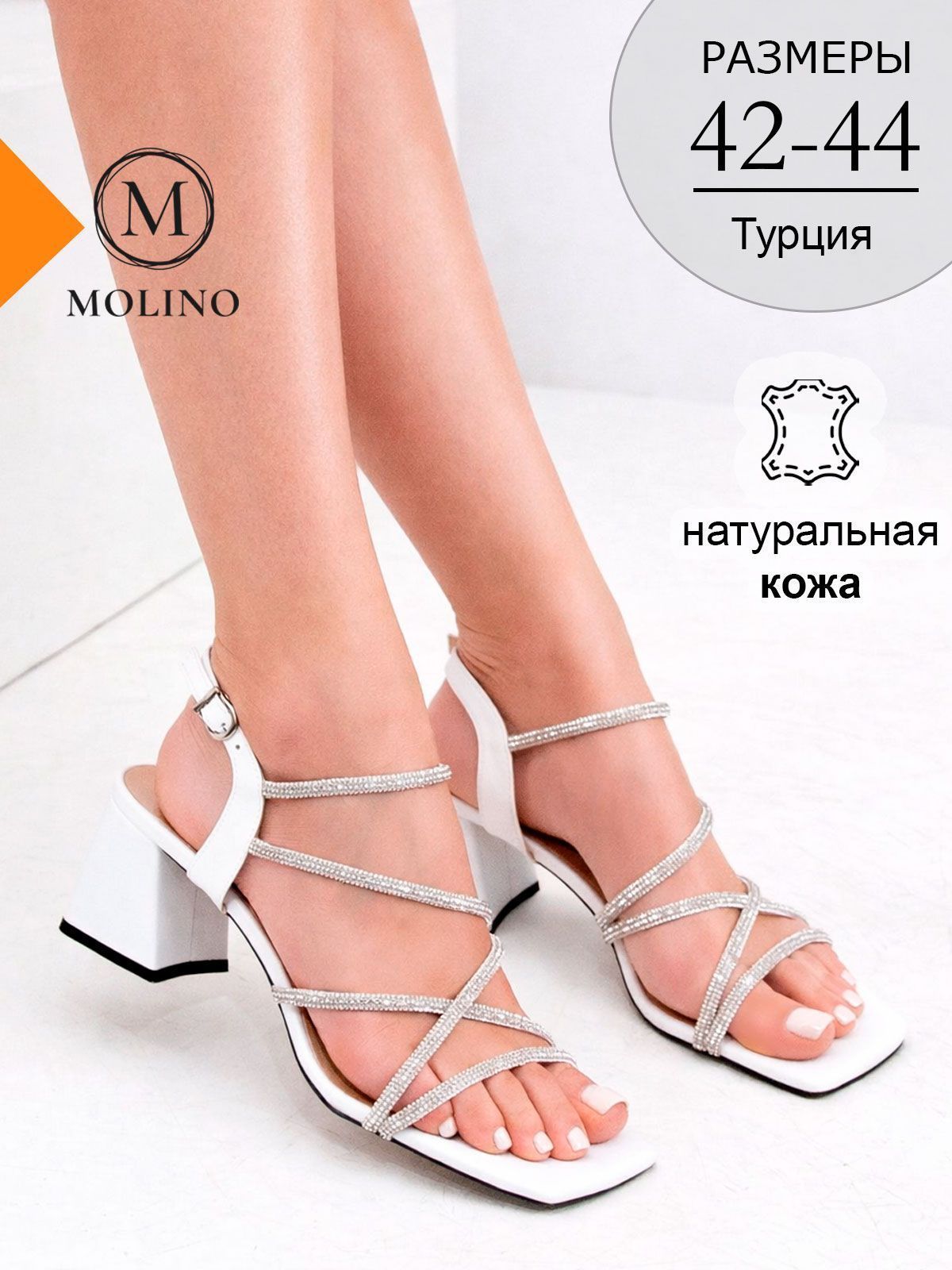 Модель выполнена из белой натуральной кожи, которая выглядит элегантно и подчёркивает праздничный характер обуви. Сверкающие ремешки гармонично дополняют дизайн и добавляют блеск, оставаясь аккуратными и утончёнными.