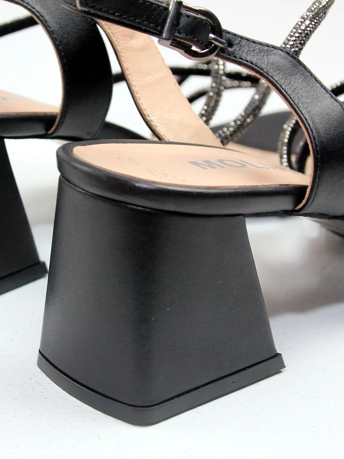 Модель выполнена из чёрной натуральной кожи, которая выглядит элегантно и универсально, подчёркивая выразительность дизайна. Сверкающие ремешки гармонично дополняют обувь и добавляют аккуратный блеск.