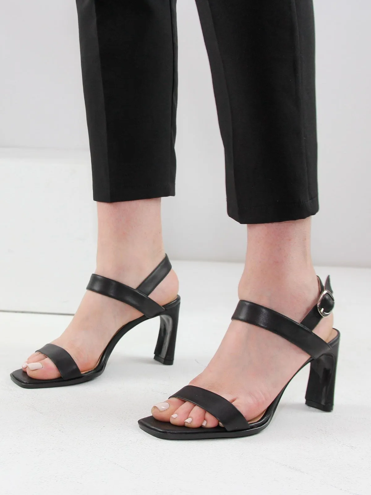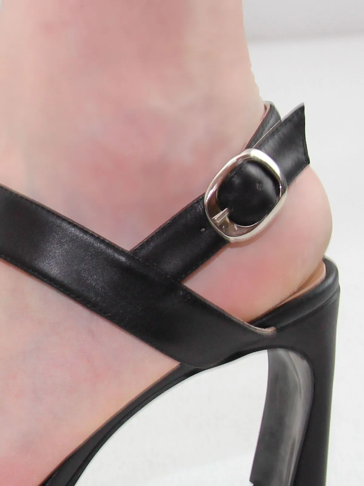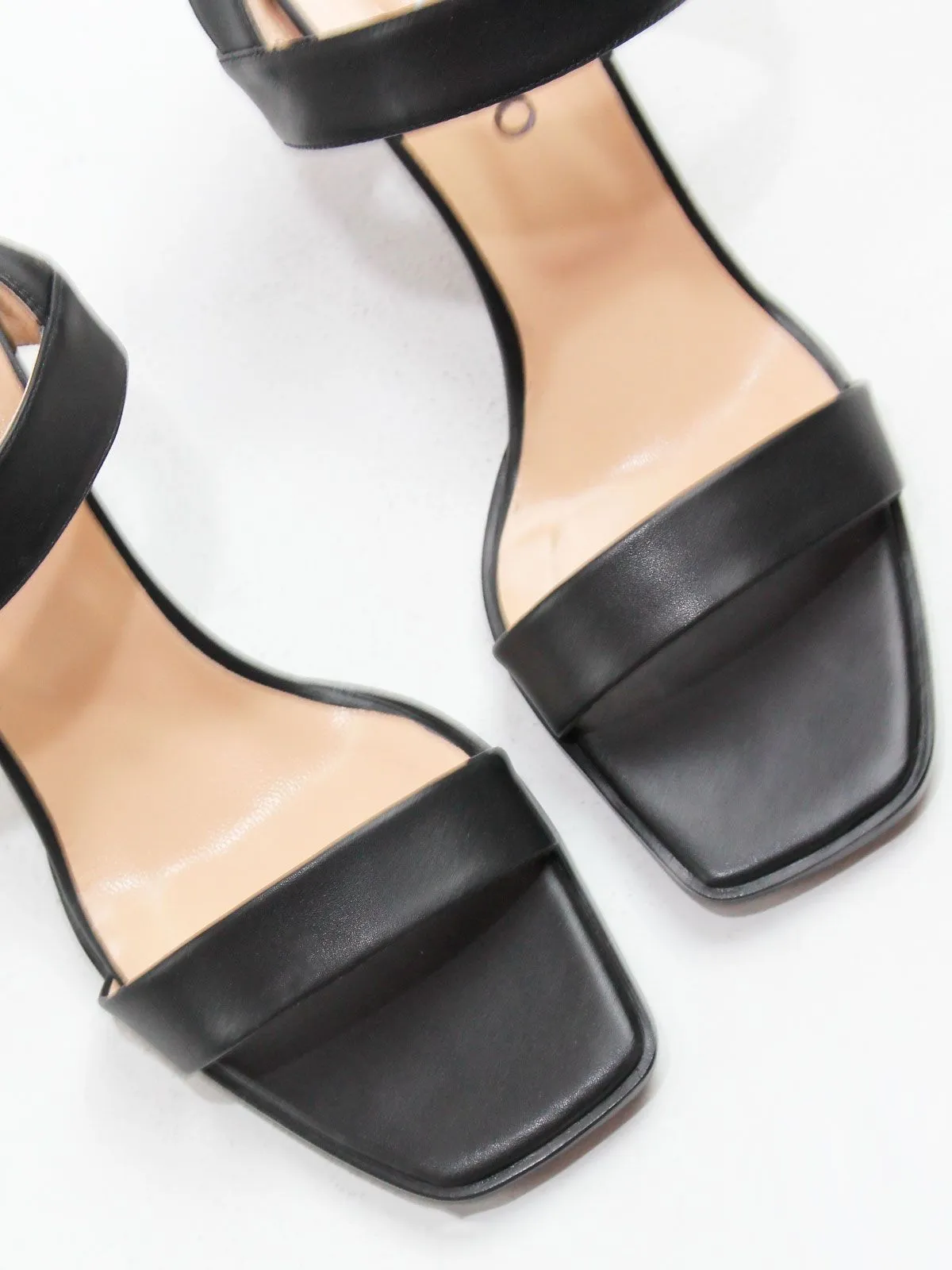 Летние босоножки из натуральной матовой кожи в классическом чёрном цвете. Изящный дизайн босоножек на высоком каблуке 9см визуально стройнит и придаёт образу уверенности.