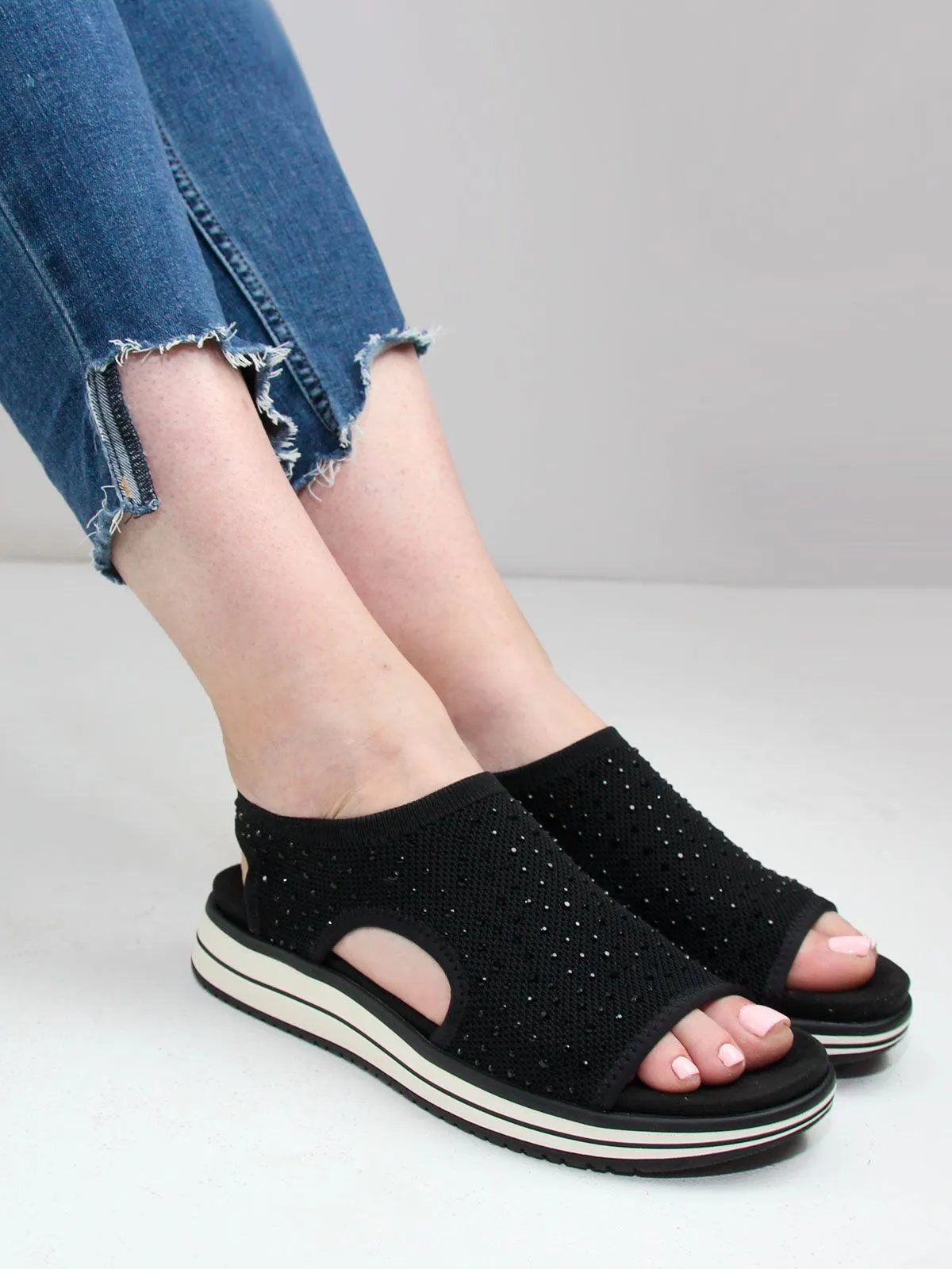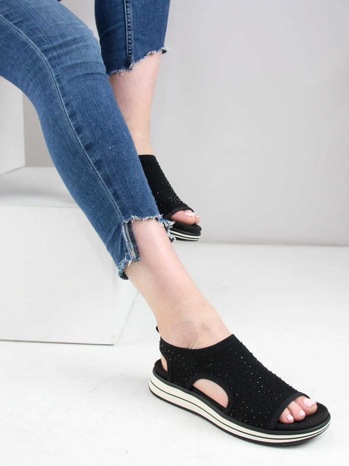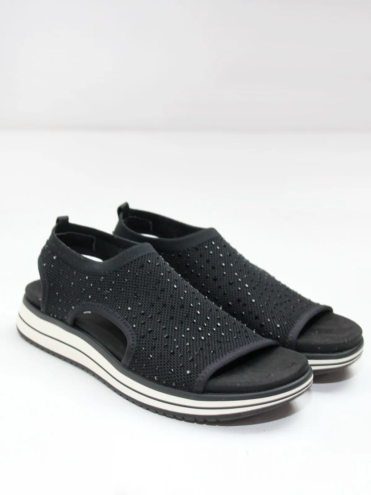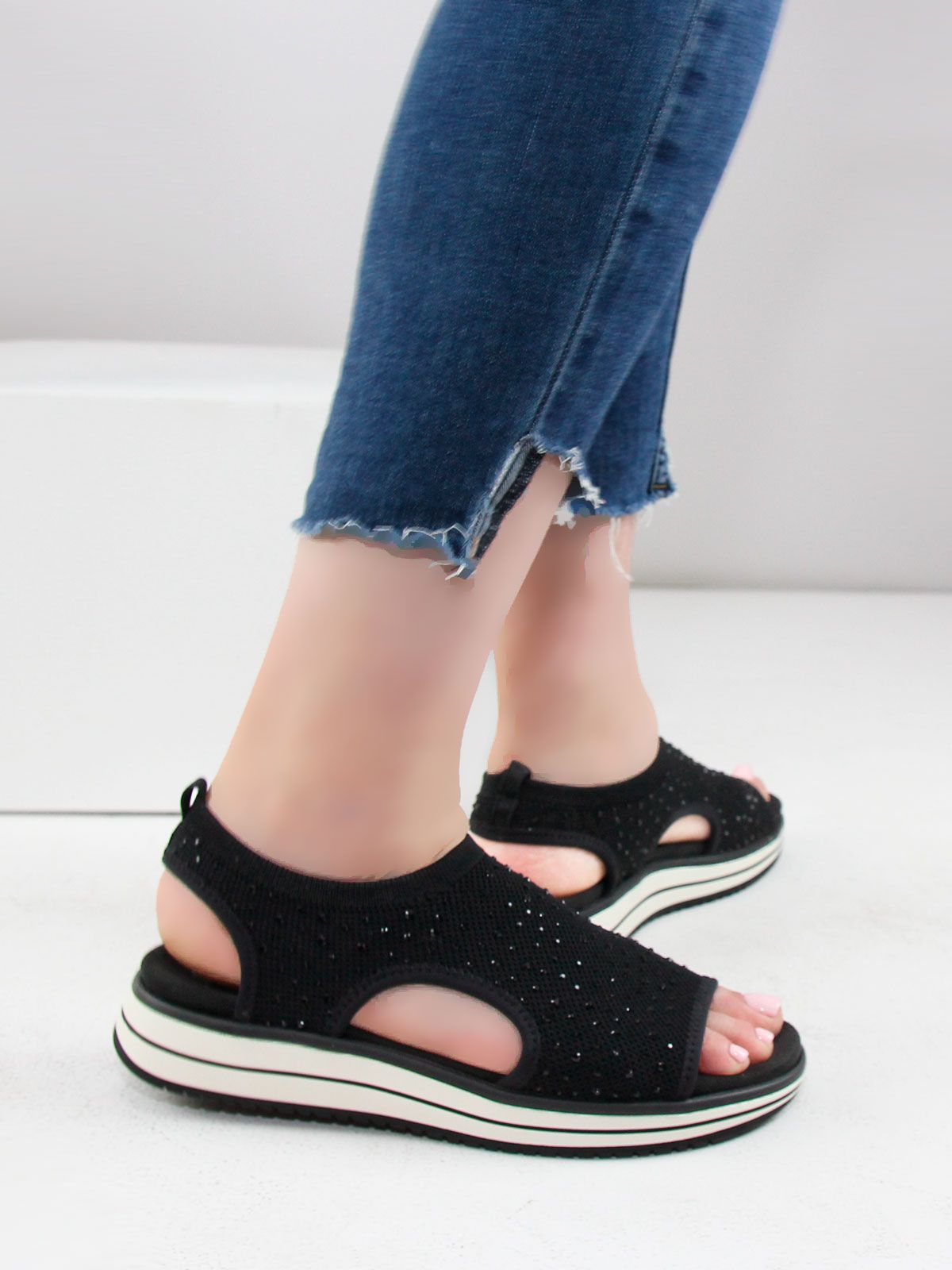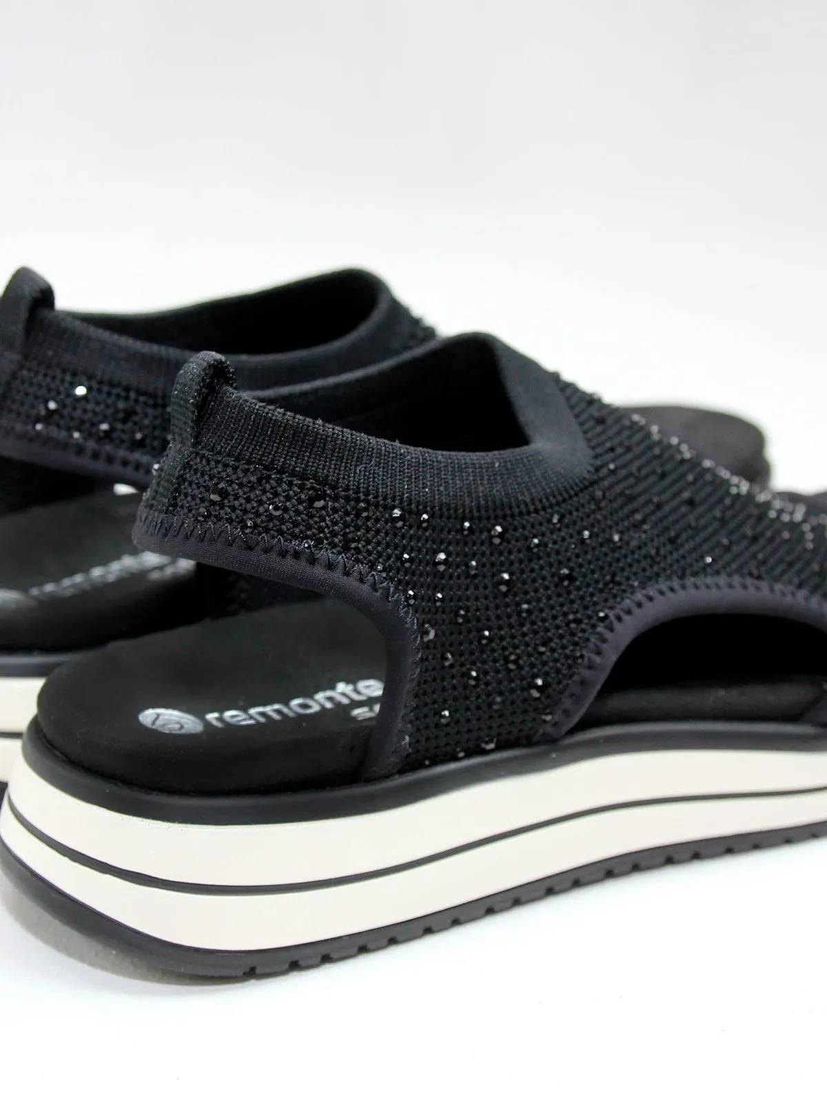 Босоножки больших размеров фирмы Remonte из текстильного материала, подойдут на широкую ногу, украшены черными стразами, не маломерят.