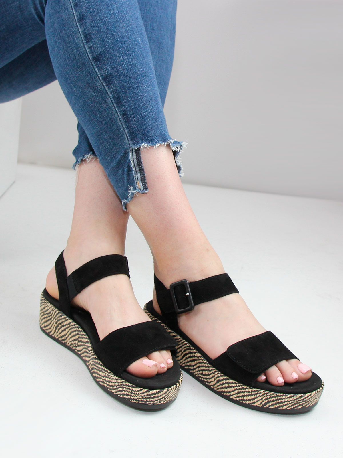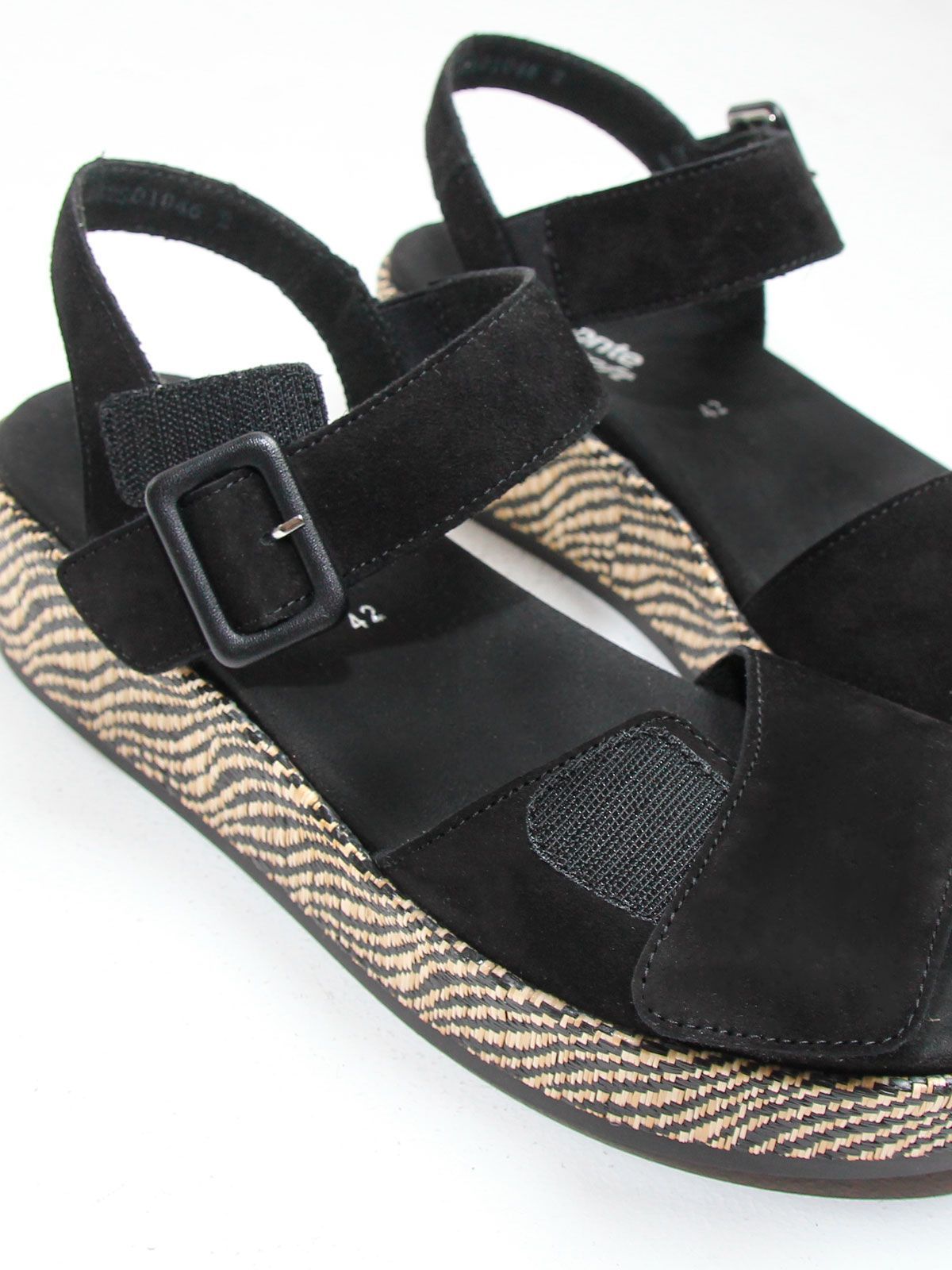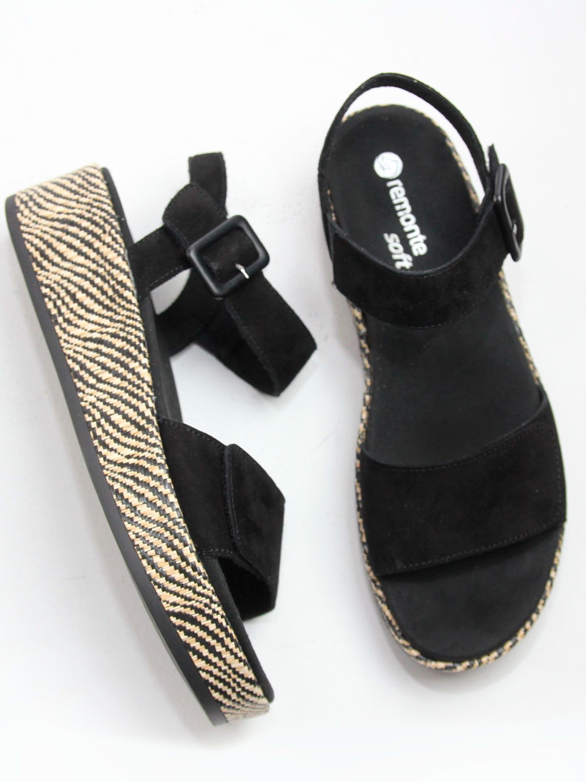 Эти стильные летние босоножки на танкетке от Remonte станут идеальным дополнением к вашему летнему гардеробу. Изготовленные из натуральной замши, они не только выглядят элегантно, но и обеспечивают комфорт вашим ногам в течение всего дня. Танкетка высотой 5 см обеспечивает удобную поддержку, а высота подошвы в 3.5 см добавляет легкости шагу. Благодаря ортопедической конструкции, эти босоножки подойдут даже для длительных прогулок. Черный цвет универсален и легко сочетается с любыми летними нарядами. Босоножки Remonte - это идеальный выбор для тех, кто ценит комфорт, стиль и качество.