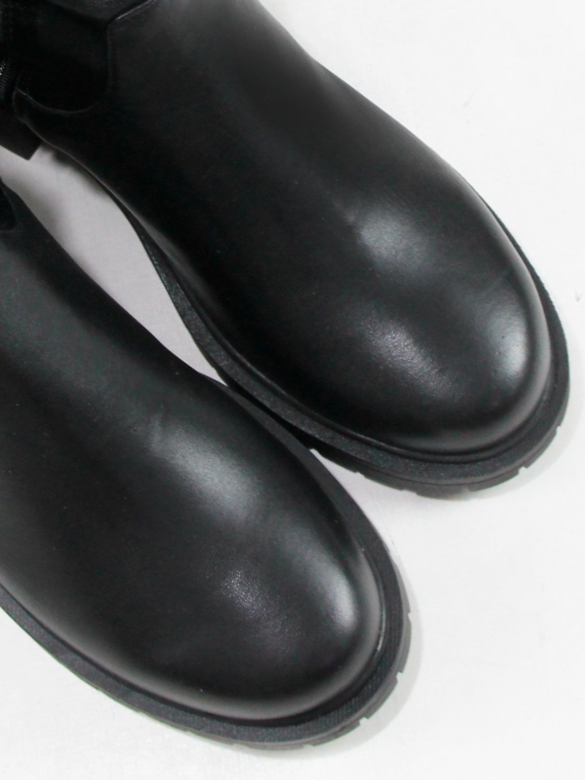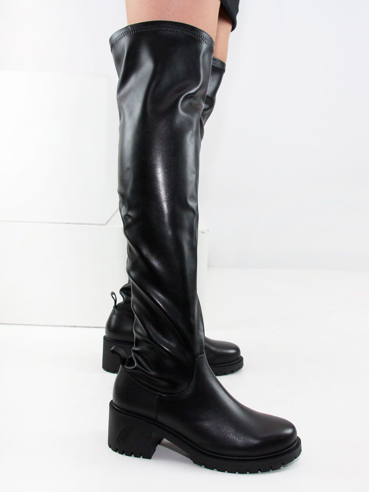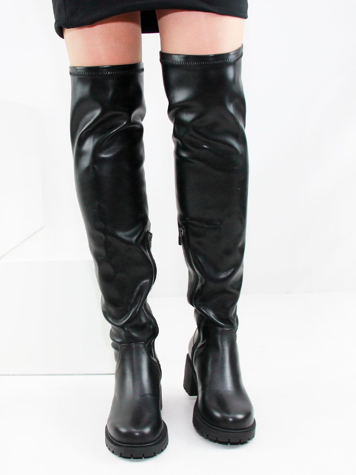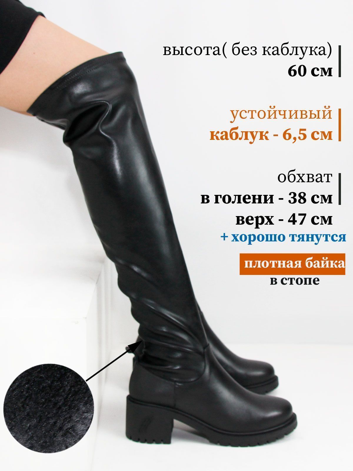 Ботфорты чулки стрейч больших размеров из кожи стрейч. Высота сапог - 60 см. Объем голенища в центре - 38 см, в самой верхней широкой части - 47 см. Модель утеплена плотной байкой с ворсом до щиколотки. Ботфорты очень хорошо тянутся. Подойдут на стандартную и широкую голень. Удобная нескользкая подошва на широком устойчивом каблуке.Рост модели - 180 см, размеро обуви -42: