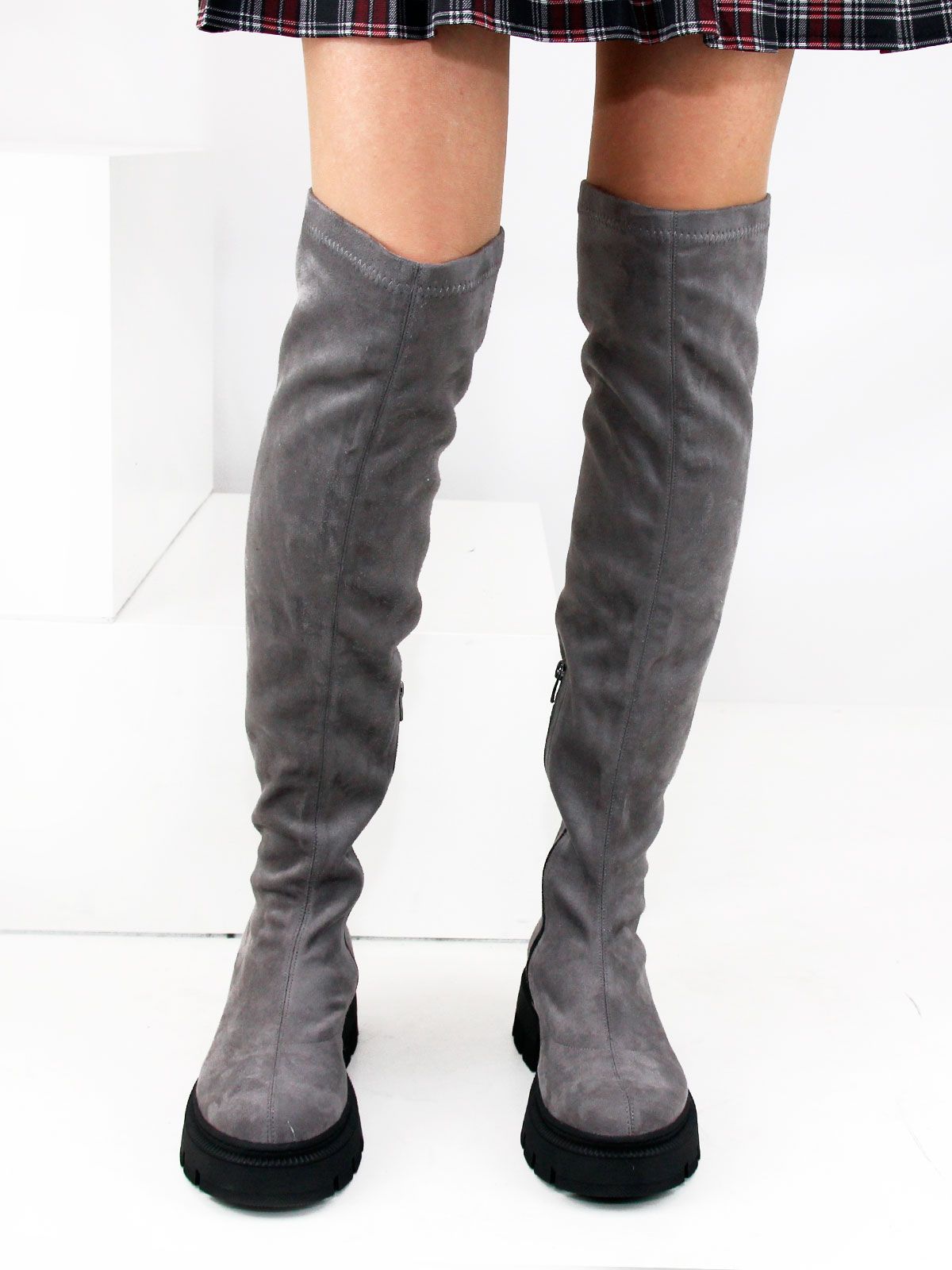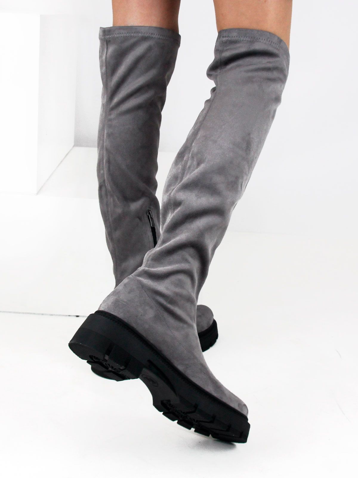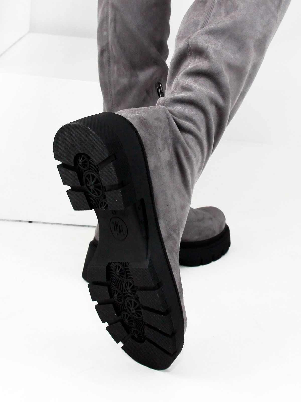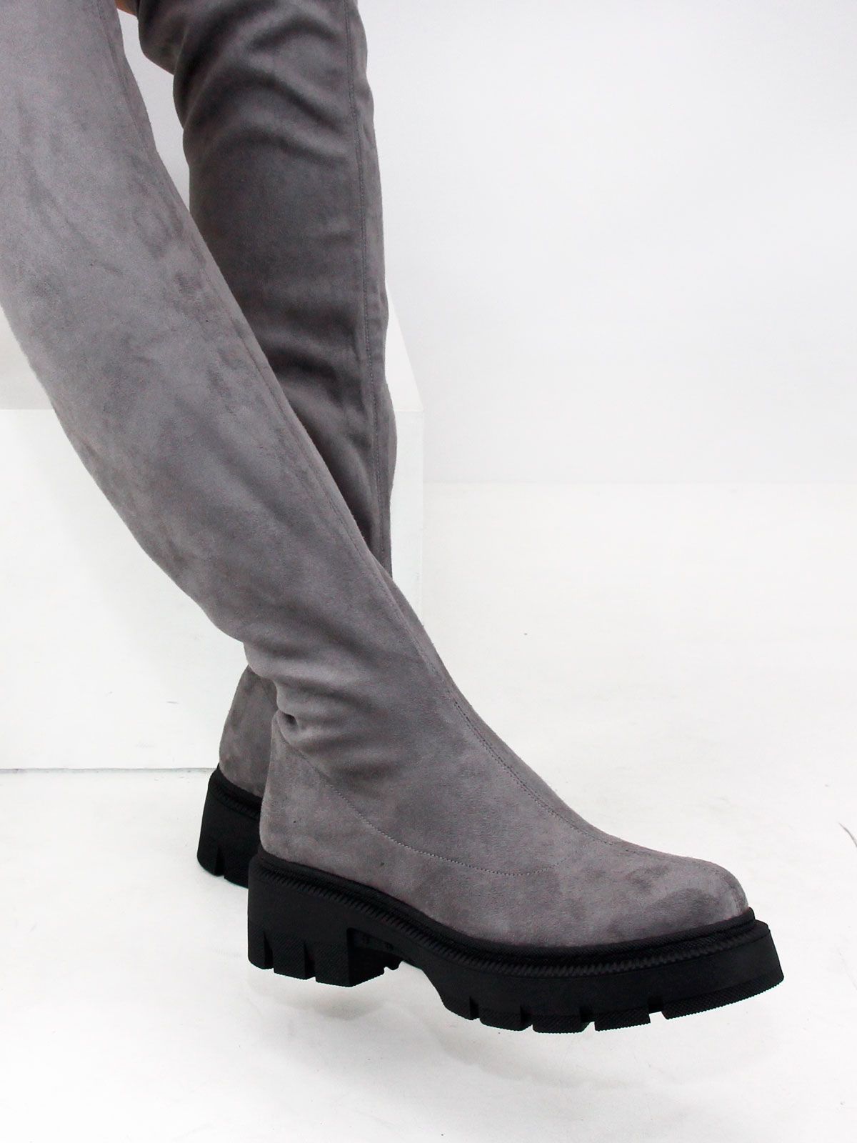 Ботфорты чулки стрейч больших размеров из замши стрейч. Высота сапог - 56 см. Объем голенища в самой верхней широкой части - 45 см. Объем в голени без натяжения -36 см. Модель утеплена байкой до щиколотки. Ботфорты очень хорошо тянутся. Подойдут на стандартную и широкую голень. Удобная нескользкая высокая тракторная подошва.