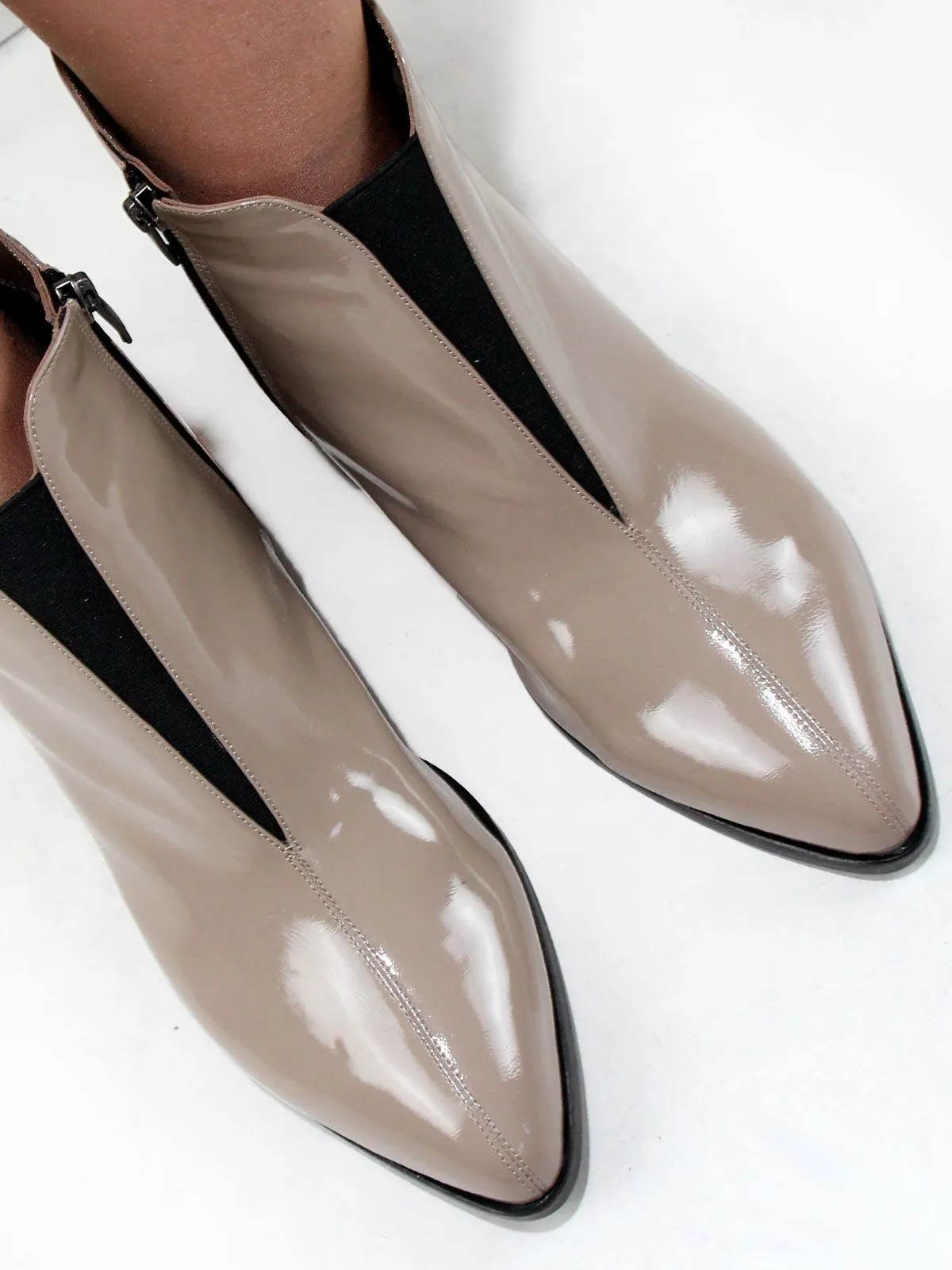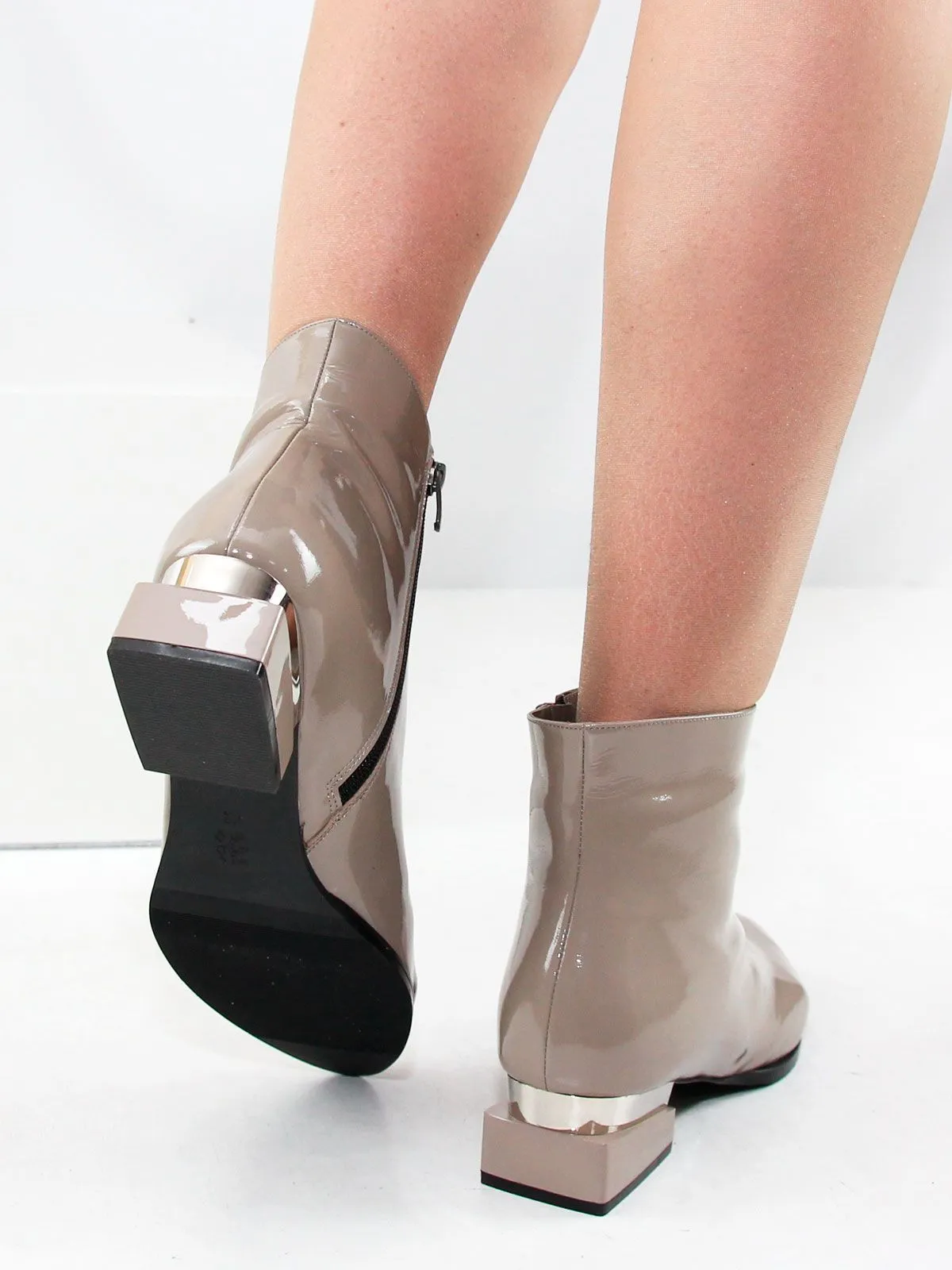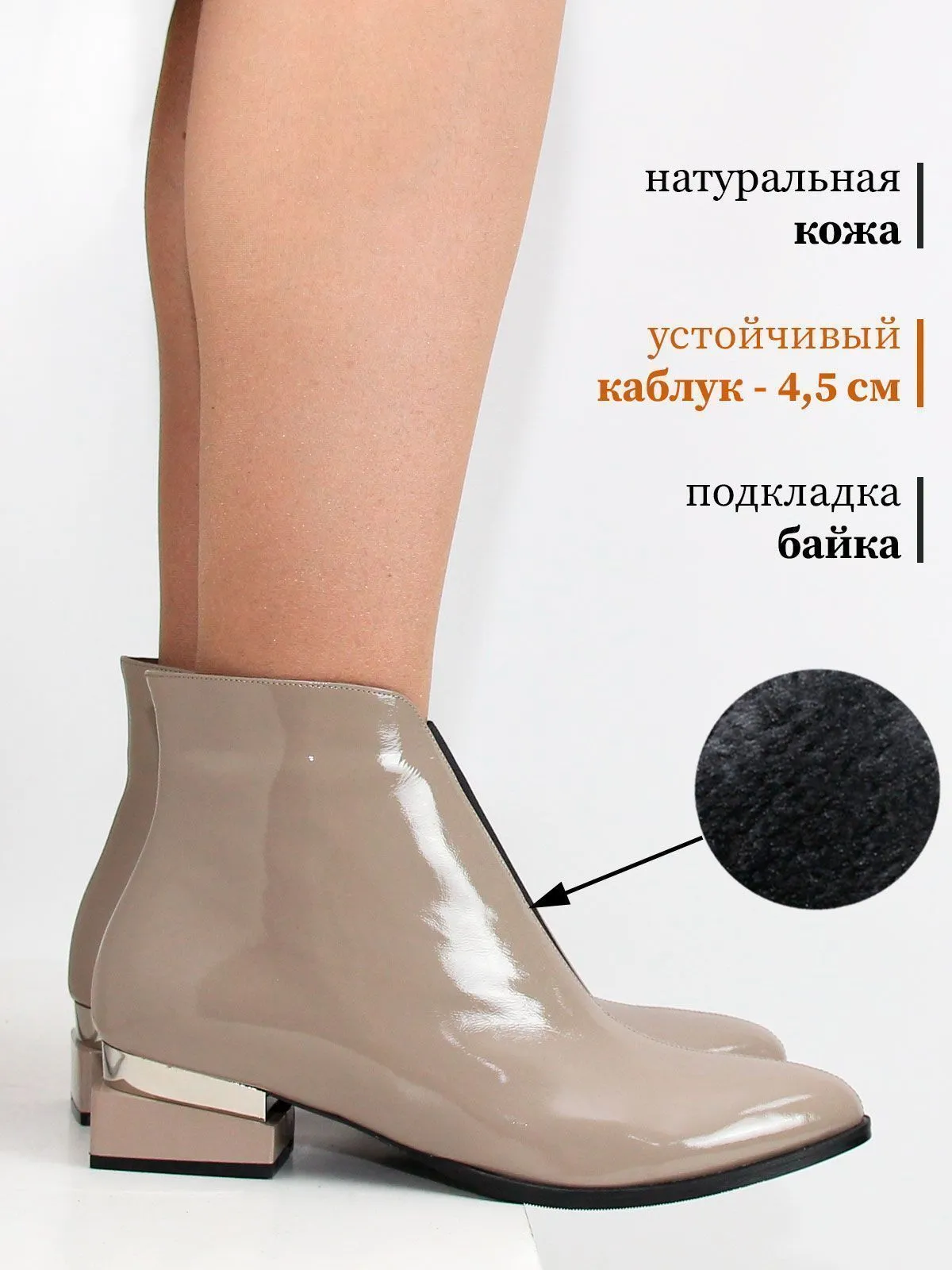 Демисезонные ботильоны большого размера на невысоком каблуке выполнены из натуральной лаковой кожи. Классические ботильоны утеплены плотной байкой. Модель подойдет на стандартную стопу.