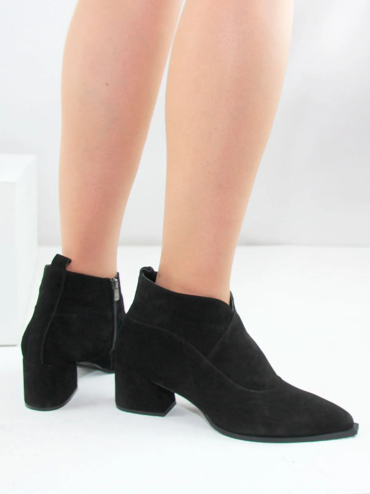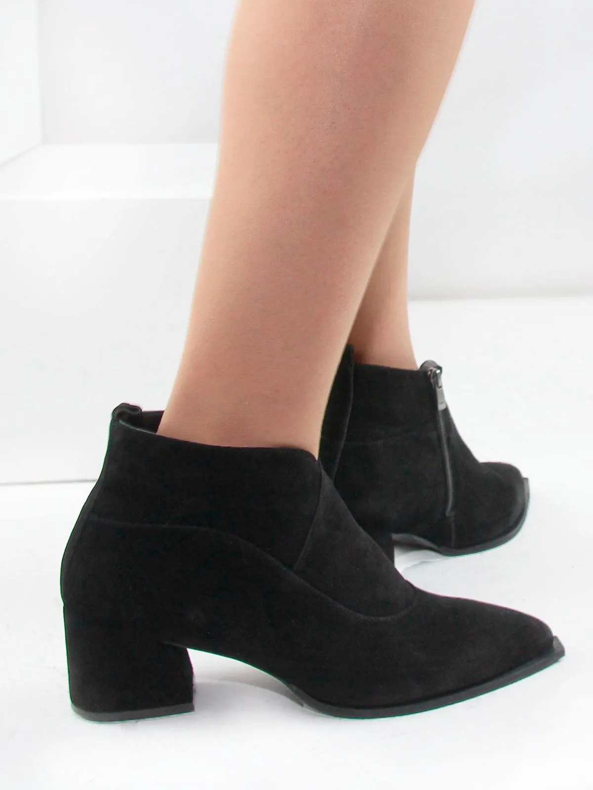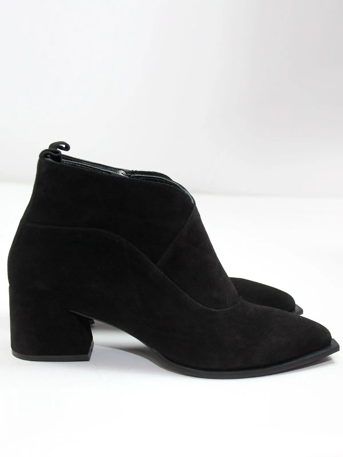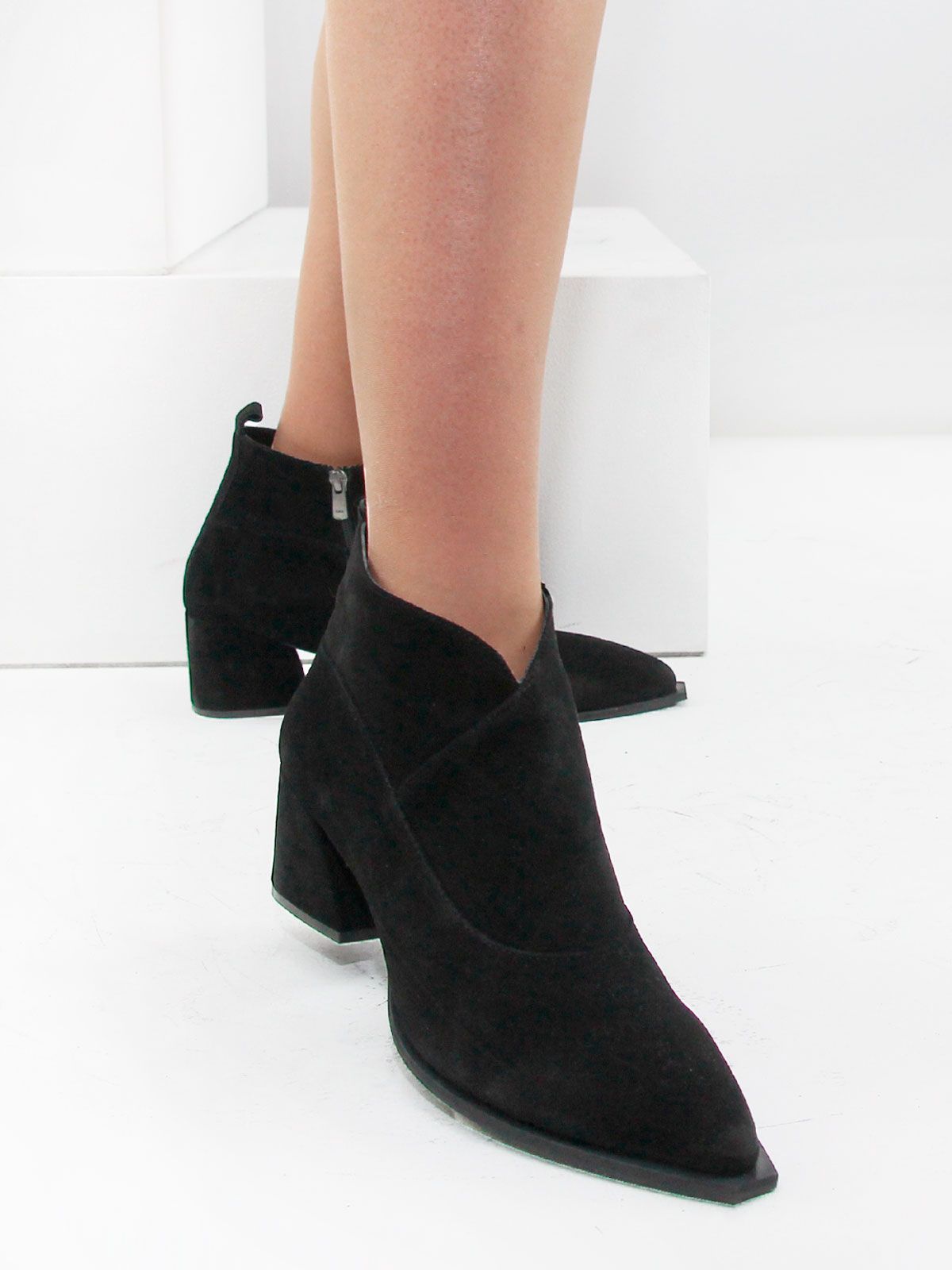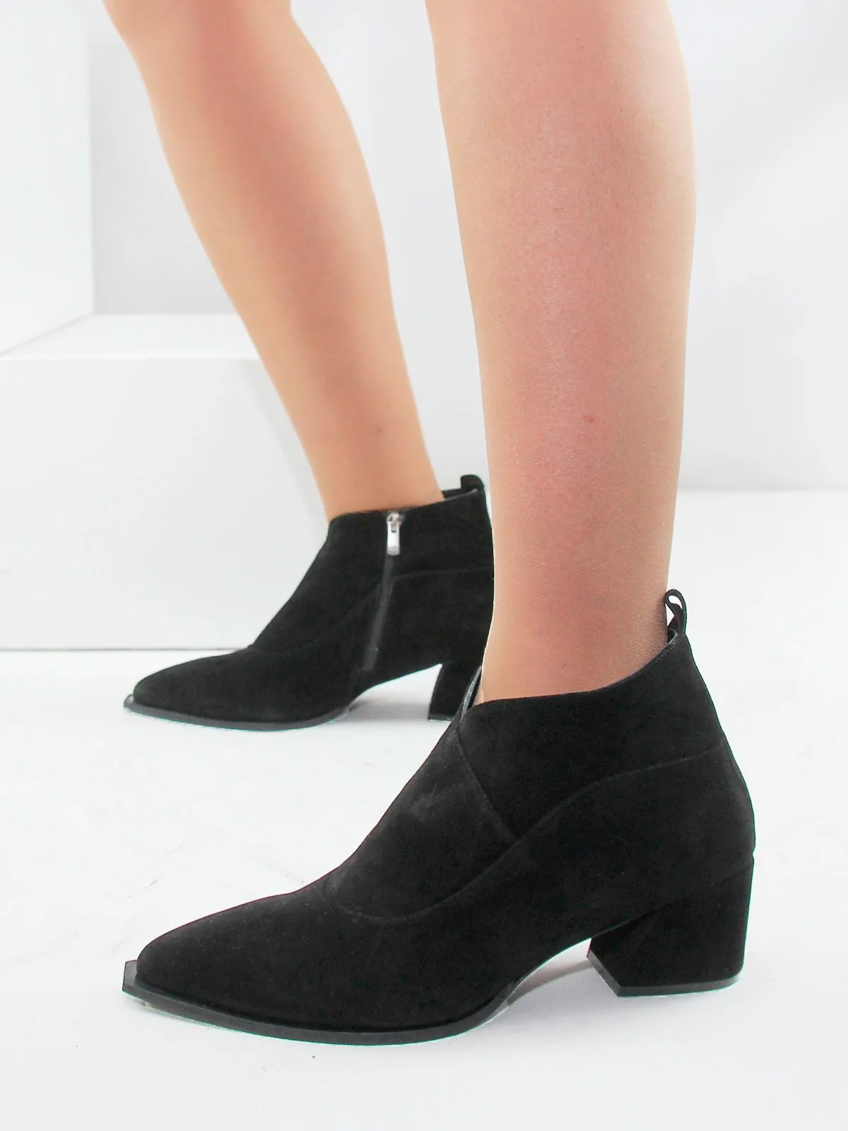 Верх выполнен из мягкой натуральной замши, а характерная подошва в стиле казаков придаёт модели выразительность, сохраняя при этом спокойный классический силуэт. Дизайн аккуратный, без лишнего декора — ботильоны легко вписываются в любой образ, от повседневного до более нарядного.
