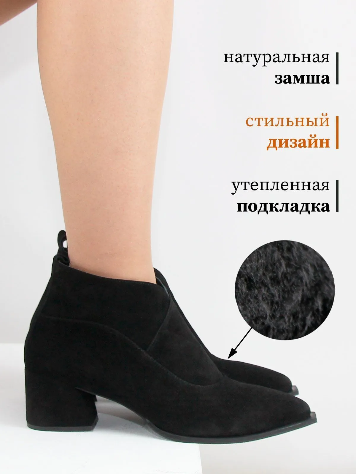 Отличный выбор для тех, кто ищет стильные, качественные и удобные женские замшевые ботильоны больших размеров с актуальной формой подошвы и универсальным чёрным цветом.