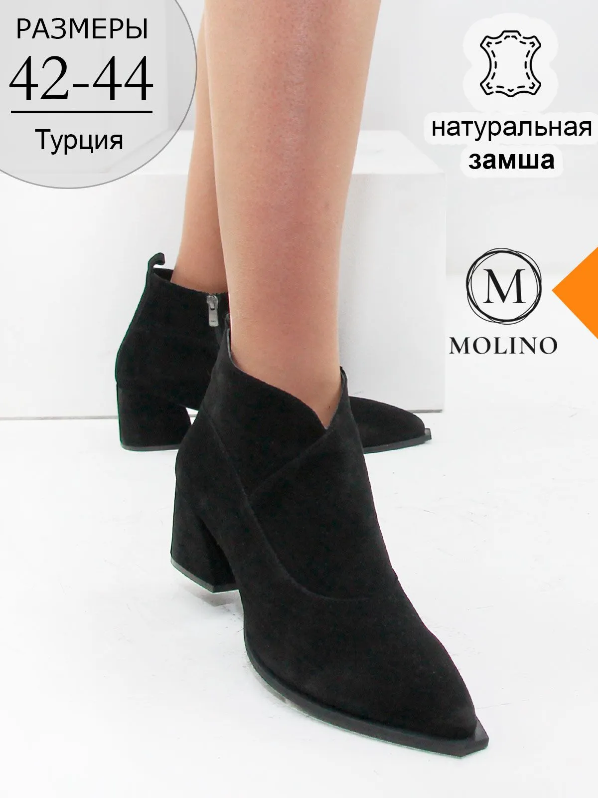 Замшевые ботильоны-казаки Molino в чёрном цвете — элегантная трендовая модель в больших размерах, созданная для тех, кто ценит комфорт и современный стиль.
