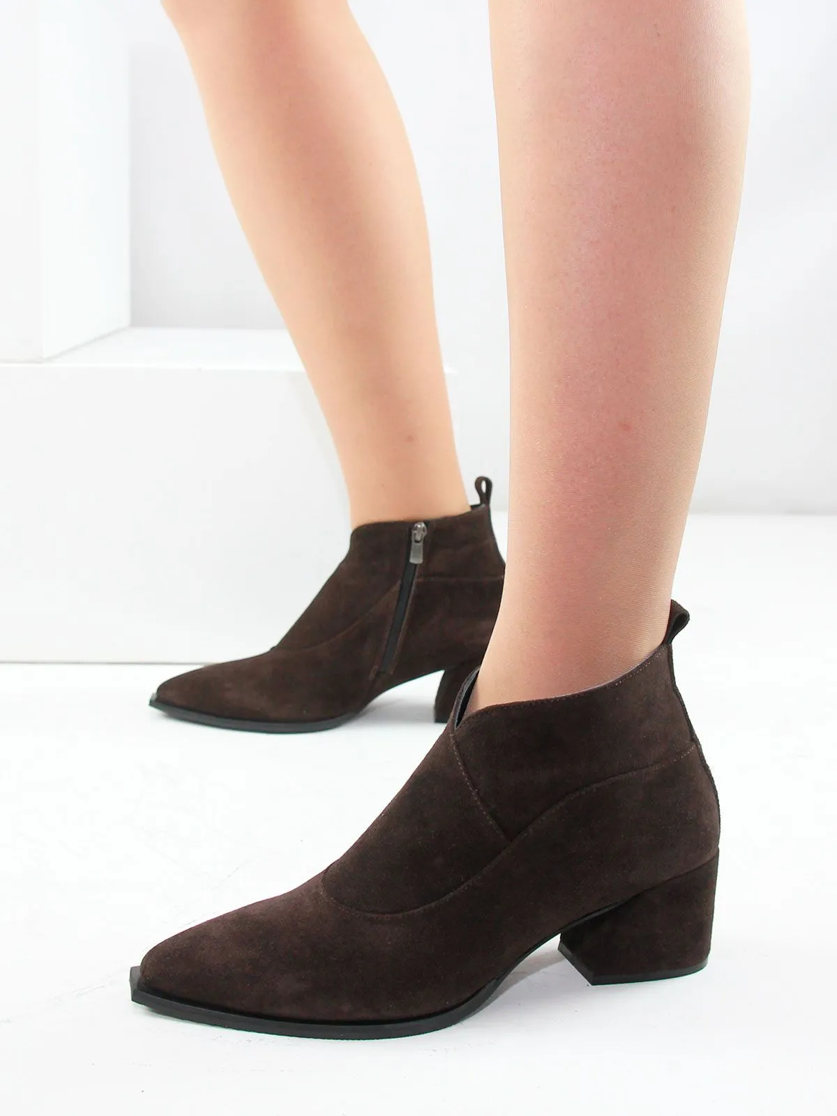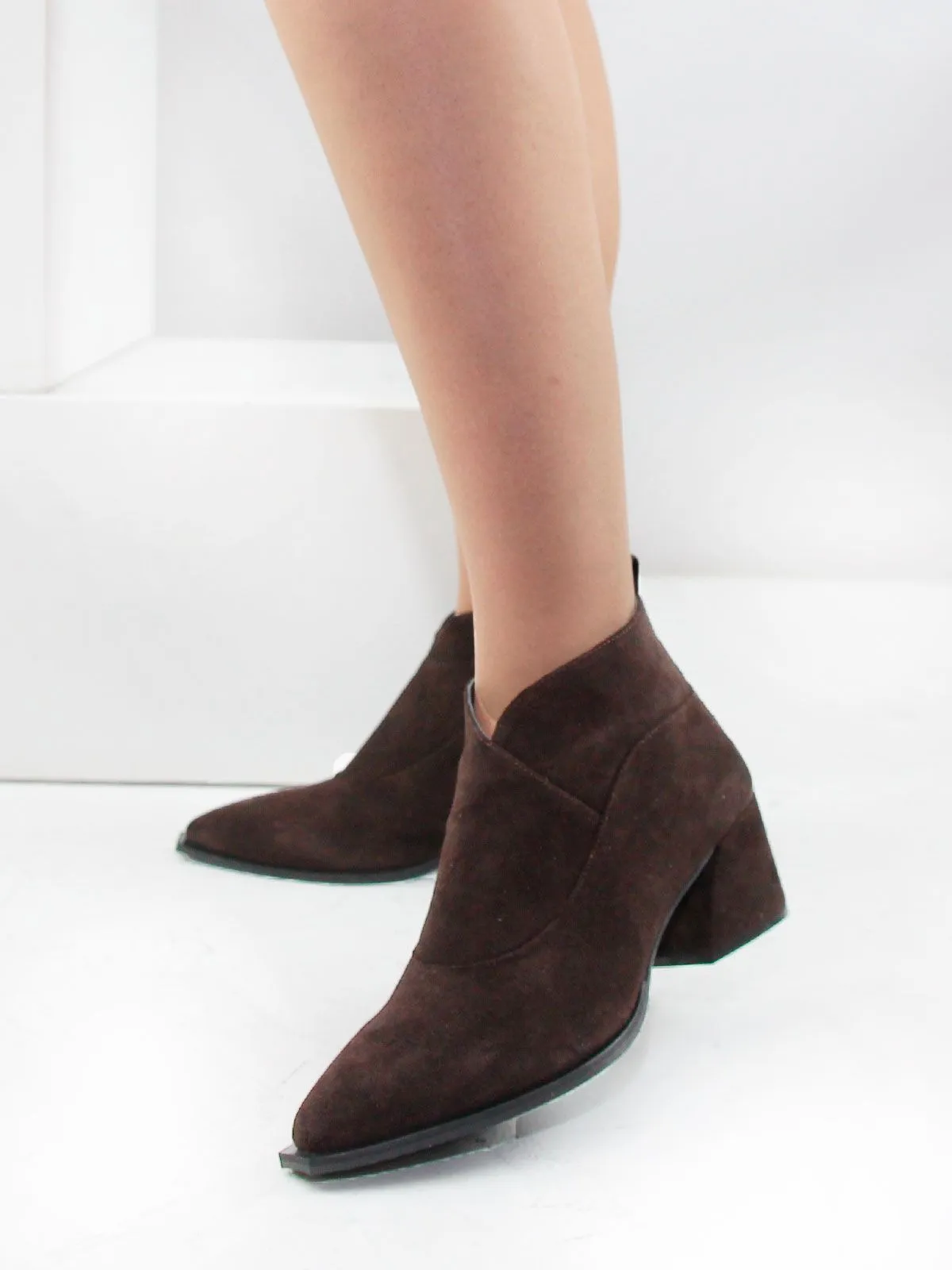 Верх выполнен из натуральной замши, а характерная подошва в стиле казаков придаёт модели выразительность, сохраняя при этом спокойный классический силуэт. Дизайн аккуратный, без лишнего декора — ботильоны легко вписываются в любой образ, от повседневного до более нарядного.