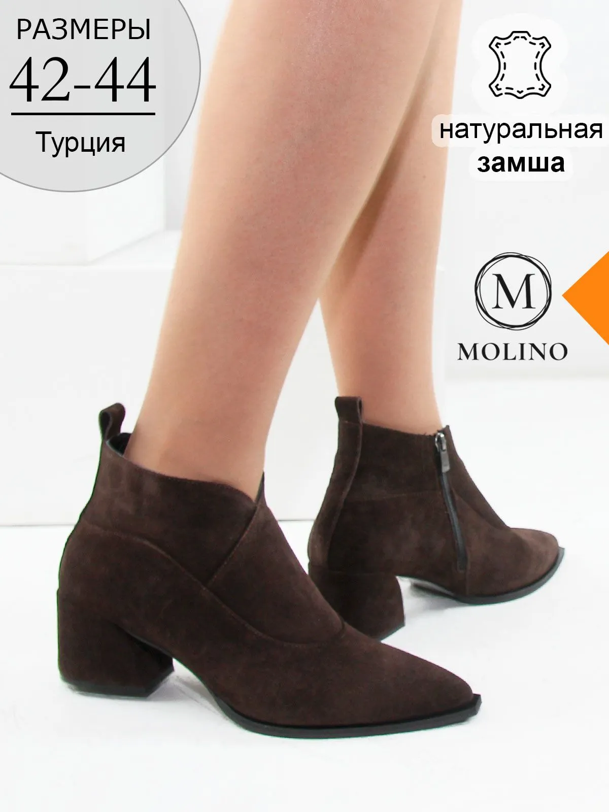 Замшевые ботильоны-казаки Molino в коричневом цвете — элегантная трендовая модель в больших размерах, созданная для тех, кто ценит комфорт и современный стиль.