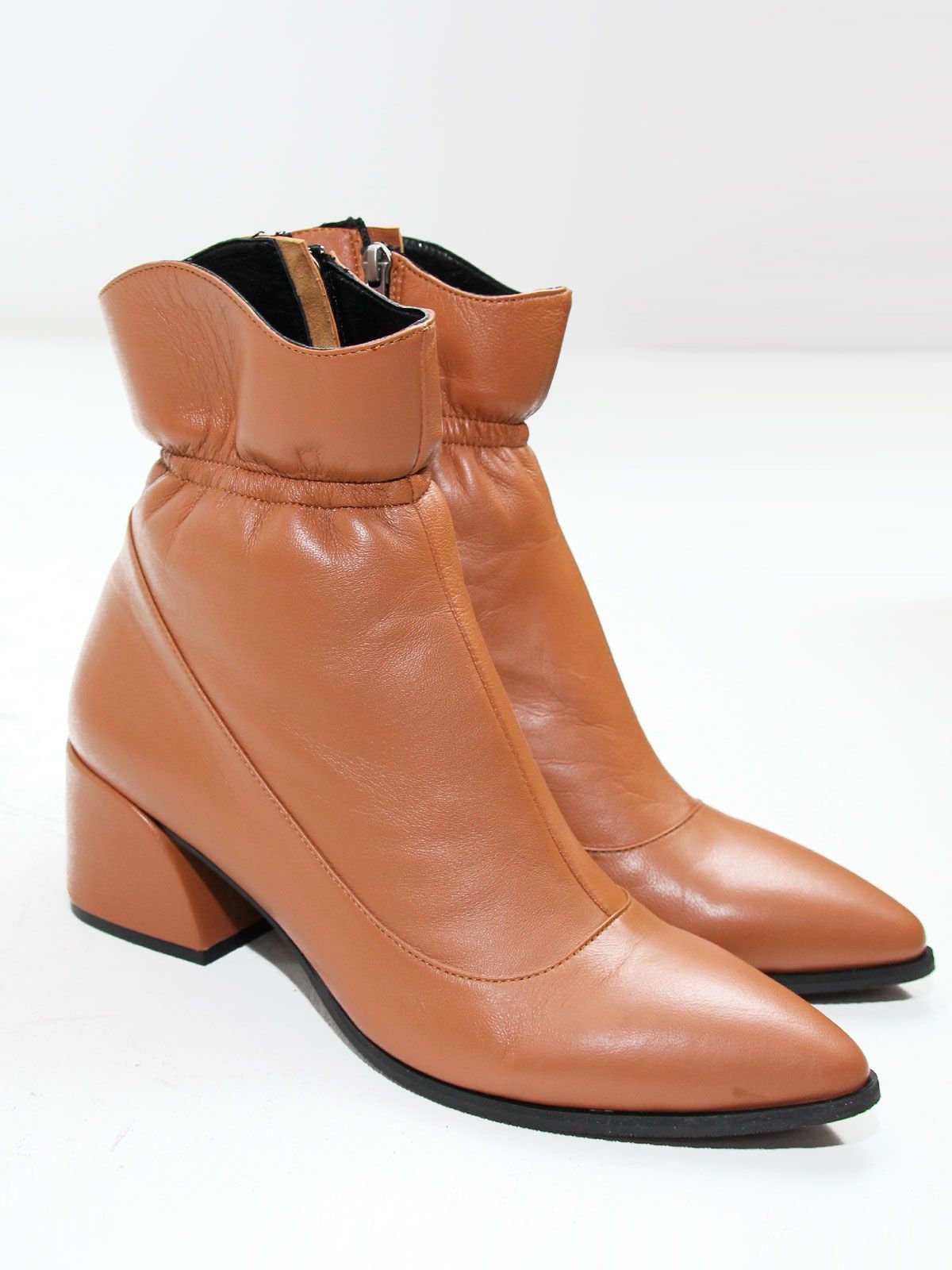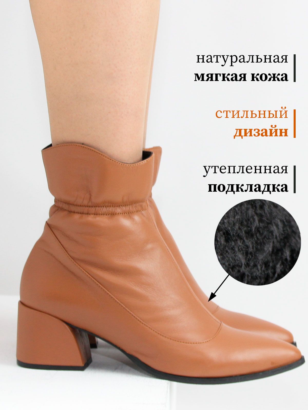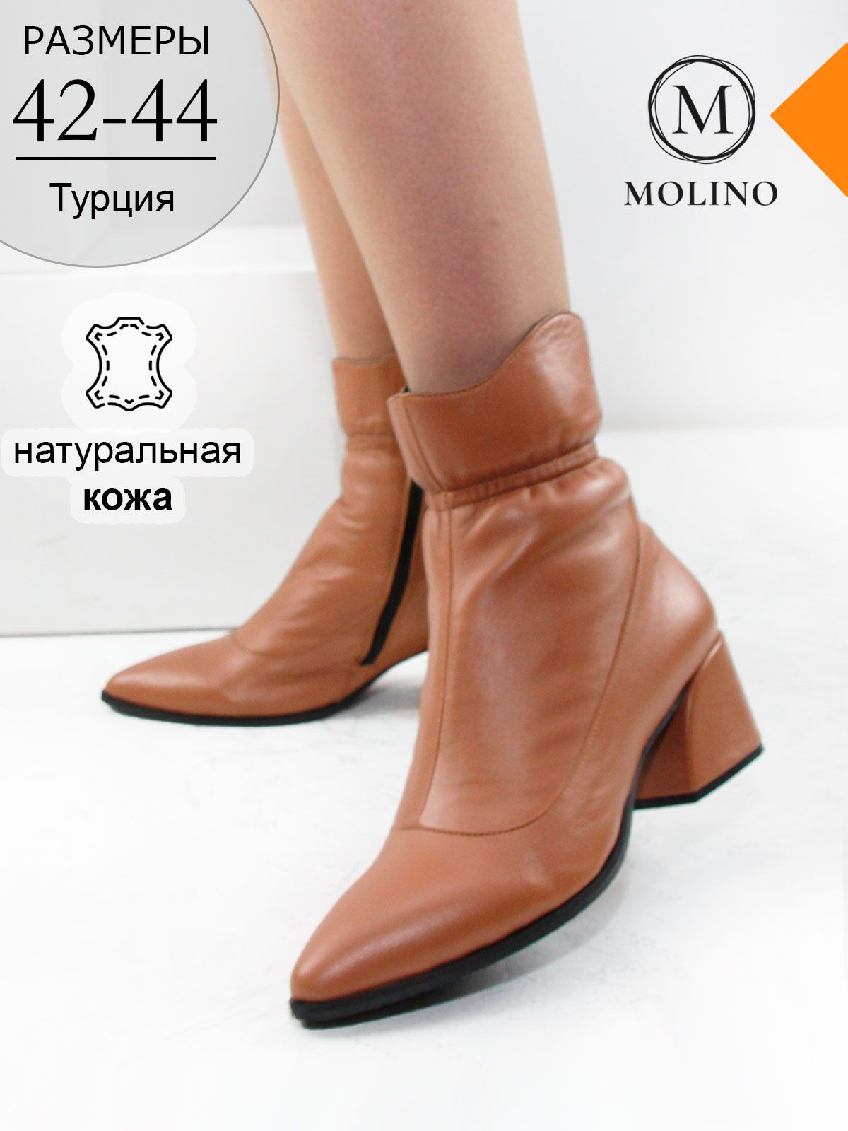 Идеальные универсальные женские ботильоны больших размеров из натуральной гладкой, очень мягкой кожи свело-коричневого цвета. Демисезонные ботильоны на каблуке утеплены байкой. Сбоку застежка – молния. Элегантный дизайн делает обувь очень стильной и эффектной