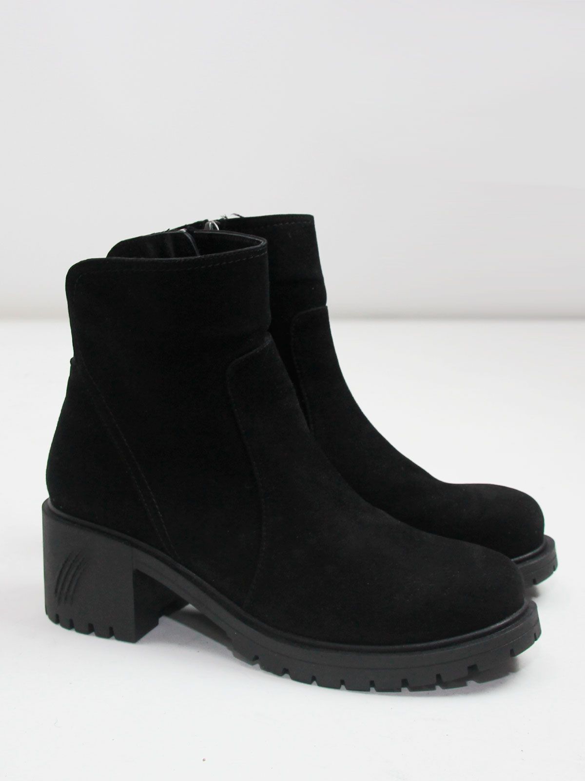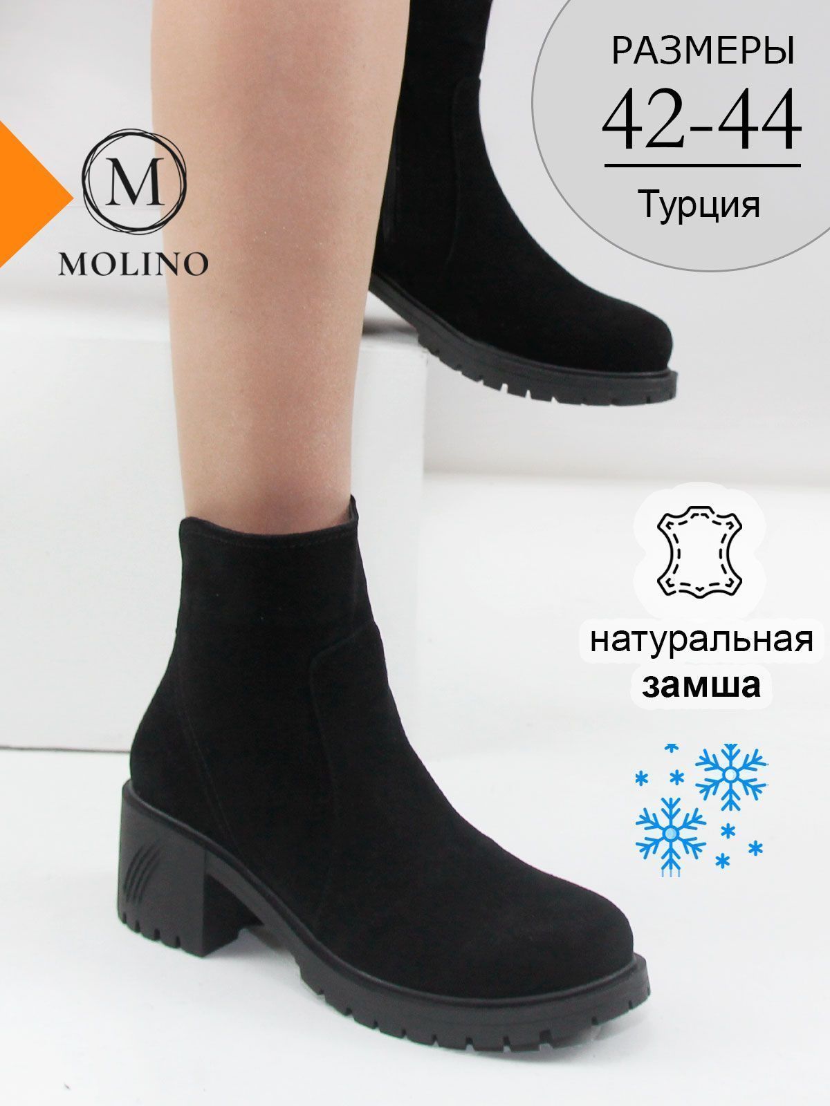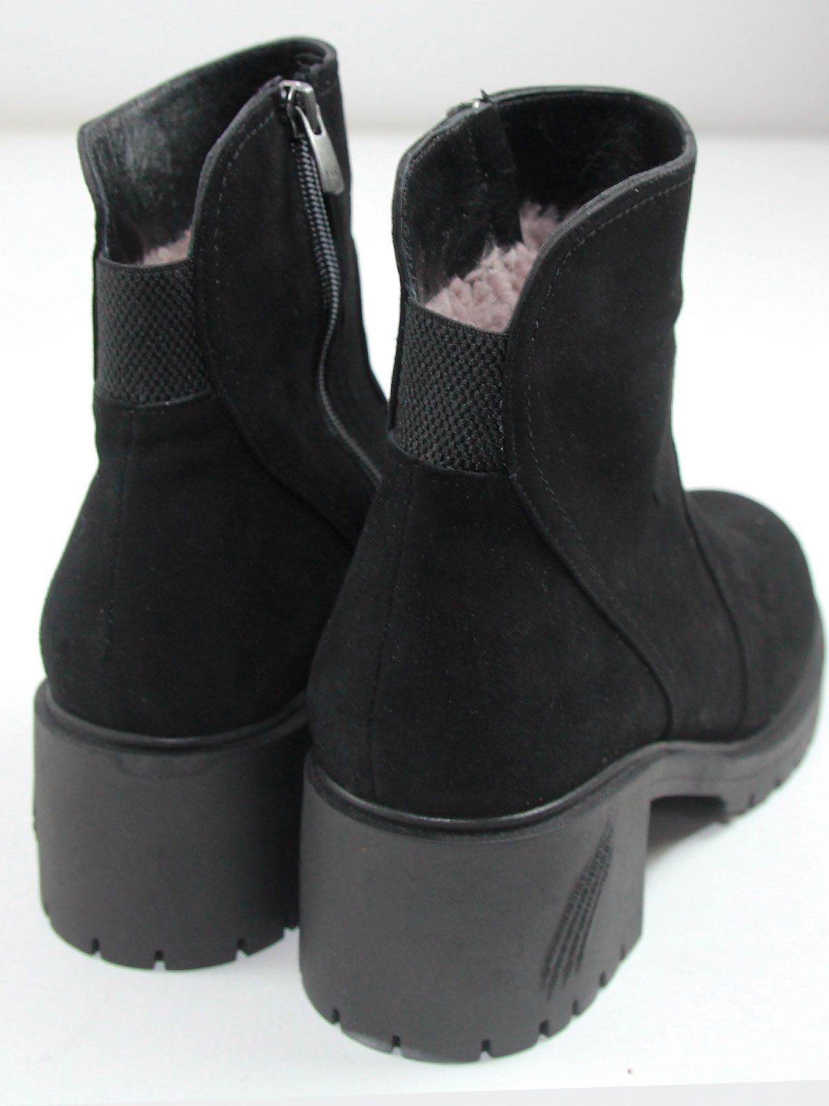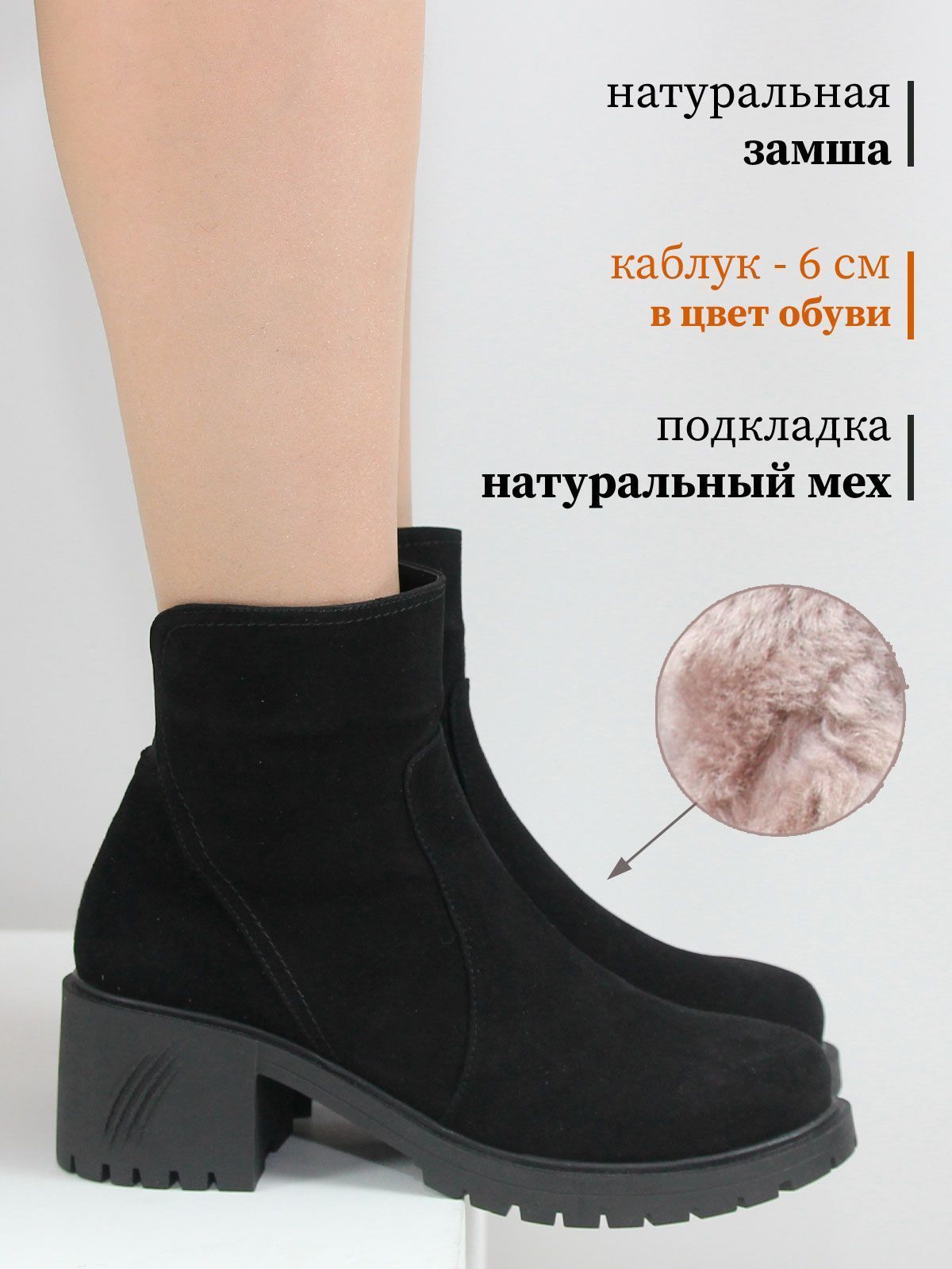 Ботильоны большого размера на широком, устойчивом каблуке. Подкладка - натуральный мех. Ботильоны выполнены из натуральной замши черного цвета без дополнительных декоративных элементов. Сбоку - застежка молния.