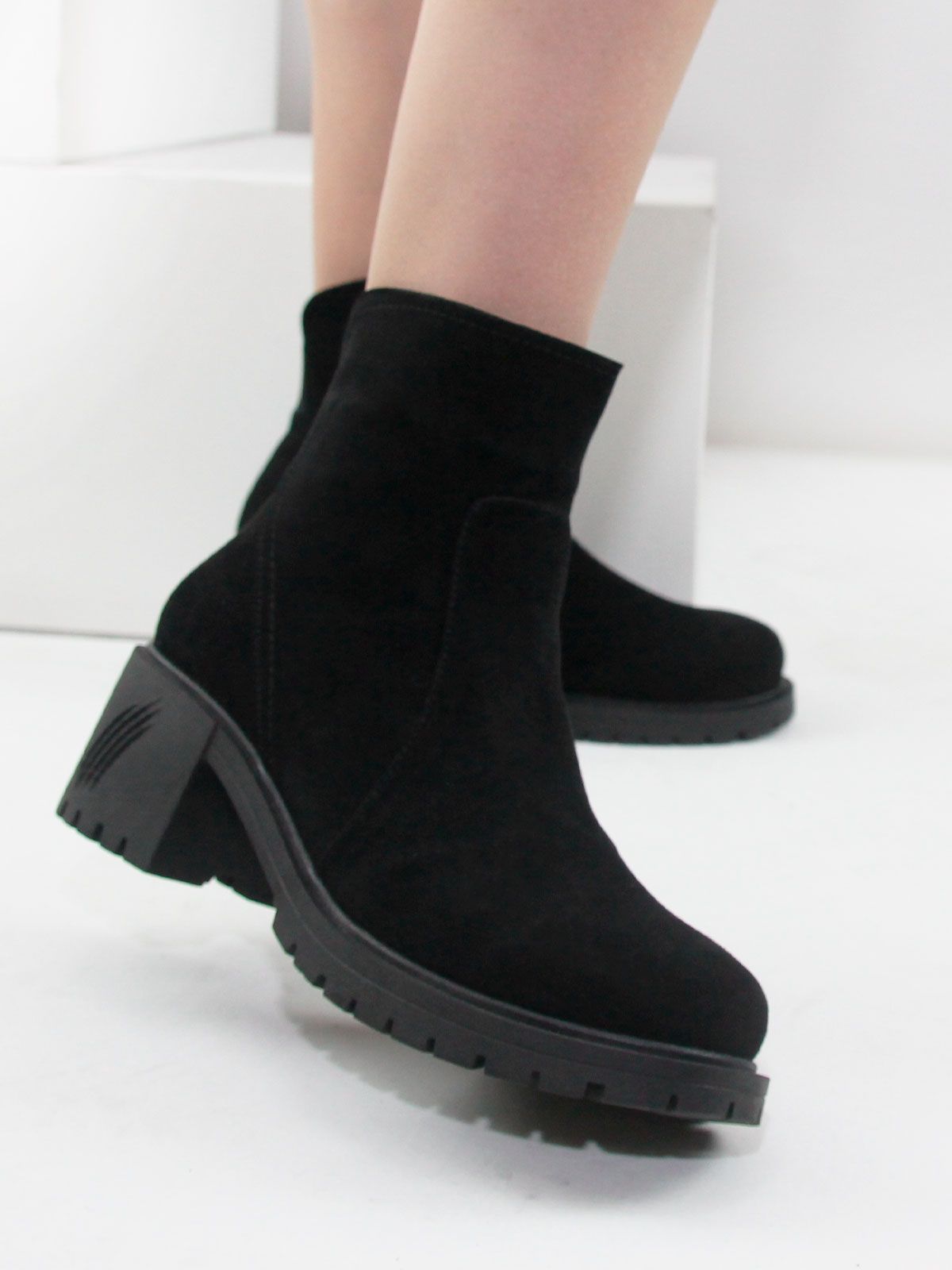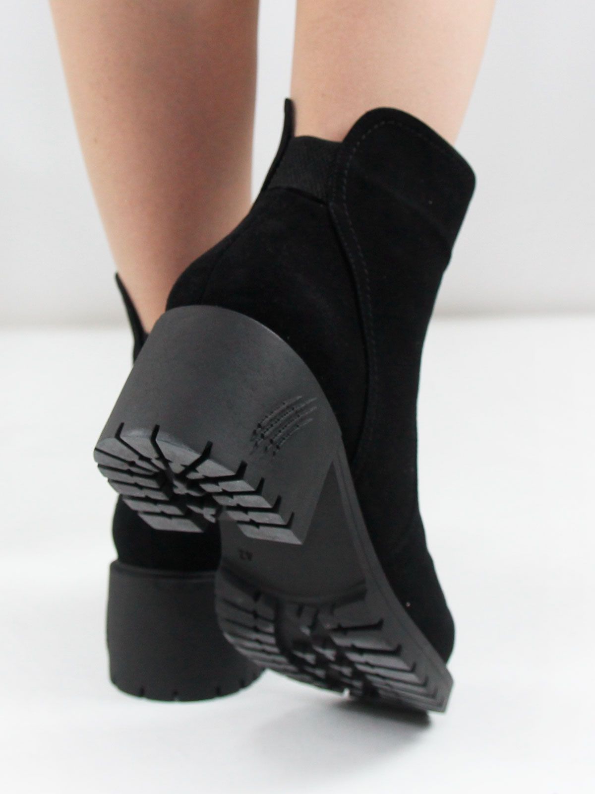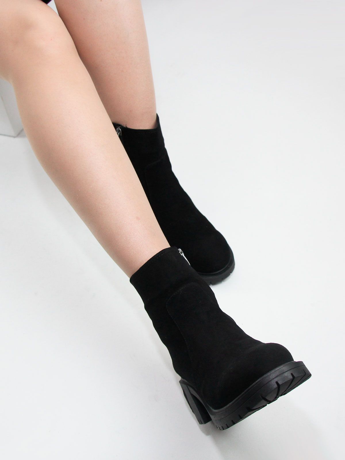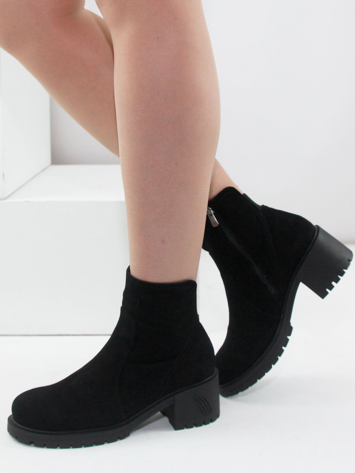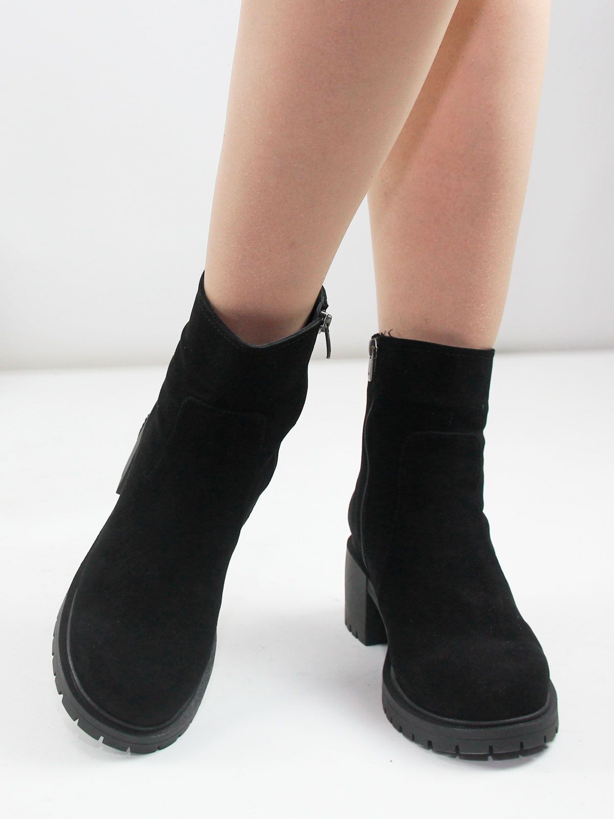 Ботильоны большого размера на широком, устойчивом каблуке. Подкладка - натуральный мех. Ботильоны выполнены из натуральной замши черного цвета без дополнительных декоративных элементов. Сбоку - застежка молния.