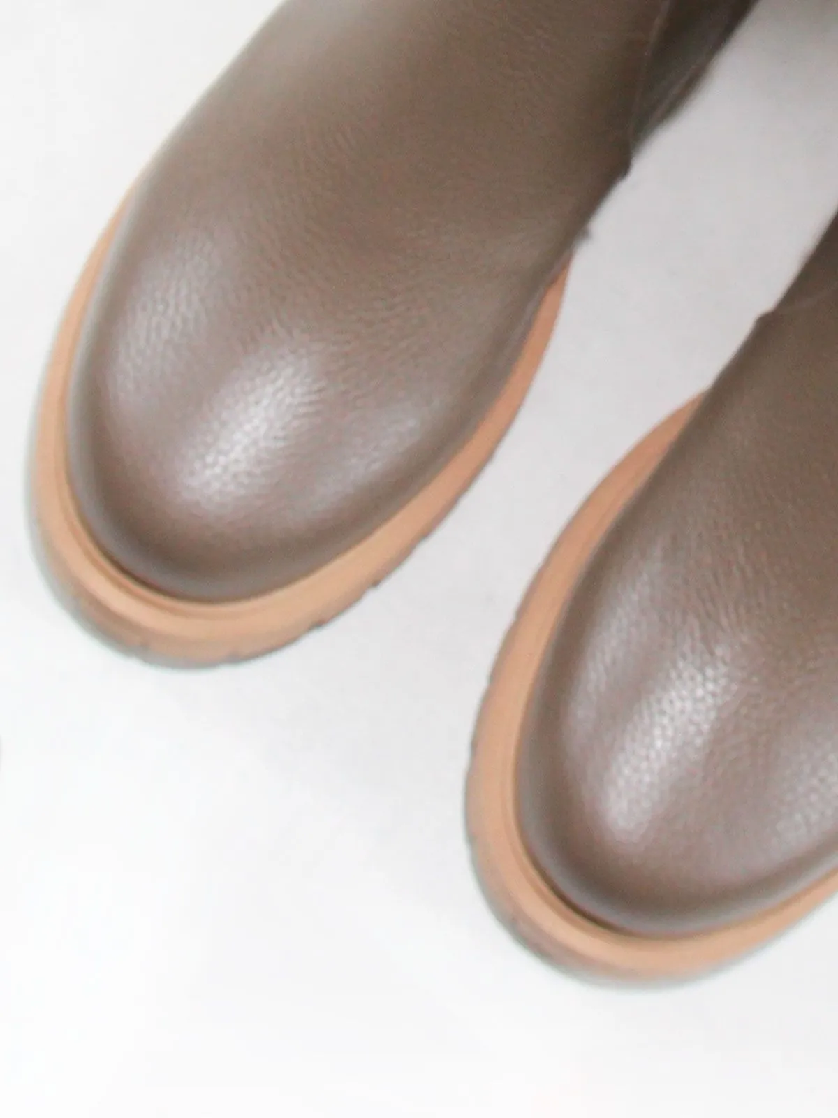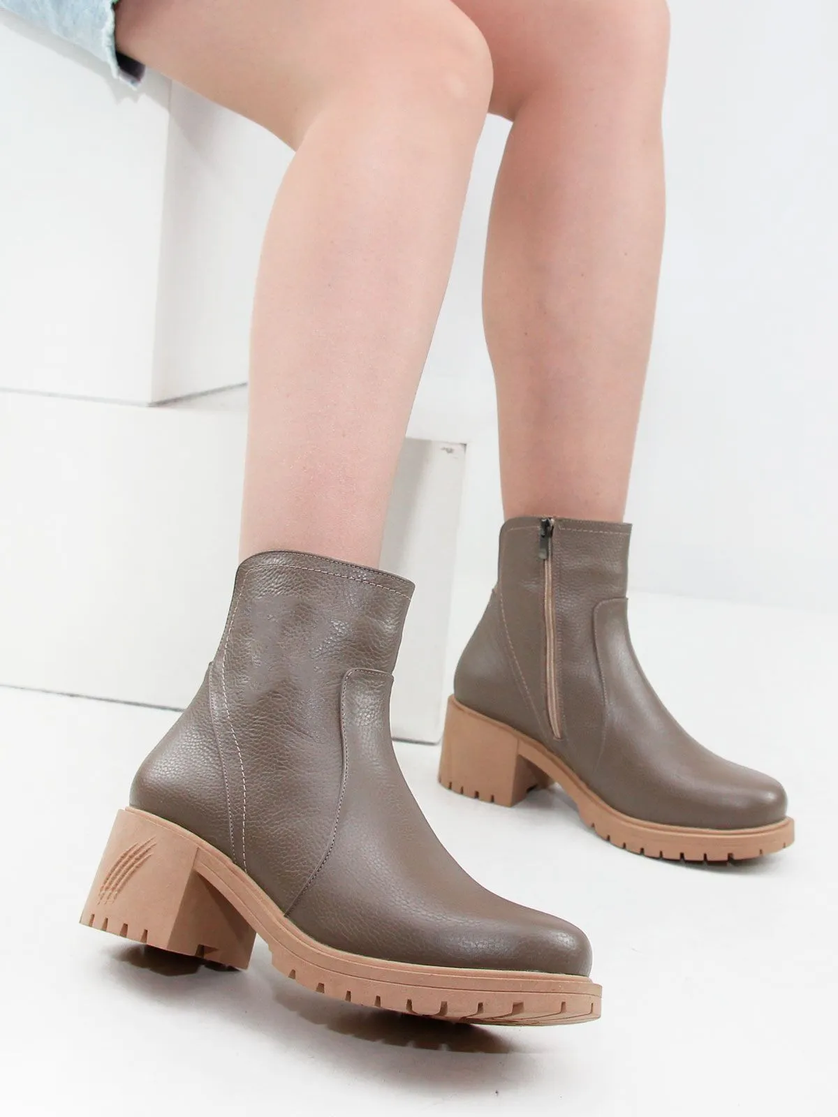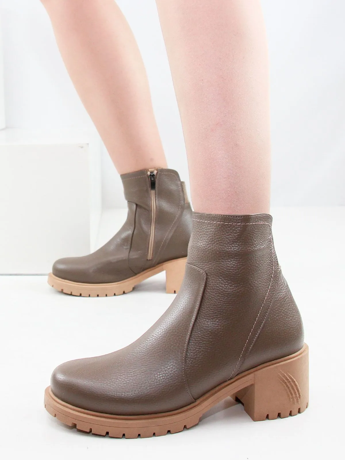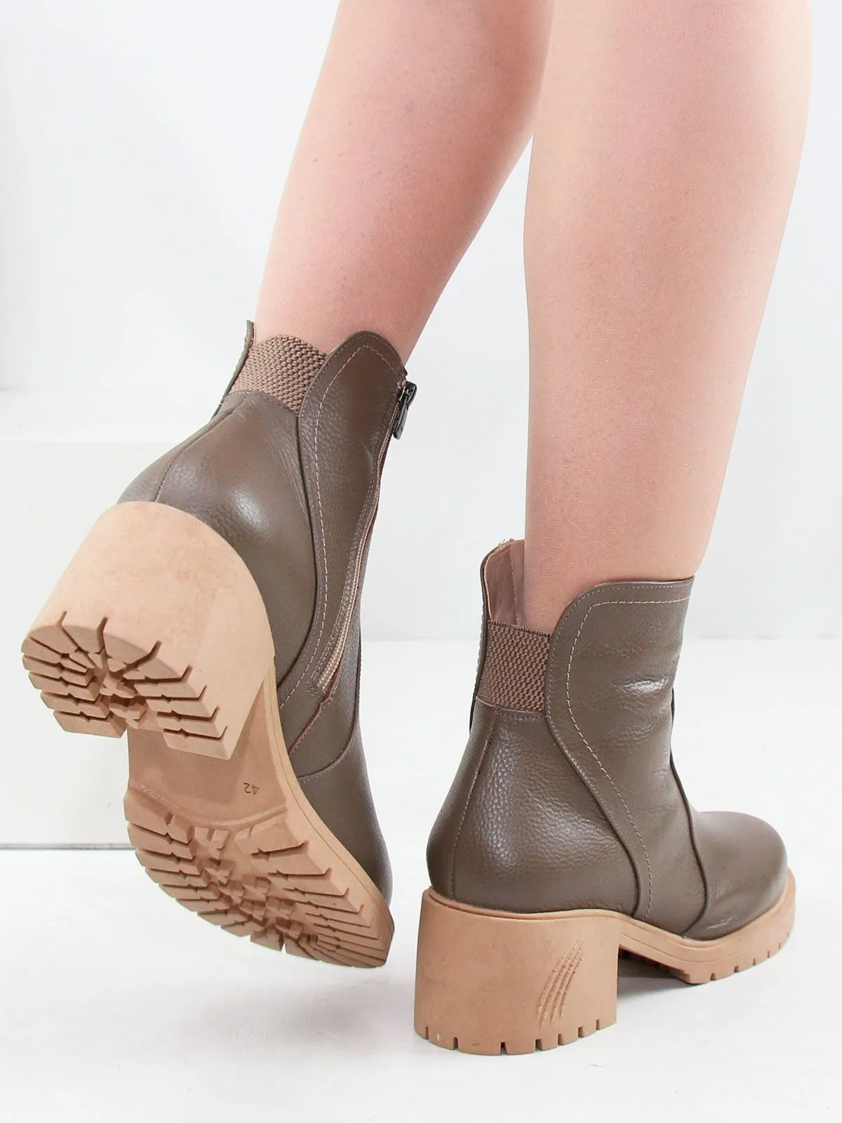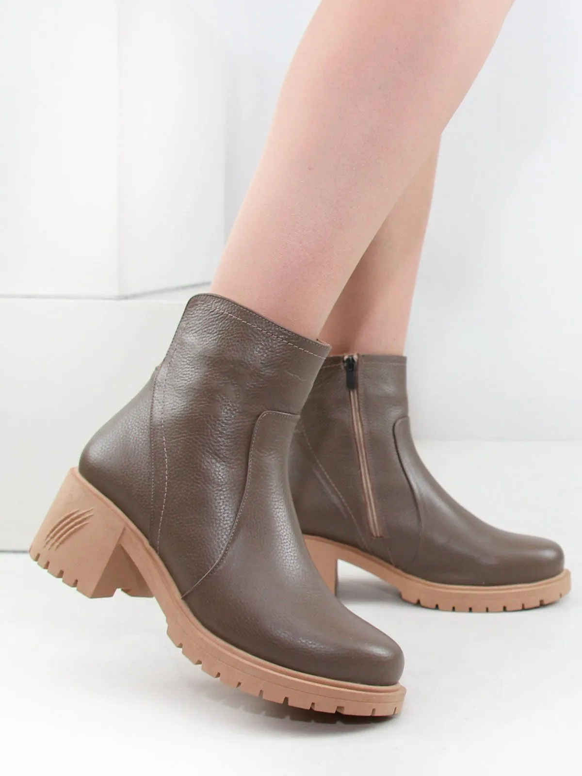 Ботильоны зимние большого размера на широком, устойчивом каблуке. Подкладка - натуральный мех. Ботильоны выполнены из натуральной кожи коричневого цвета без дополнительных декоративных элементов. Нескользящая резиновая подошва, округлый мыс. Сбоку - застежка молния. Сзади вставка-резинка для регулирования объема. Ширина без натяжения - 3,5 см, максимальное растяжение - до 5 см.
