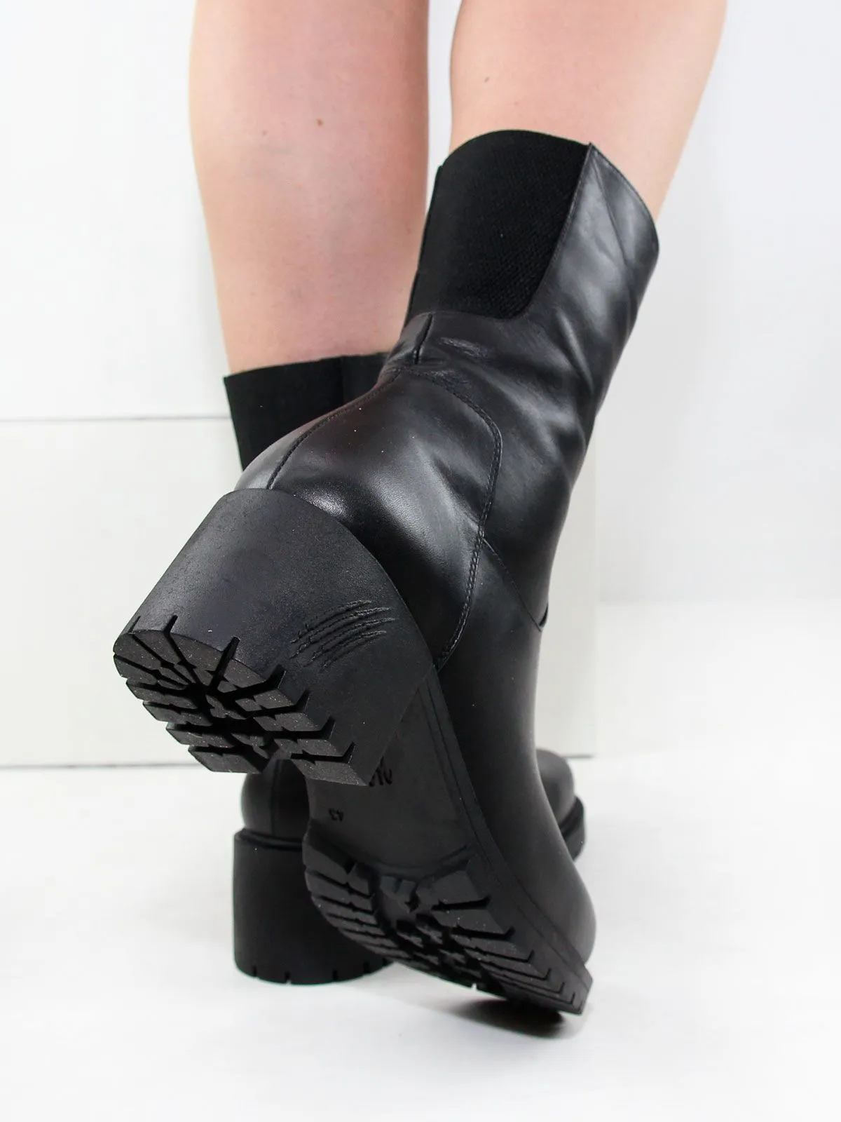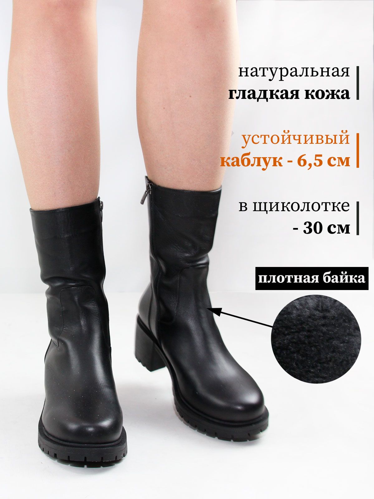 Ботильоны высокие демисезонные большого размера на широком, устойчивом каблуке. Подкладка - плотная байка по всей высоте. Ботильоны выполнены из натуральной кожи черного цвета без дополнительных декоративных элементов. Нескользящая резиновая подошва, округлый мыс. Сбоку - застежка молния.Сзади вставка-резинка для регулирования объема. Ширина резинки по верхней части без натяжения - 7 см, максимальное растяжение - до 9 см. Обхват ботинок в самой верхней части - 30 см, высота -22 см без учета каблука. Нестользящая рельефная резиновая подошва.