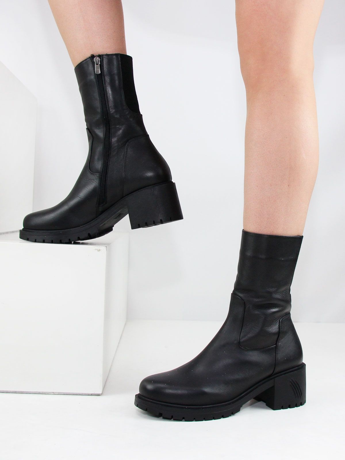 Ботильоны высокие зимние большого размера на широком, устойчивом каблуке. Подкладка - натуральный мех по всей высоте. Ботильоны выполнены из натуральной кожи черного цвета без дополнительных декоративных элементов. Нескользящая резиновая подошва, округлый мыс. Сбоку - застежка молния.Сзади вставка-резинка для регулирования объема. Ширина резинки по верхней части без натяжения - 7 см, максимальное растяжение - до 9 см. Обхват ботинок в самой верхней части - 30 см, высота -22 см без учета каблука. Нестользящая рельефная резиновая подошва.