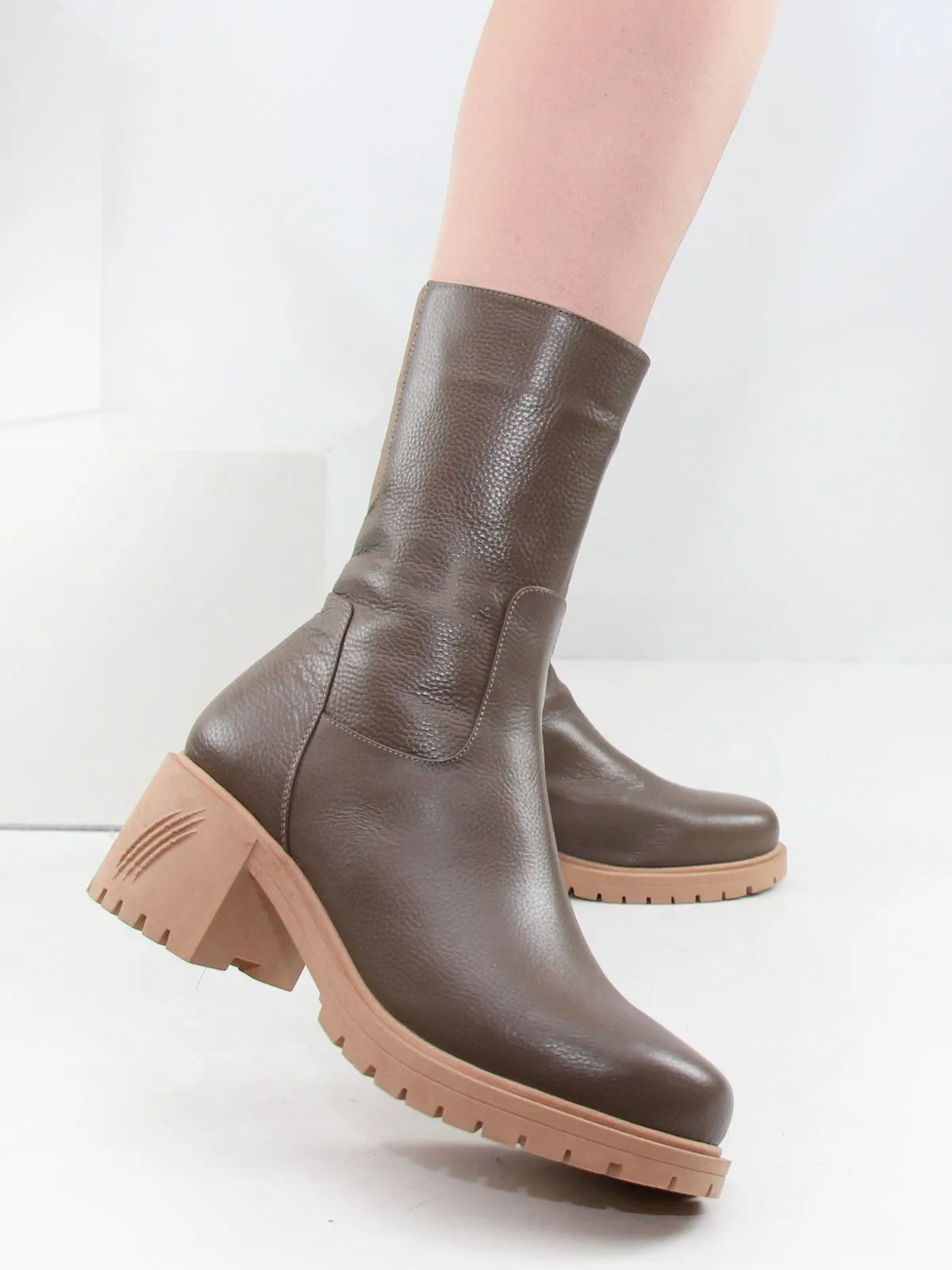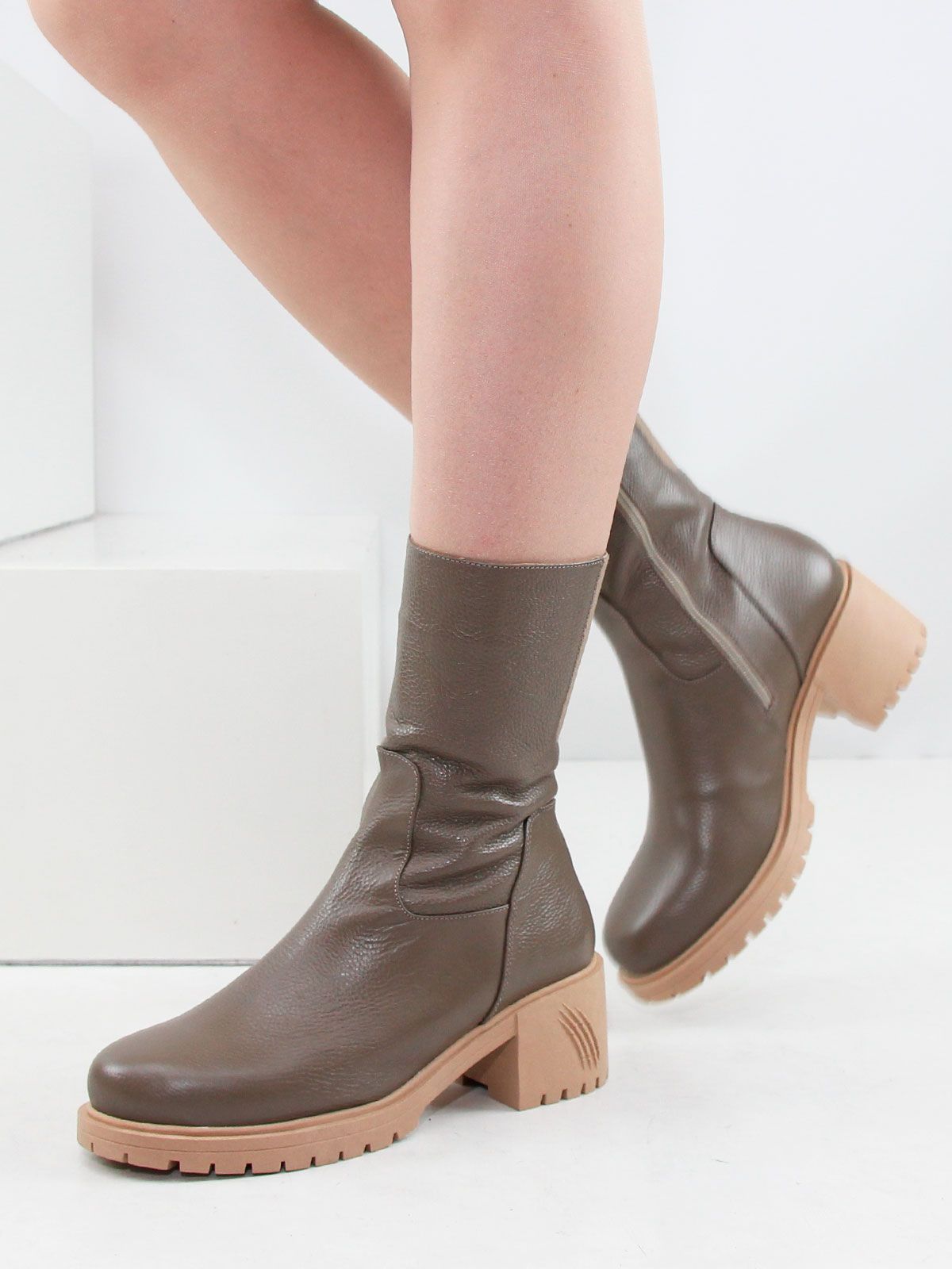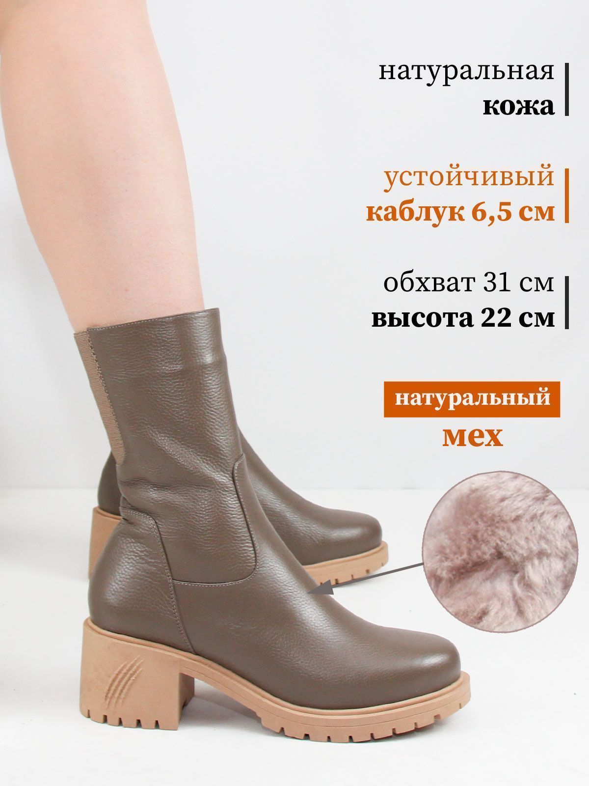 Ботильоны высокие зимние большого размера на широком, устойчивом каблуке. Подкладка - натуральный мех по всей высоте. Ботильоны выполнены из натуральной кожи коричневого цвета без дополнительных декоративных элементов. Нескользящая резиновая подошва, округлый мыс. Сбоку - застежка молния. Сзади вставка-резинка для регулирования объема. Ширина резинки по верхней части без натяжения - 7 см, максимальное растяжение - до 9 см. Обхват ботинок в самой верхней части - 31 см, высота - 22 см без учета каблука. Нестользящая рельефная резиновая подошва.