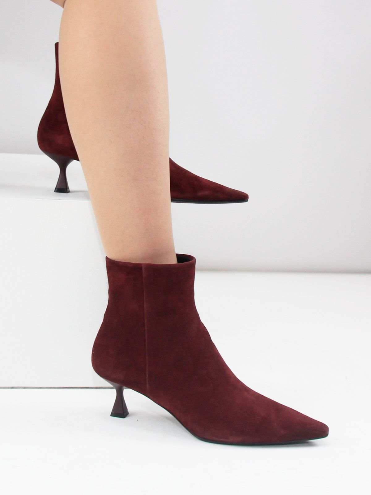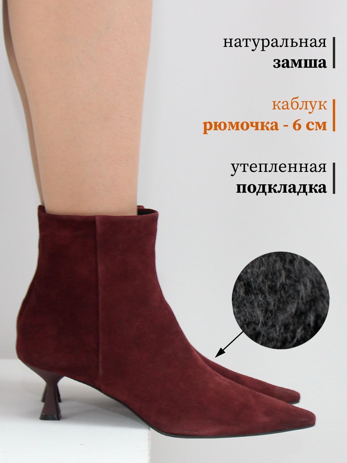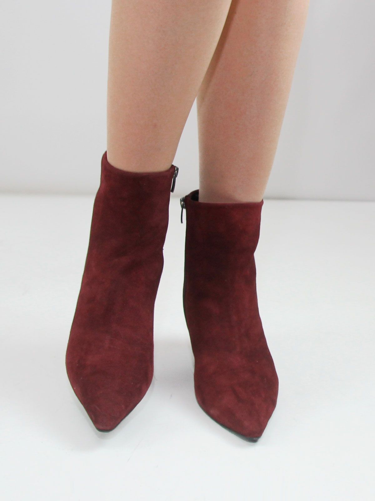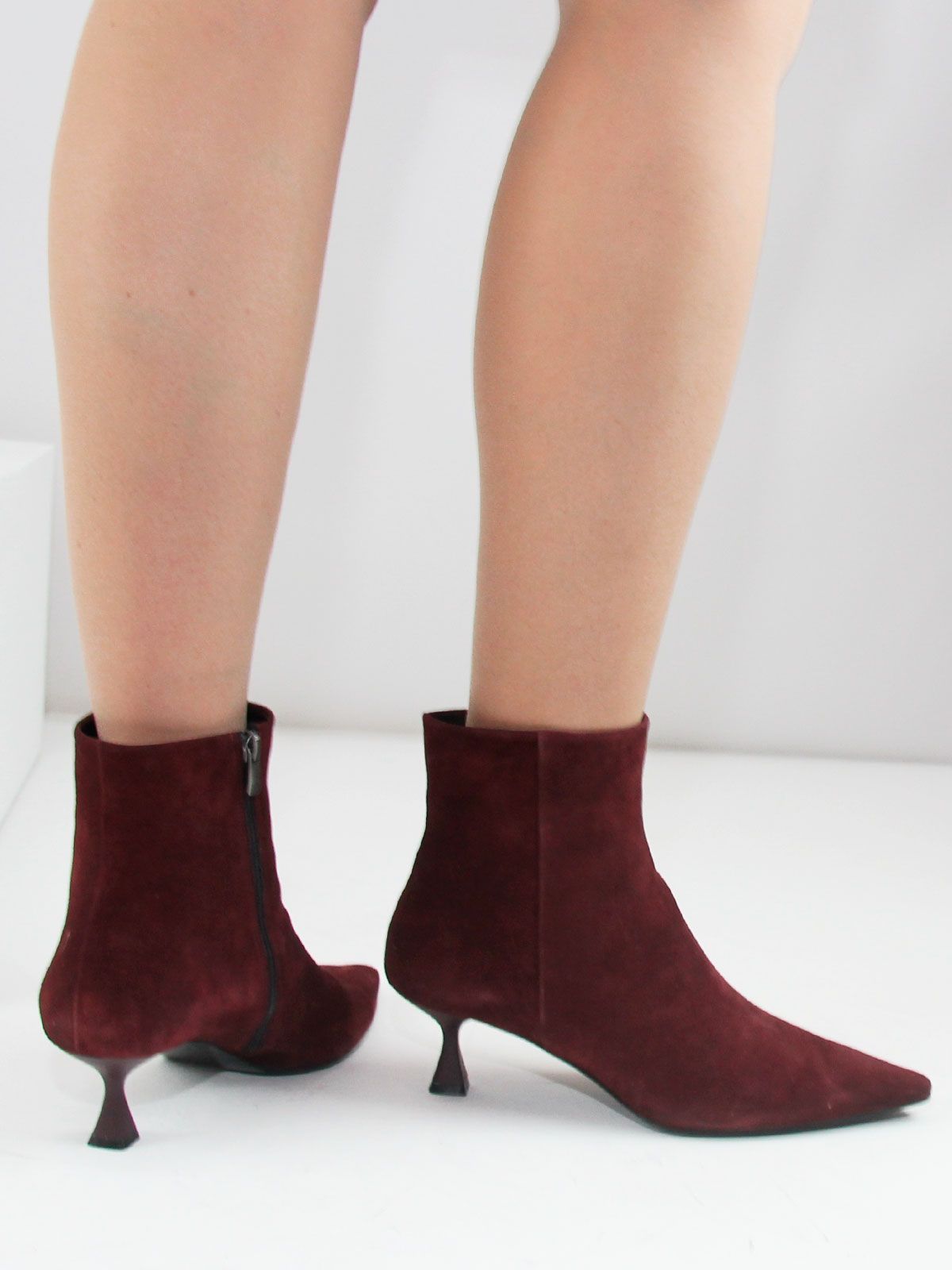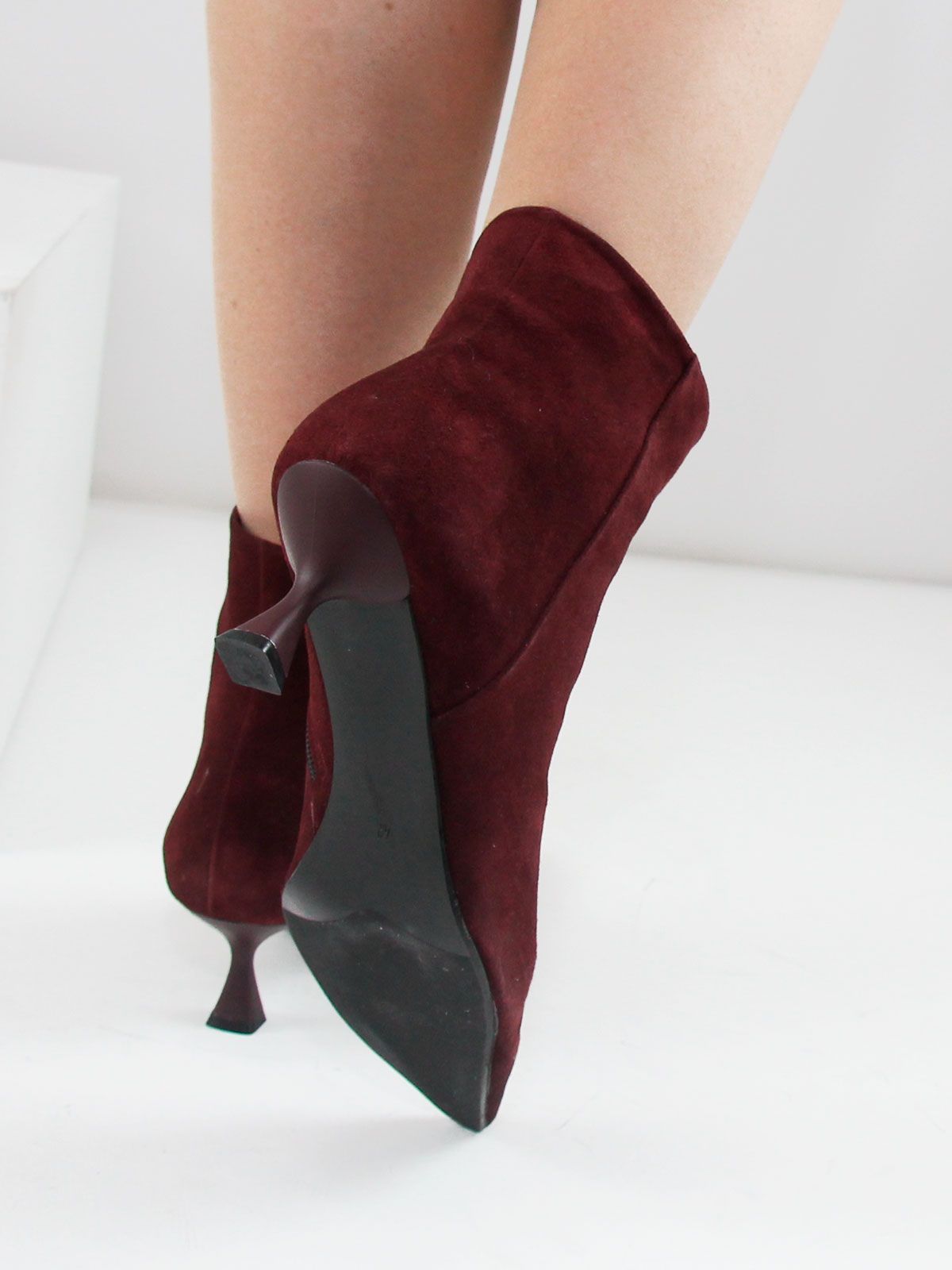 Изящные ботильоны на шпильке из натуральной замши в насыщенном тёмно-бордовом оттенке.