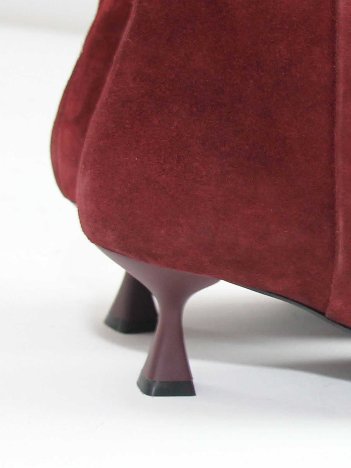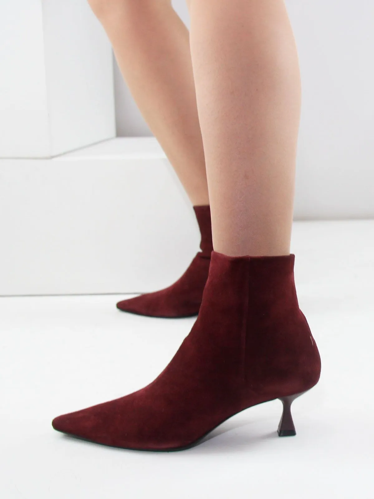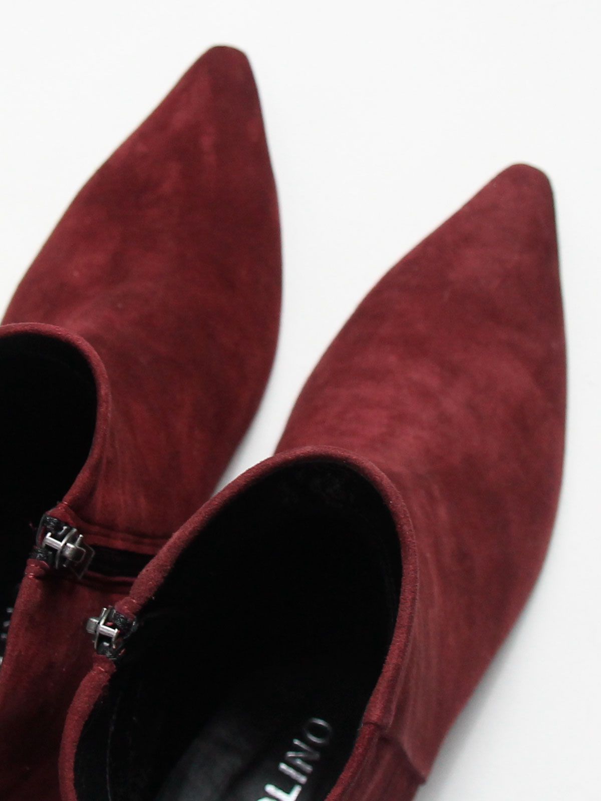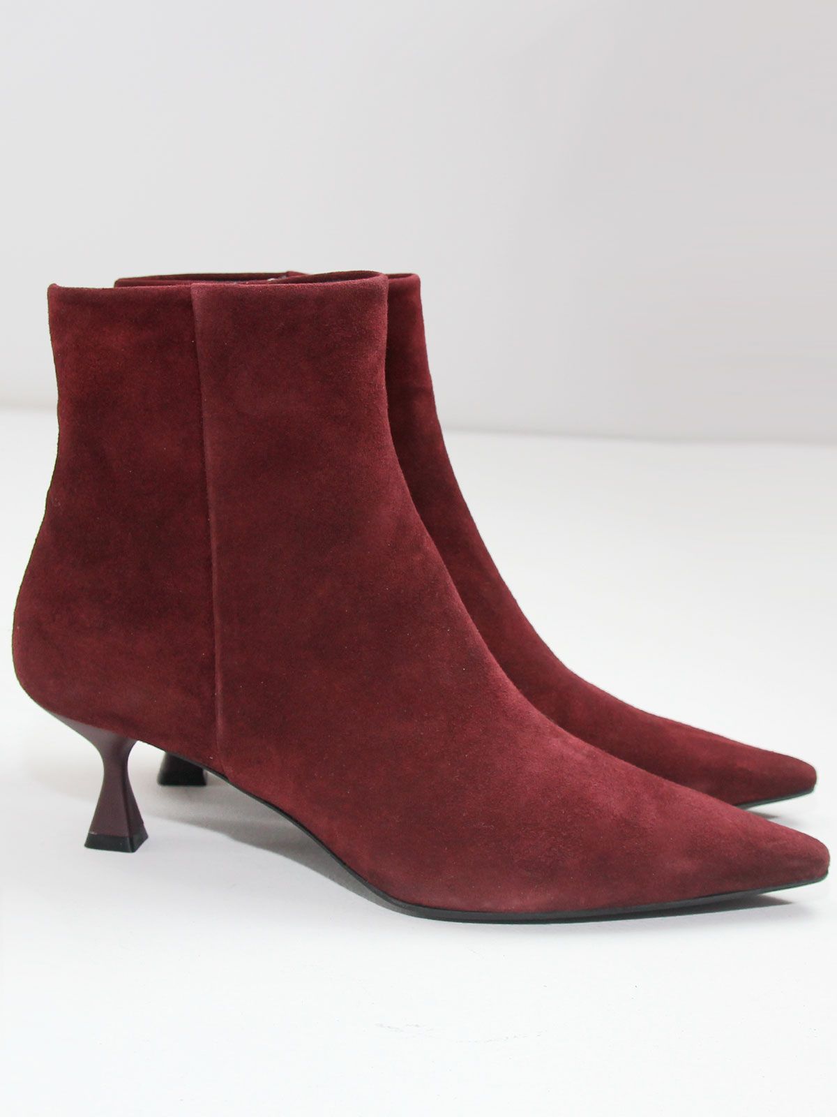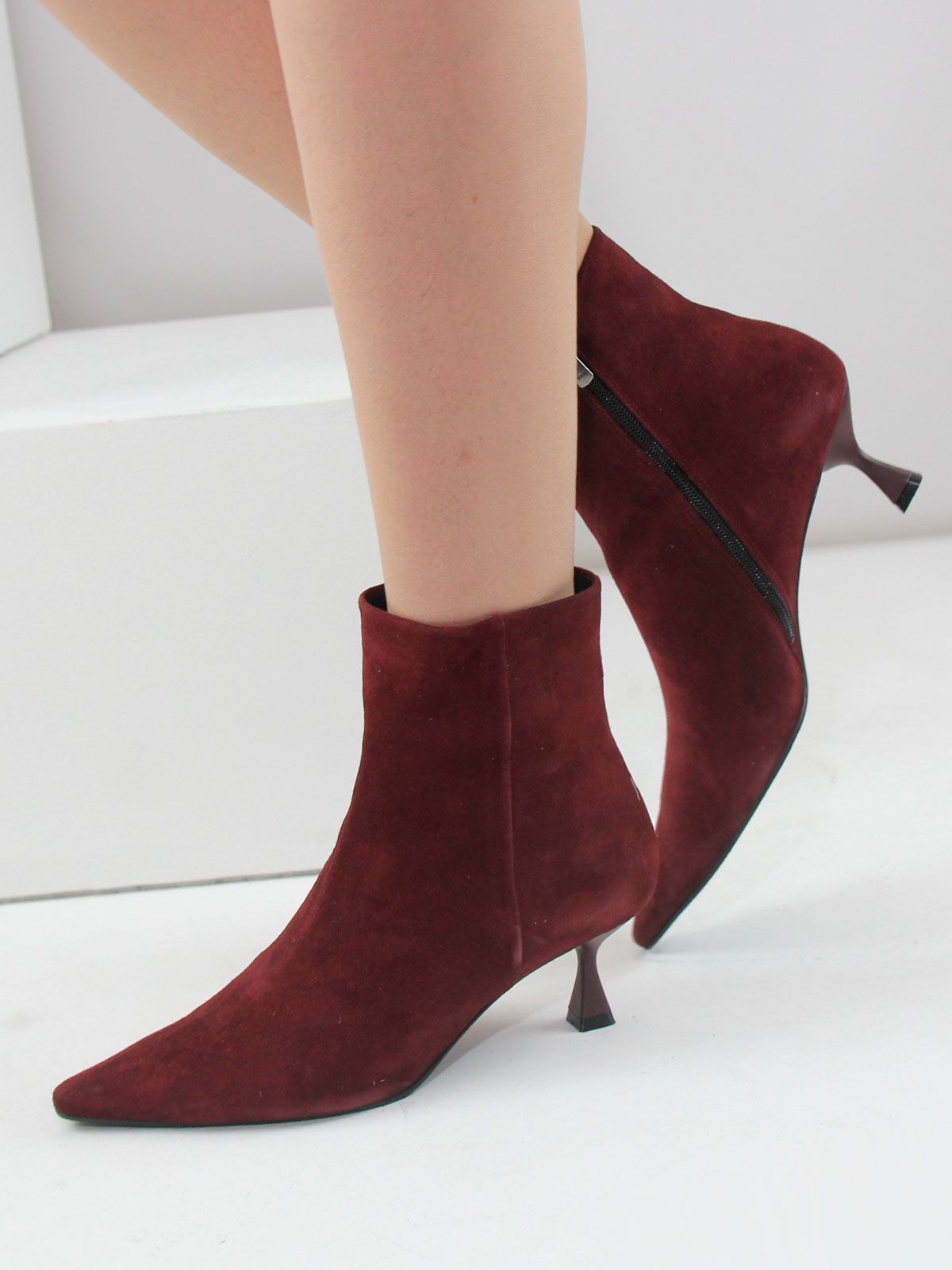 Изящные ботильоны на шпильке из натуральной замши в насыщенном тёмно-бордовом оттенке.