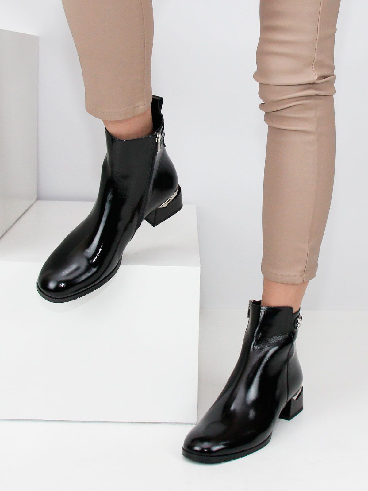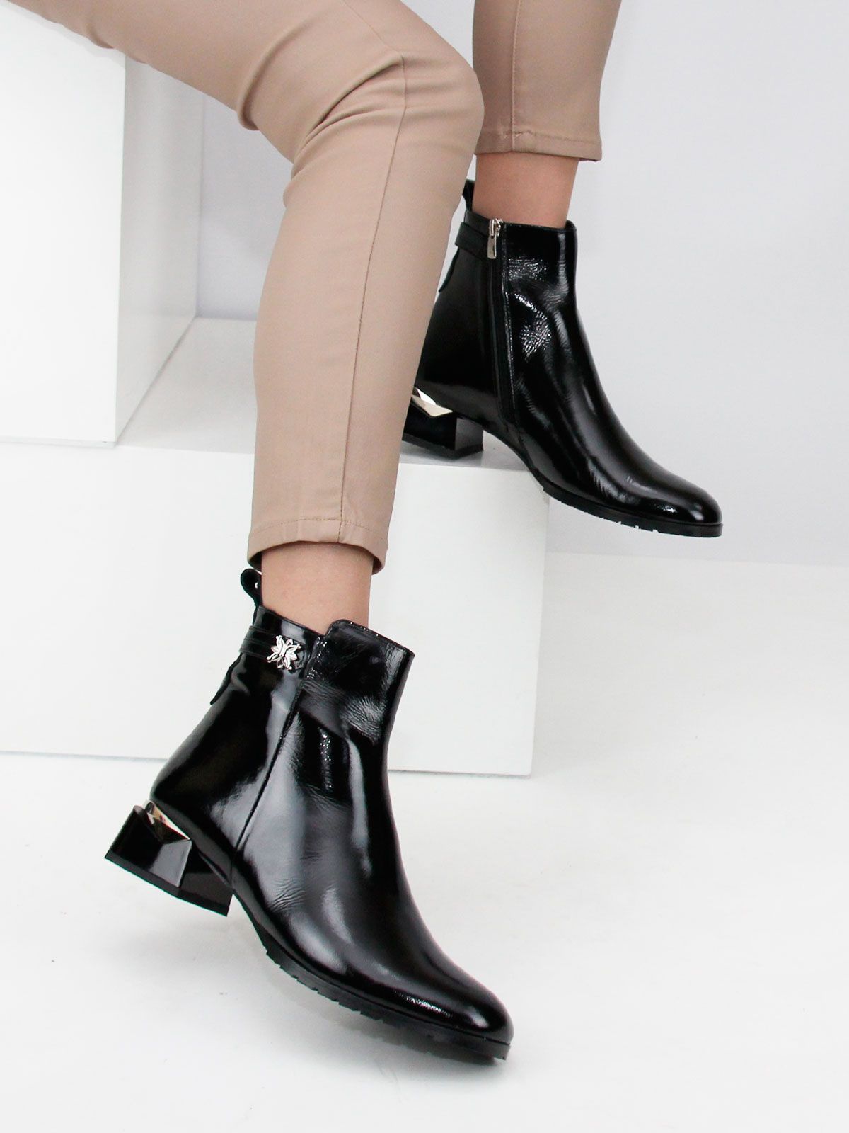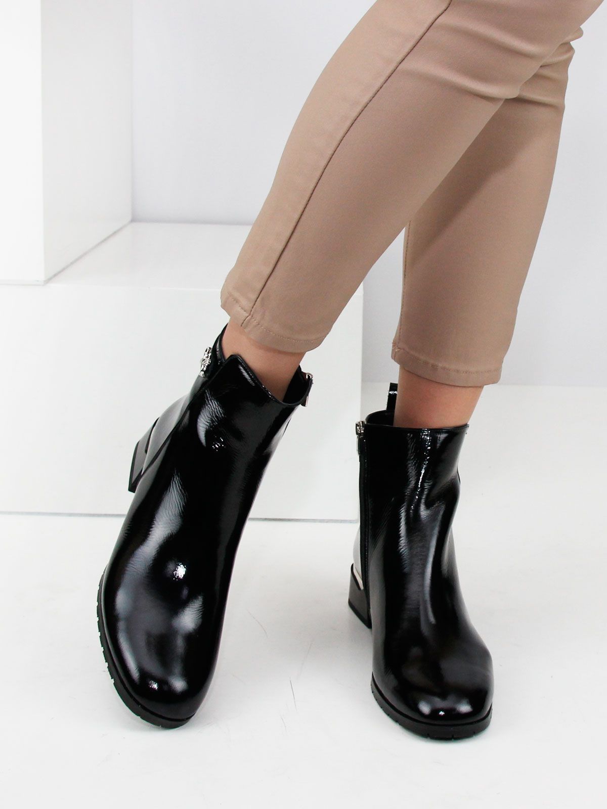 Удобные демисезонные ботильоны больших размеров черного цвета из натуральной лаковой кожи на невысоком каблуке. Производство Турция. Сбоку - застежка молния. Подкладка - байка.