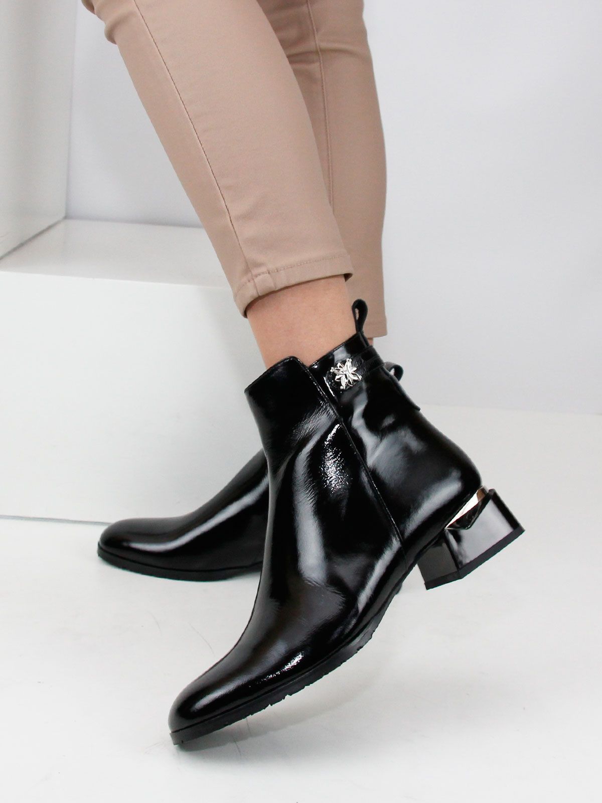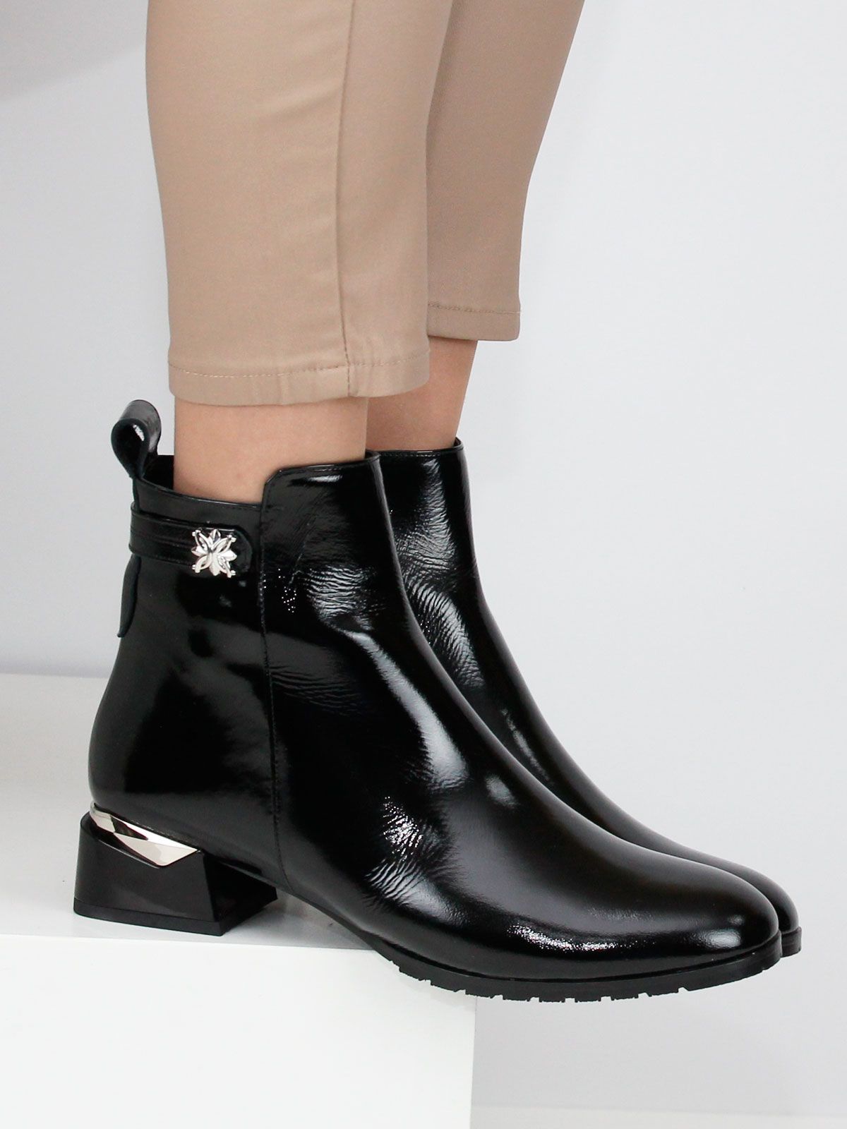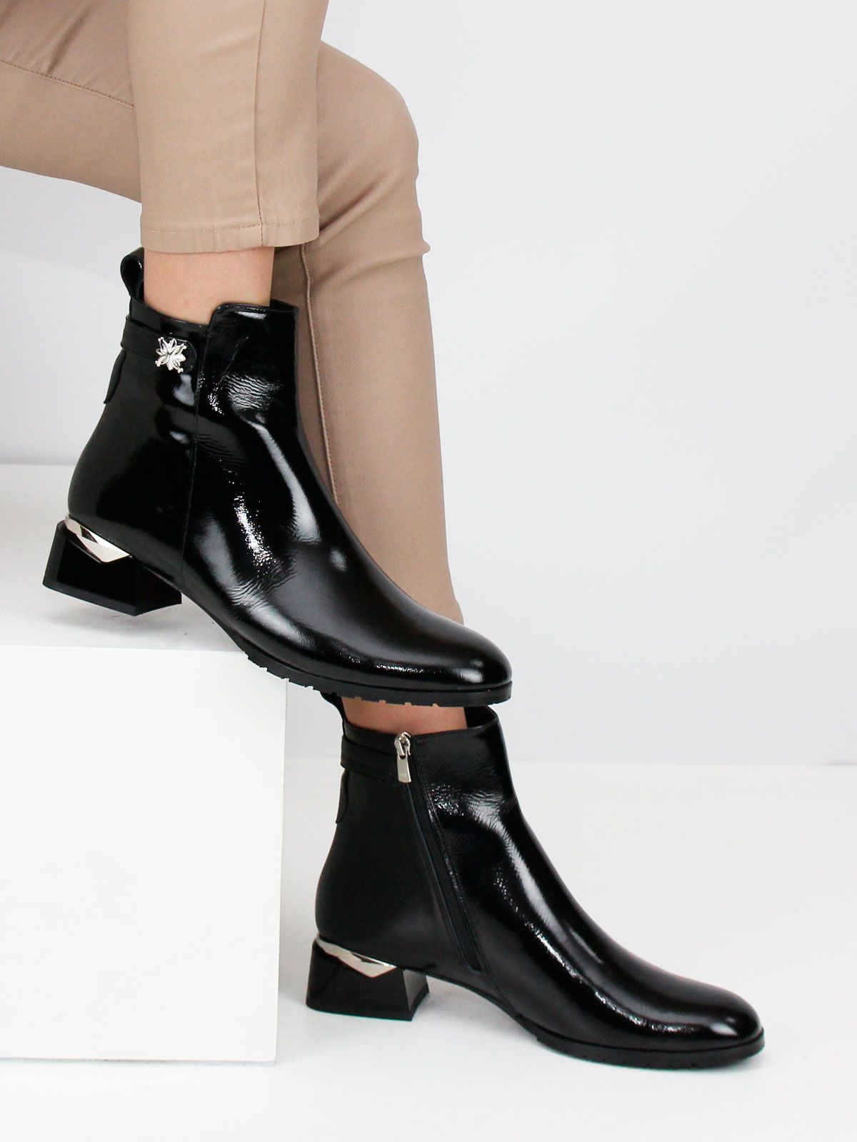 Удобные демисезонные ботильоны больших размеров черного цвета из натуральной лаковой кожи на невысоком каблуке. Производство Турция. Сбоку - застежка молния. Подкладка - байка.