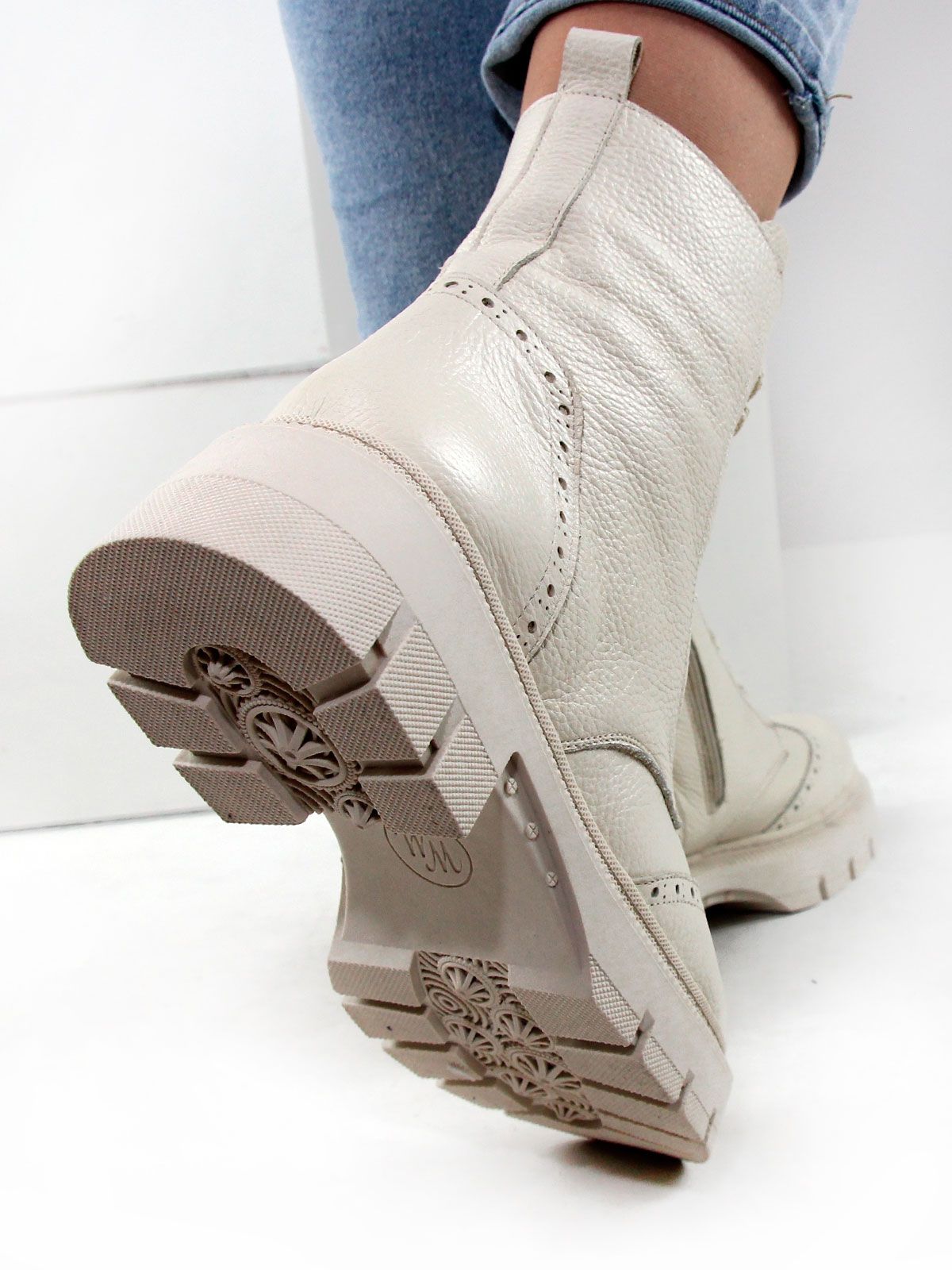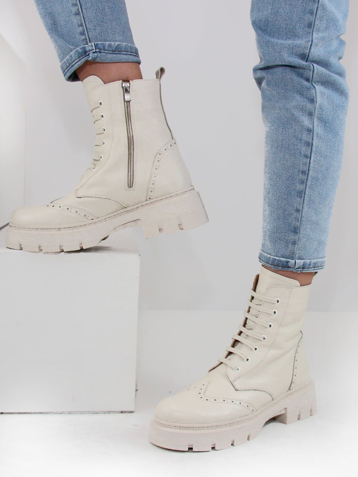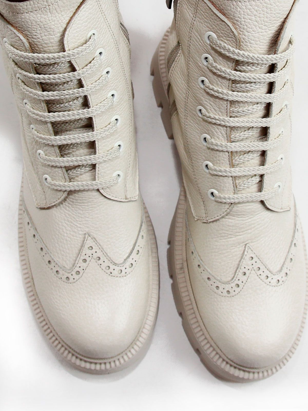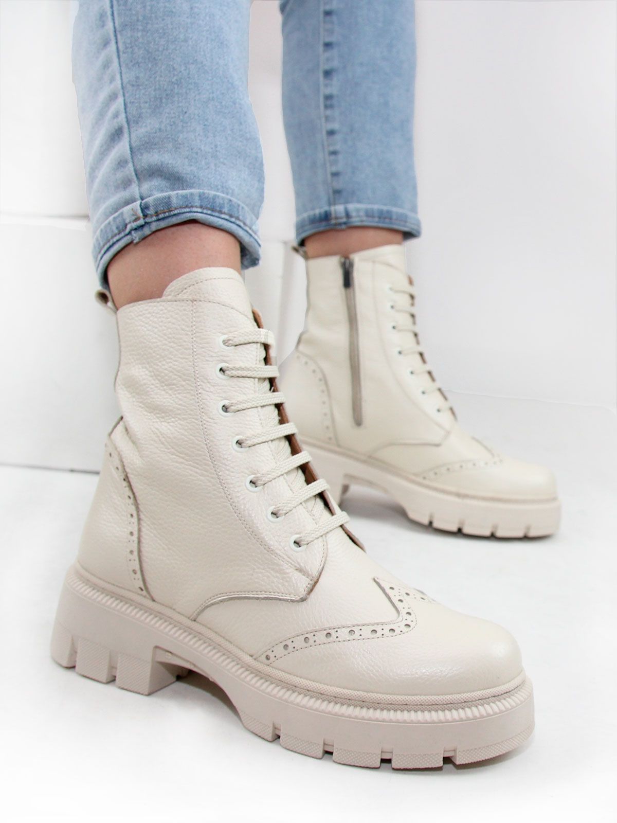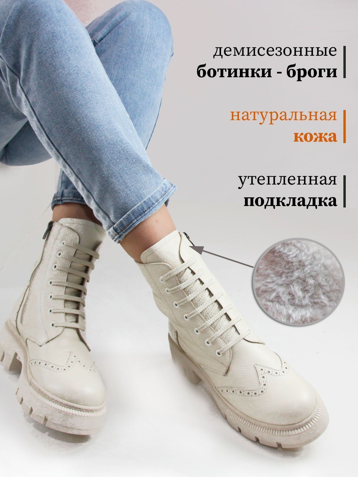 Идеальные универсальные женские ботинки-броги больших размеров из натуральной кожи актуального бежево-молочного цвета. Демисезонные ботинки на шнуровке утеплены плотным искуственным мехом и выполнены на нескользкой тракторной подошве. Сбоку - молния. Производство - Турция.
