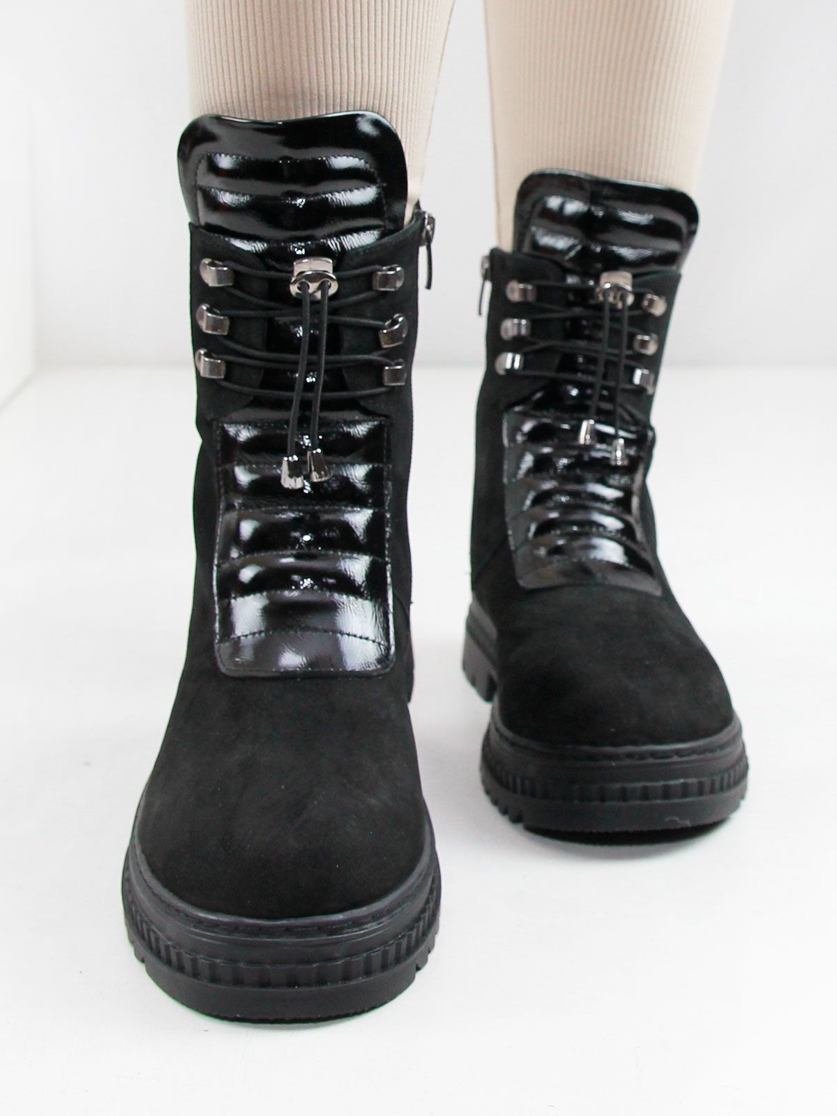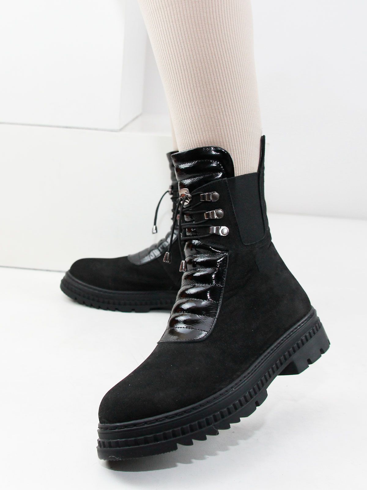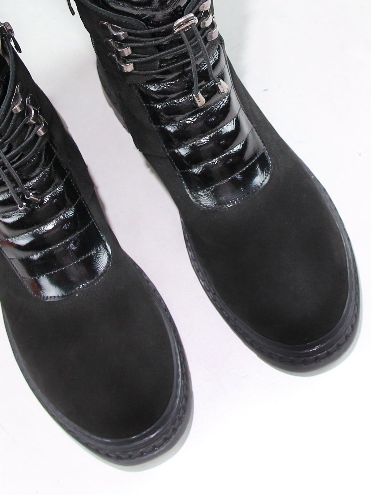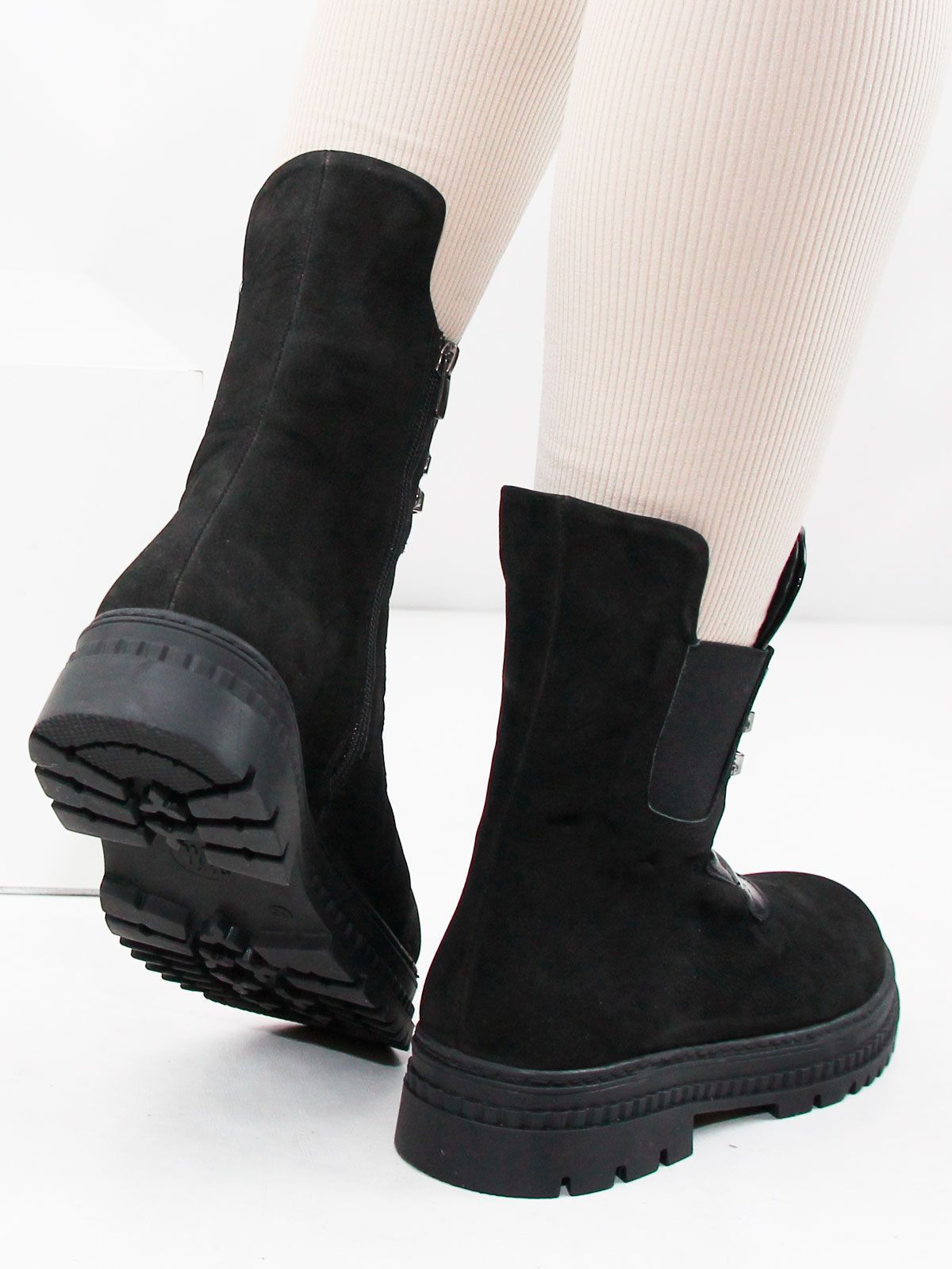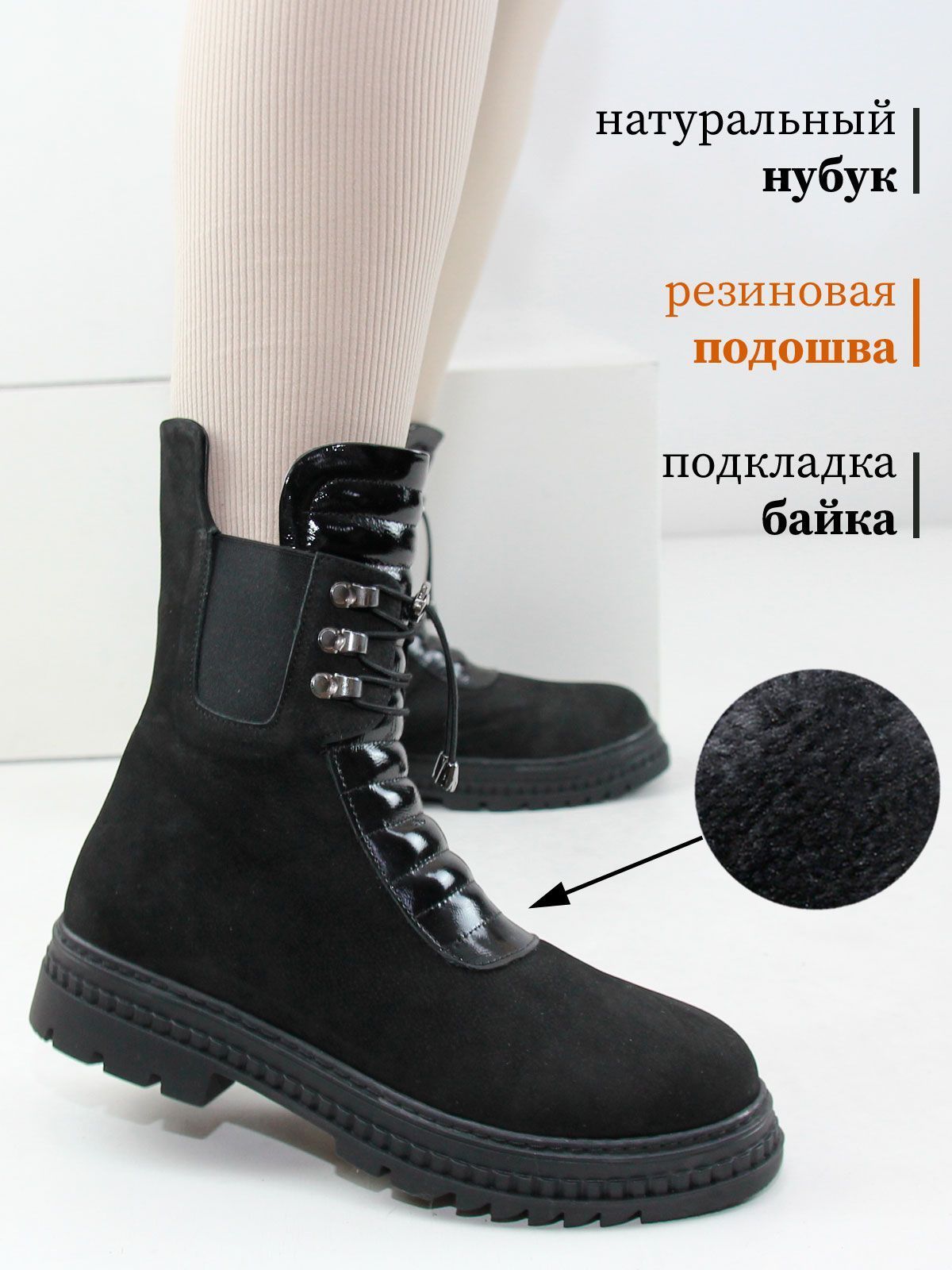 Стильные женские черные ботинки большого размера из натуральной замши. Подойдут на стандартную и широкую стопу. Подскладка - байка. Нескользкая резиновая подошва. Застежка - шнуровка + молния сбоку.