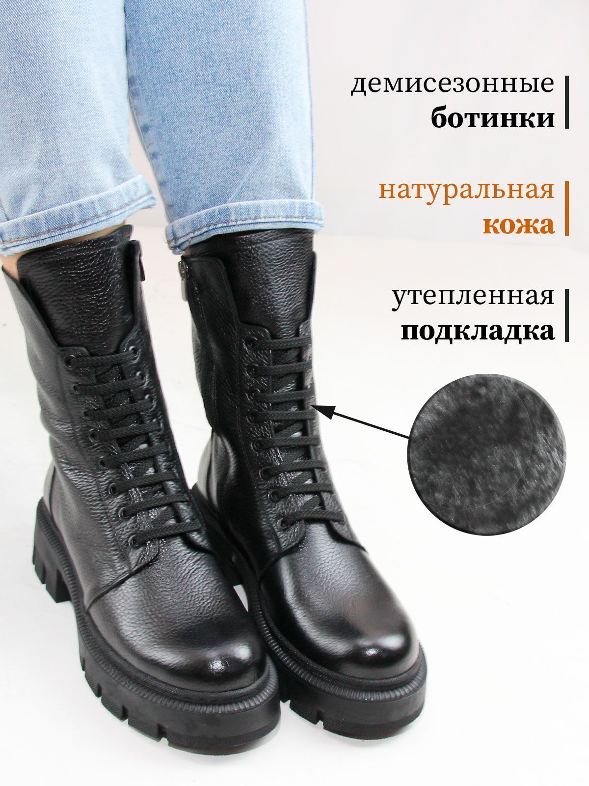 Идеальные универсальные женские высокие ботинки больших размеров из натуральной фактурной кожи классического черного цвета, на платформе. Демисезонные ботинки на шнуровке утеплены байкой и выполнены на нескользкой