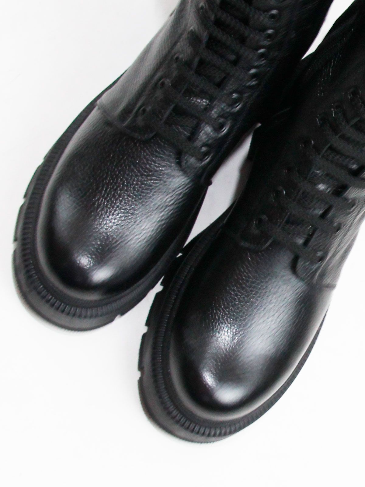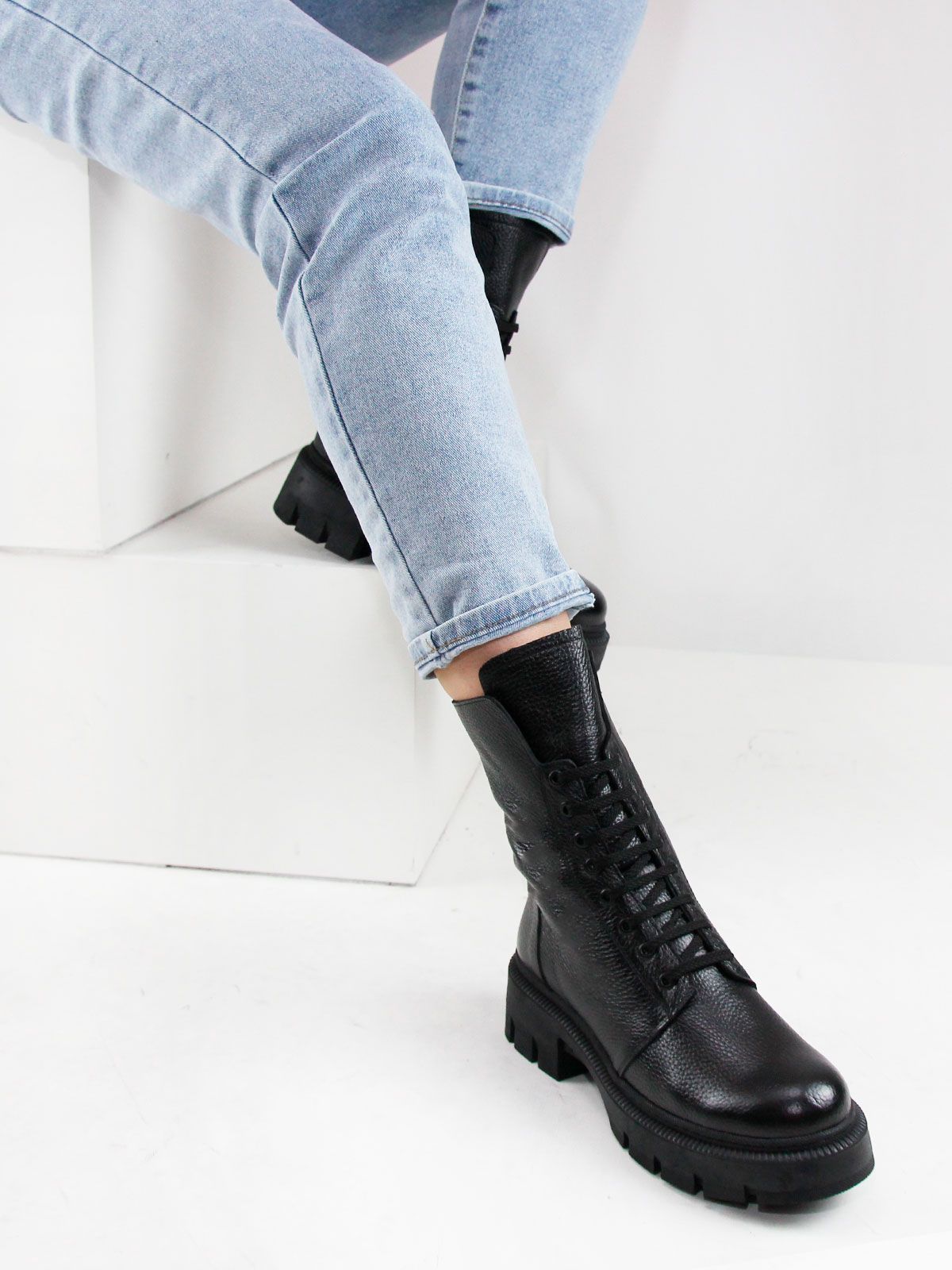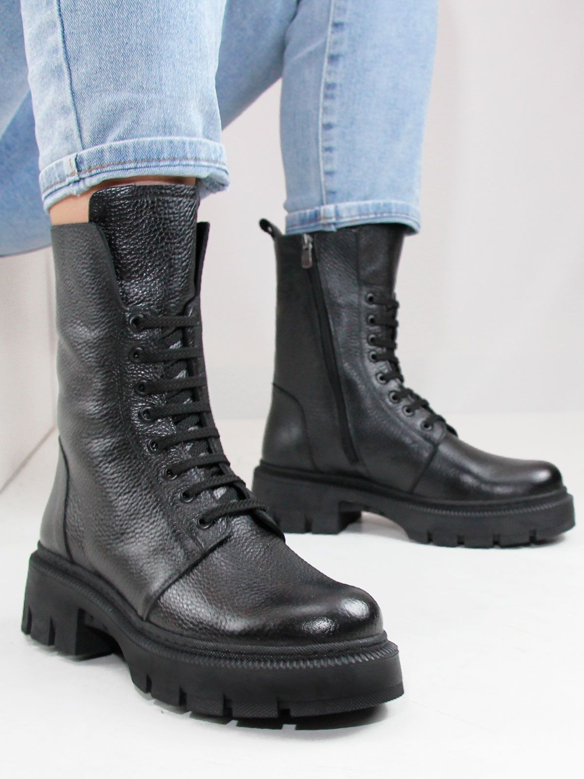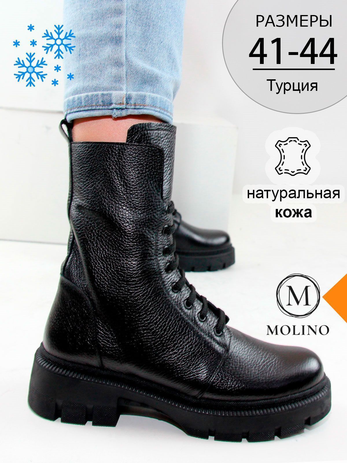 Идеальные универсальные женские ботинки больших размеров из натуральной матовой фактурной кожи классического черного цвета, на платформе. Зимние ботинки на шнуровке утеплены натуральным мехом и выполнены на нескользкой тракторной подошве с протектором в цвет кожи. Сбоку - молния. Модель большемерит,пожалуйста, ориентируйтесь на длину стельки в описании.