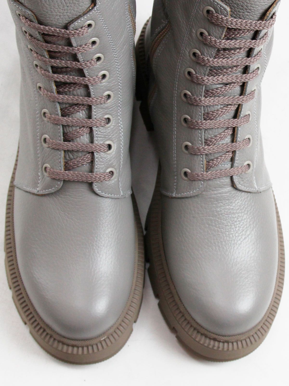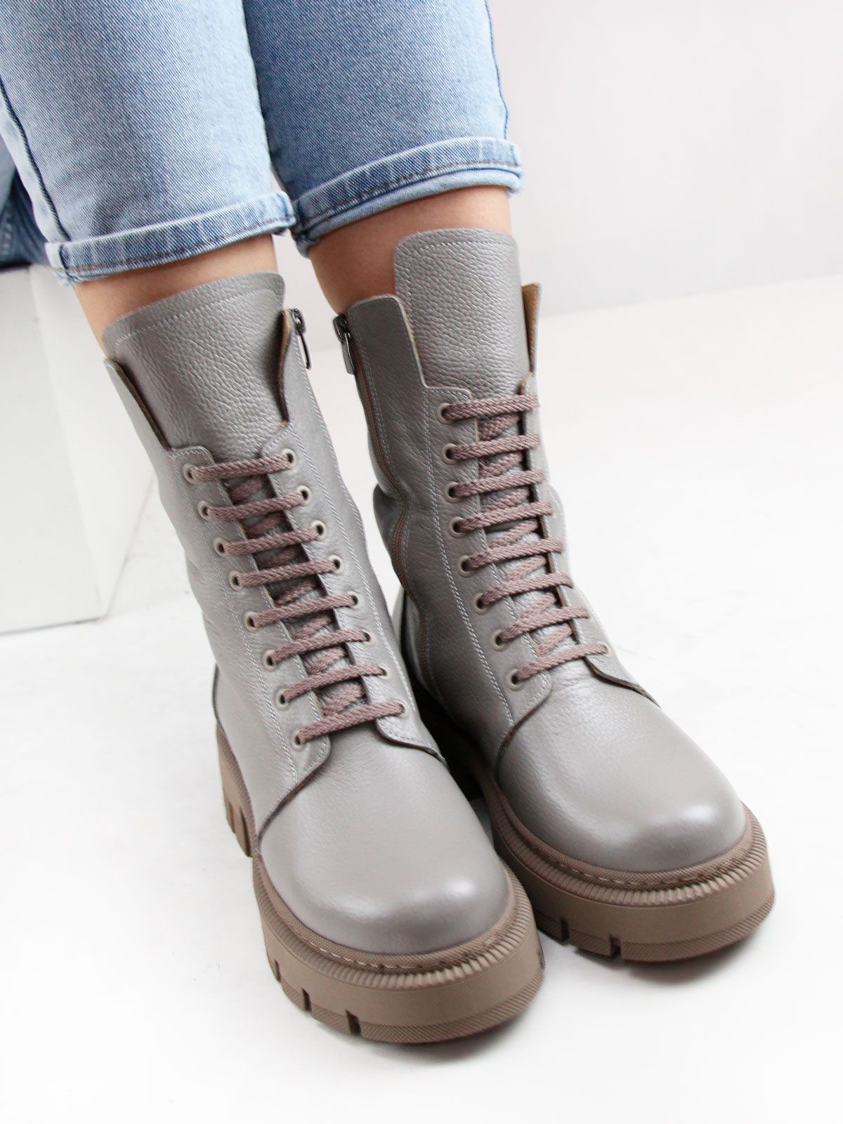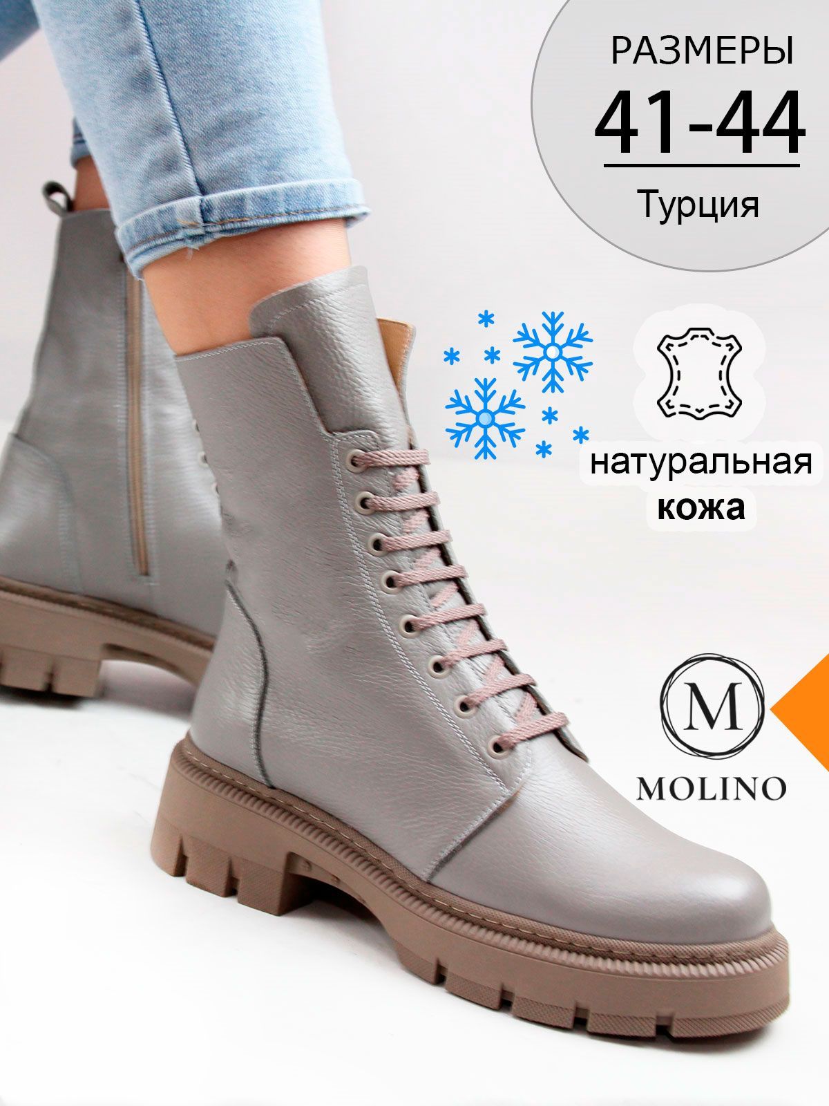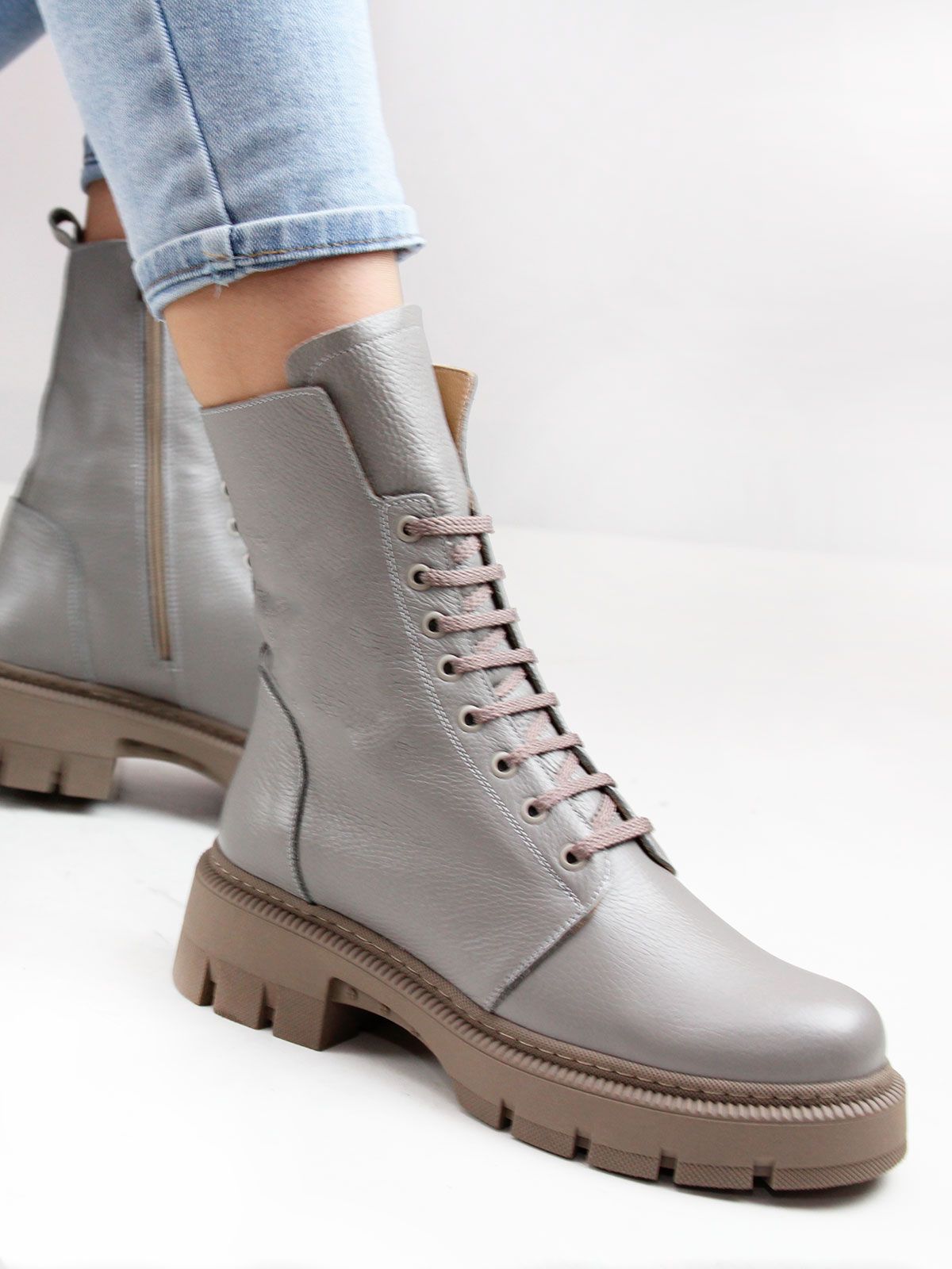 Идеальные универсальные женские высокие ботинки больших размеров из натуральной кожи актуального серого цвета. Зимние ботинки на шнуровке утеплены натуральным мехом и выполнены на нескользкой тракторной подошве .
