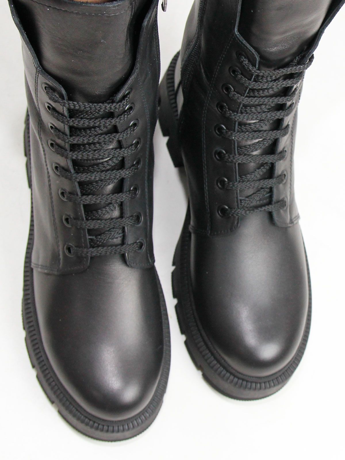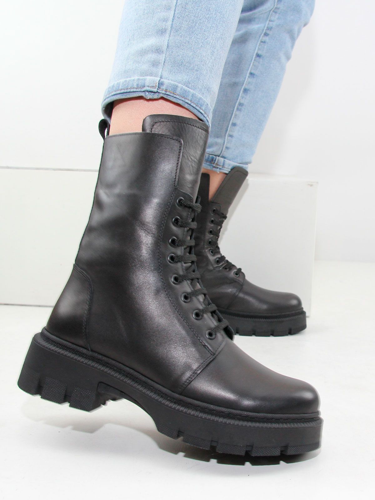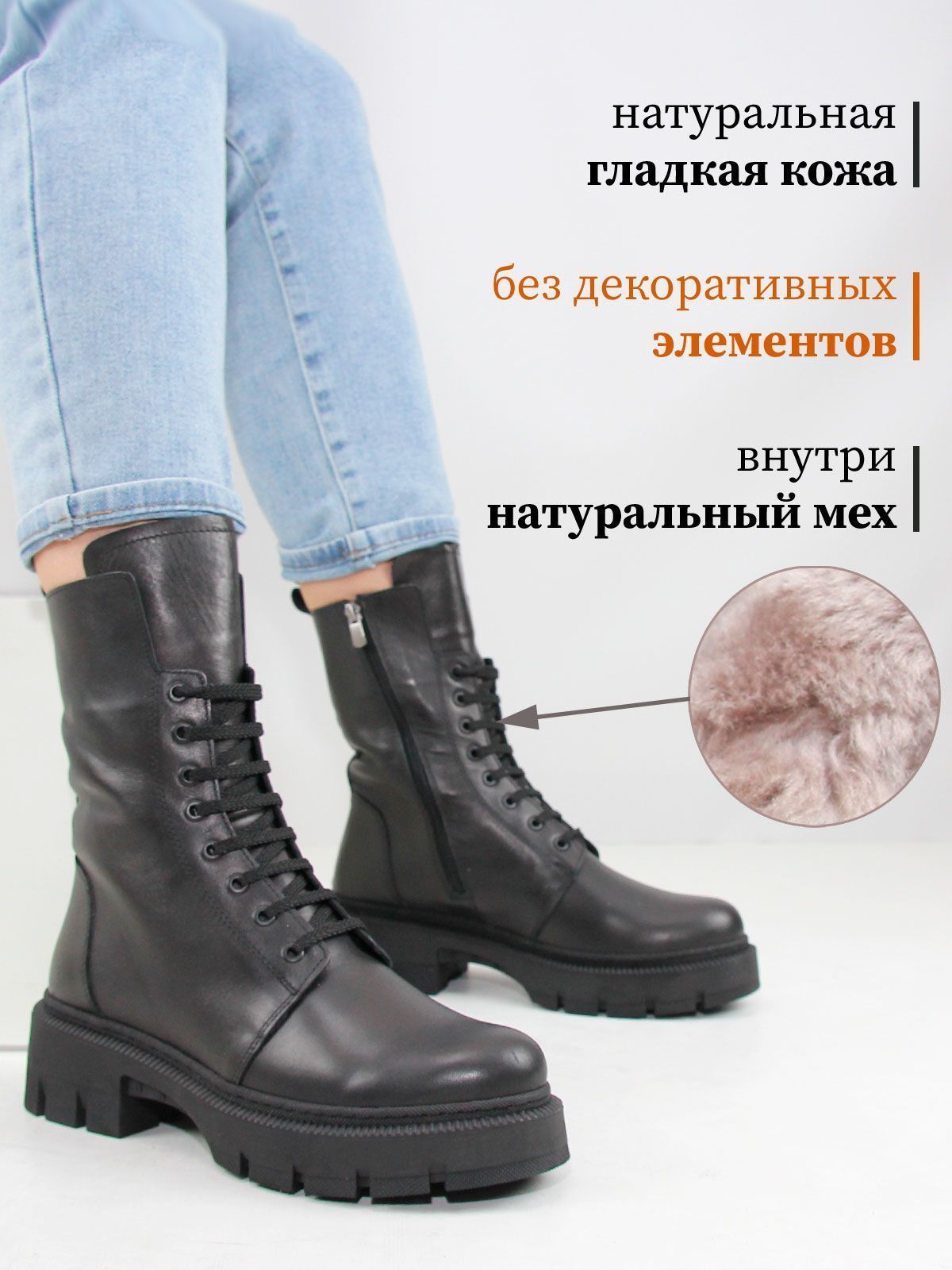 Идеальные универсальные женские ботинки больших размеров из натуральной матовой гладкой кожи классического черного цвета, на платформе. Зимние ботинки на шнуровке утеплены натуральным мехом и выполнены на нескользкой тракторной подошве с протектором в цвет кожи. Сбоку - молния. Модель большемерит, пожалуйста, ориентируйтесь на длину стельки в описании.
