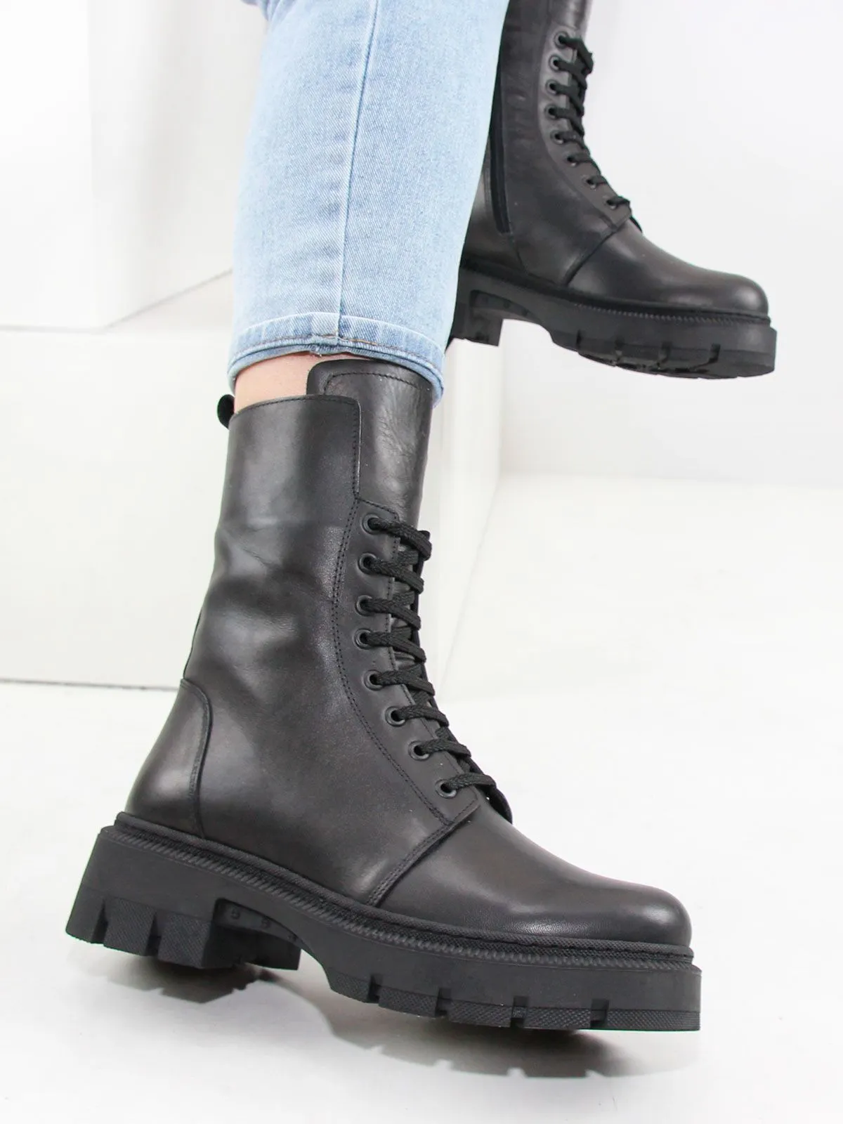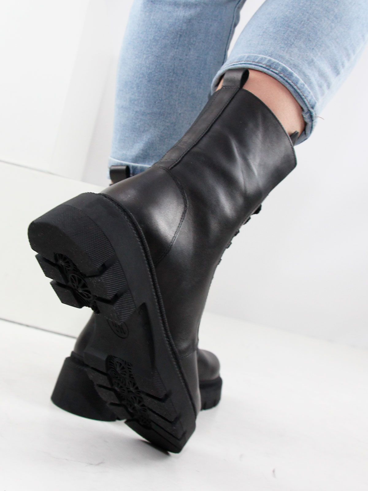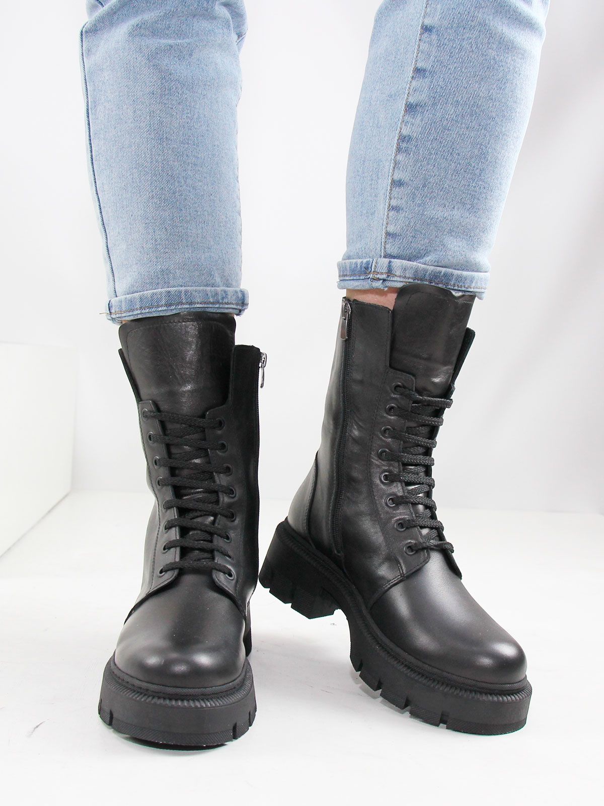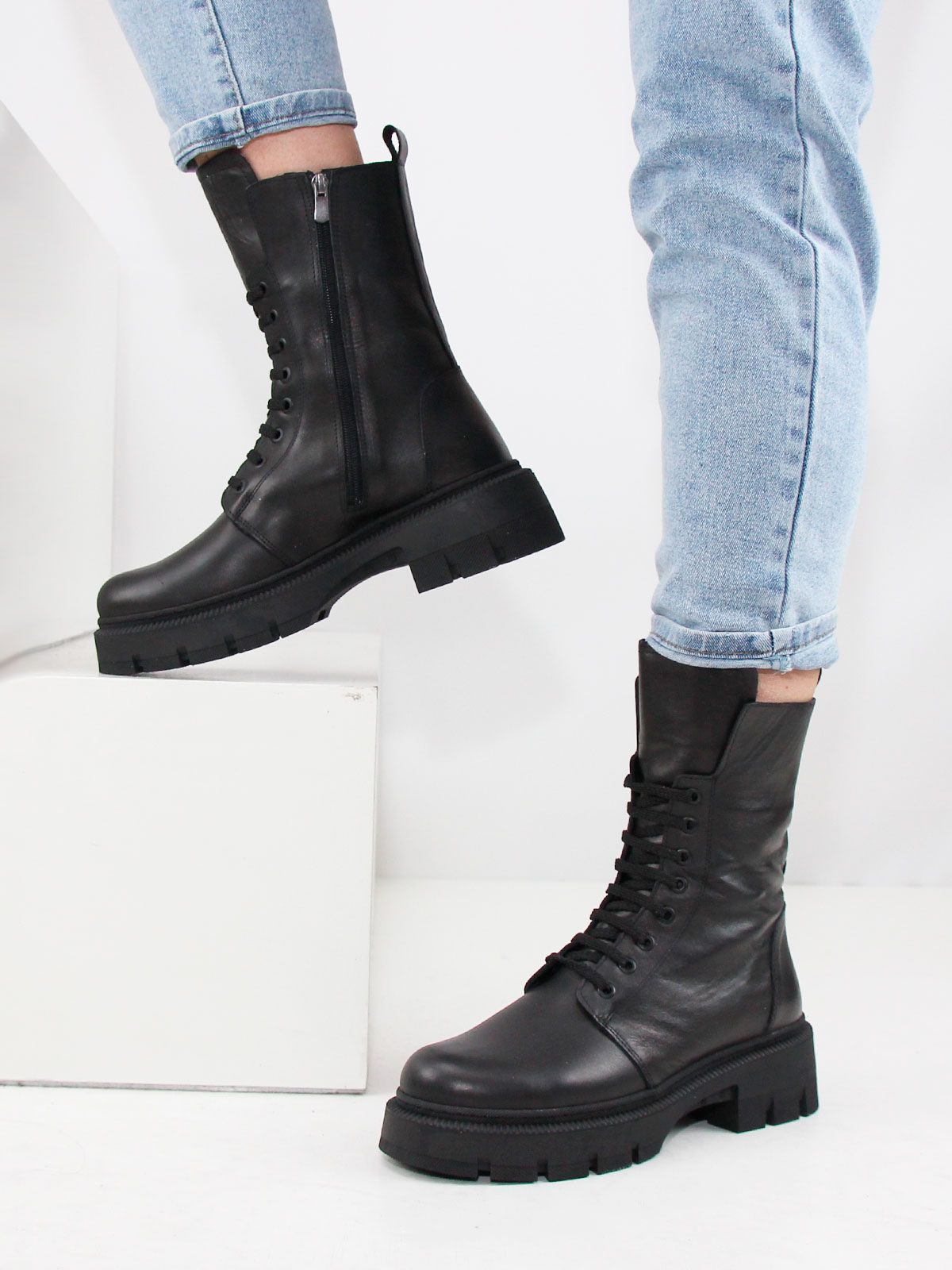 Идеальные универсальные женские ботинки больших размеров из натуральной матовой гладкой кожи классического черного цвета, на платформе. Зимние ботинки на шнуровке утеплены натуральным мехом и выполнены на нескользкой тракторной подошве с протектором в цвет кожи. Сбоку - молния. Модель большемерит, пожалуйста, ориентируйтесь на длину стельки в описании.