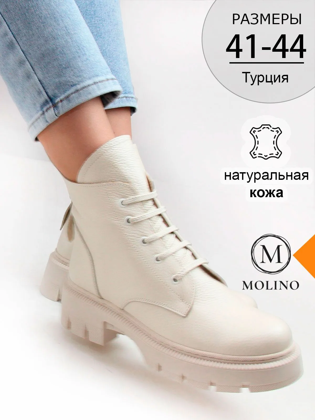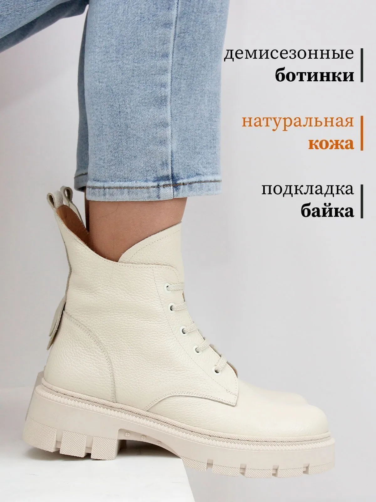 Идеальные универсальные женские ботинки больших размеров из натуральной кожи актуального бежево-молочного цвета. Демисезонные ботинки на шнуровке утеплены байкой и выполнены на нескользкой тракторной подошве в цвет кожи.