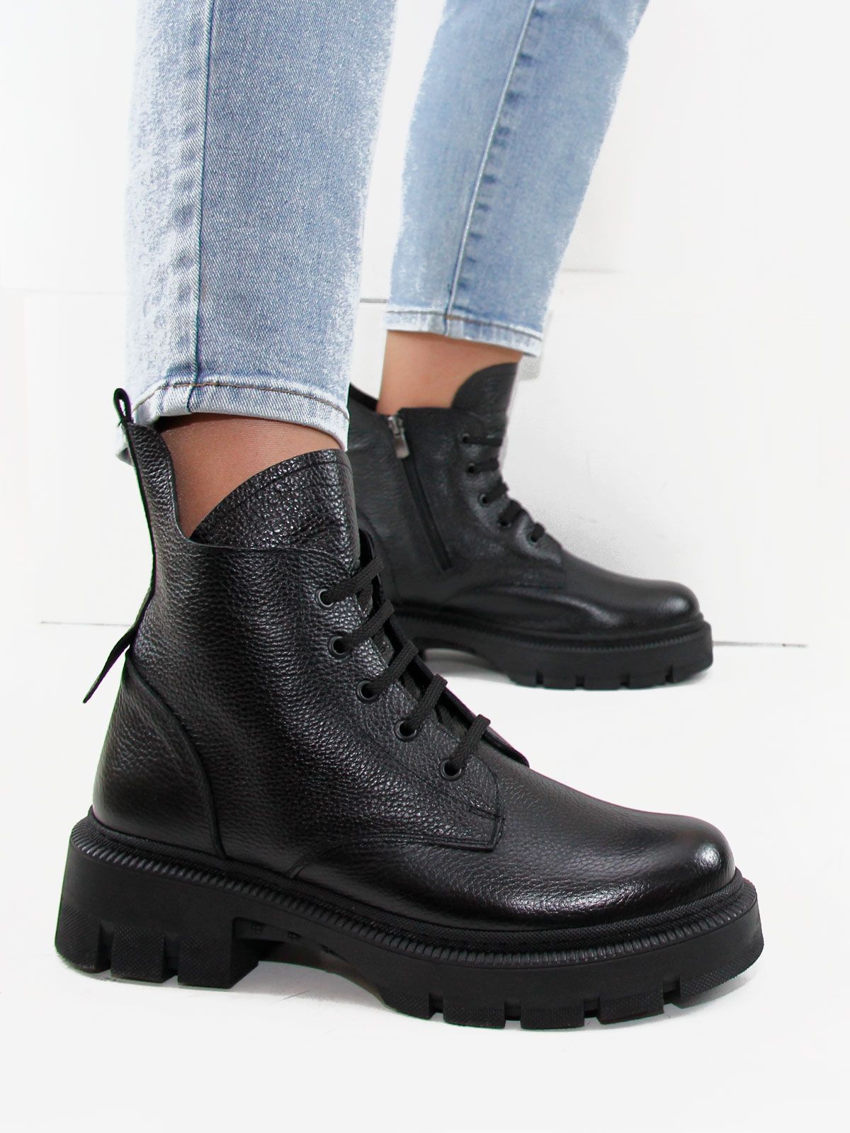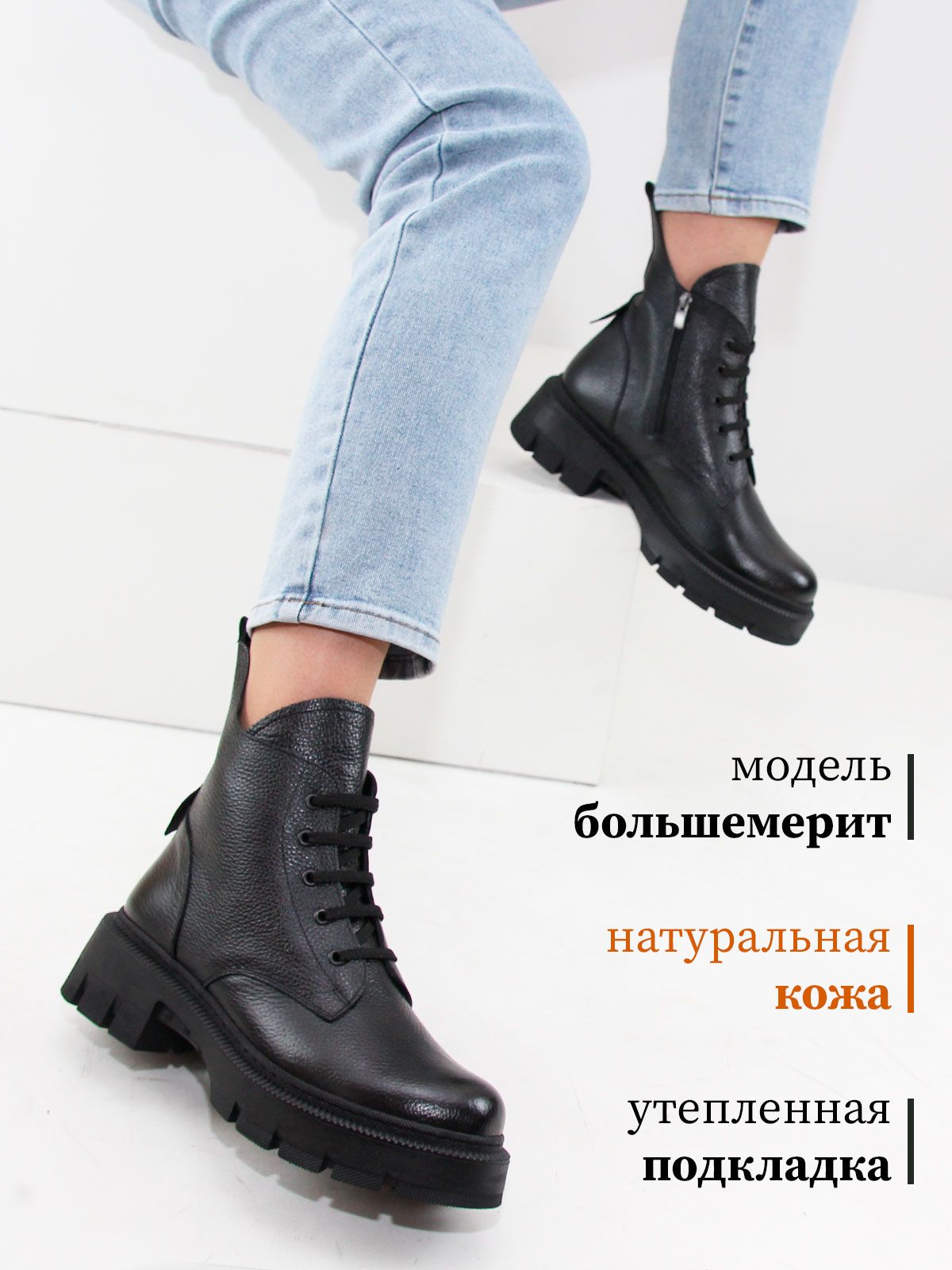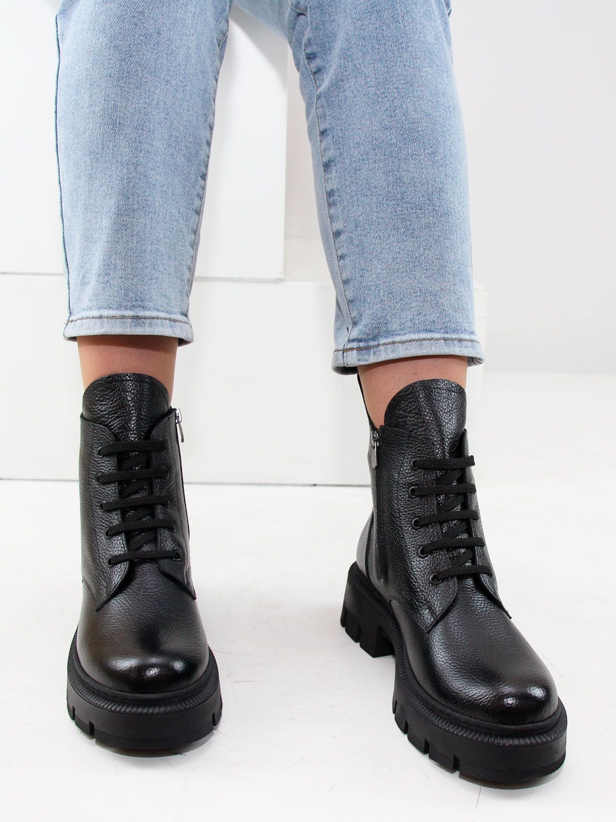 Идеальные универсальные женские ботинки больших размеров из натуральной фактурной кожи классического черного цвета на платформе. Демисезонные ботинки на шнуровке утеплены байкой и выполнены на нескользкой