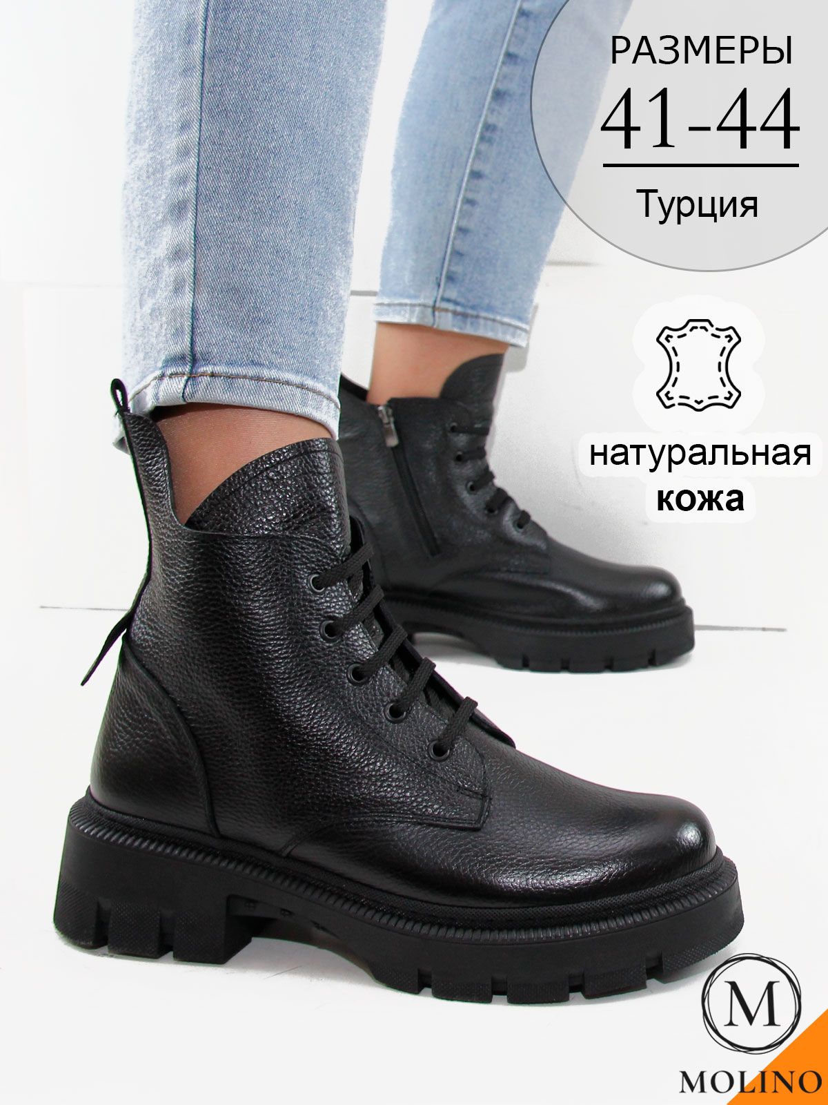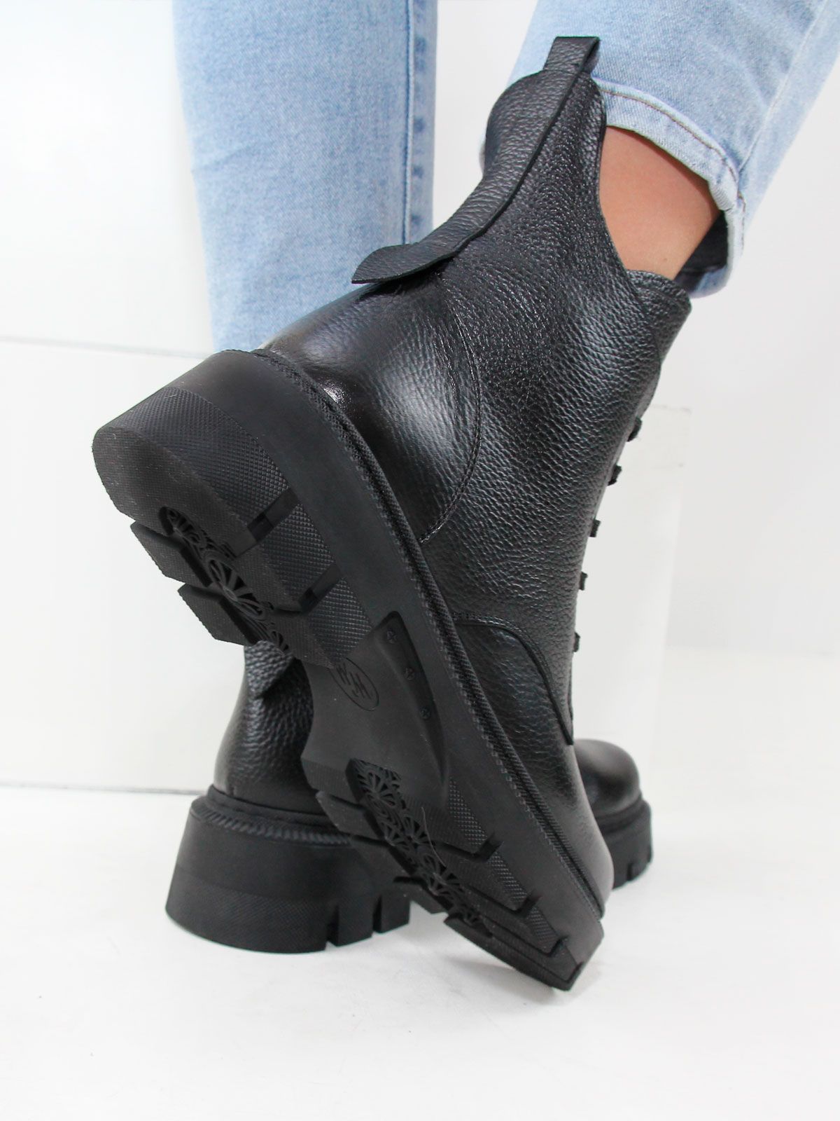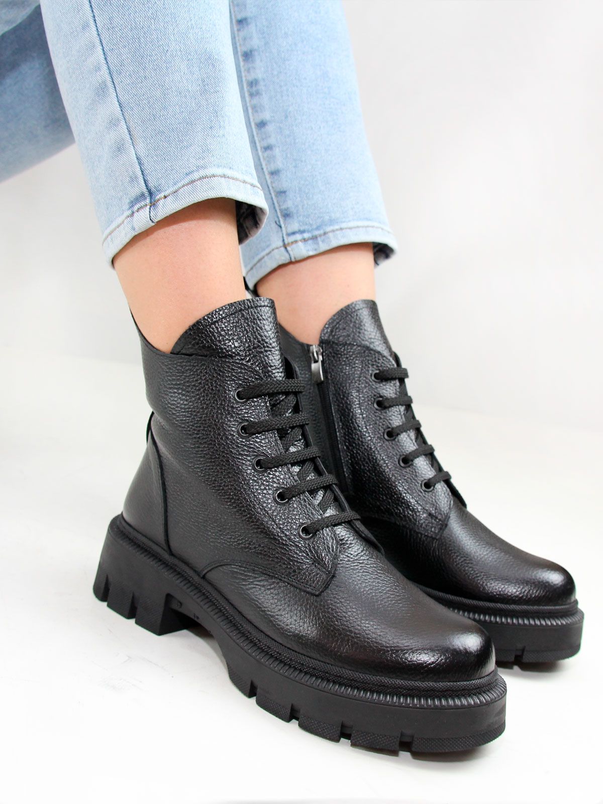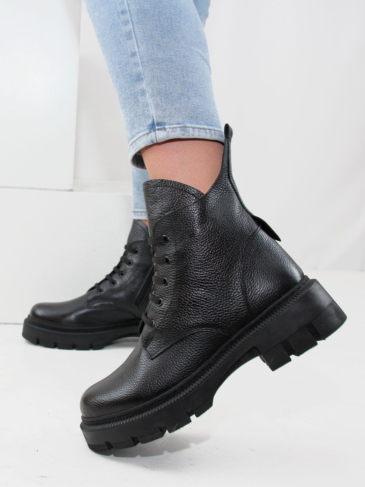 Идеальные универсальные женские ботинки больших размеров из натуральной фактурной кожи классического черного цвета на платформе. Демисезонные ботинки на шнуровке утеплены байкой и выполнены на нескользкой