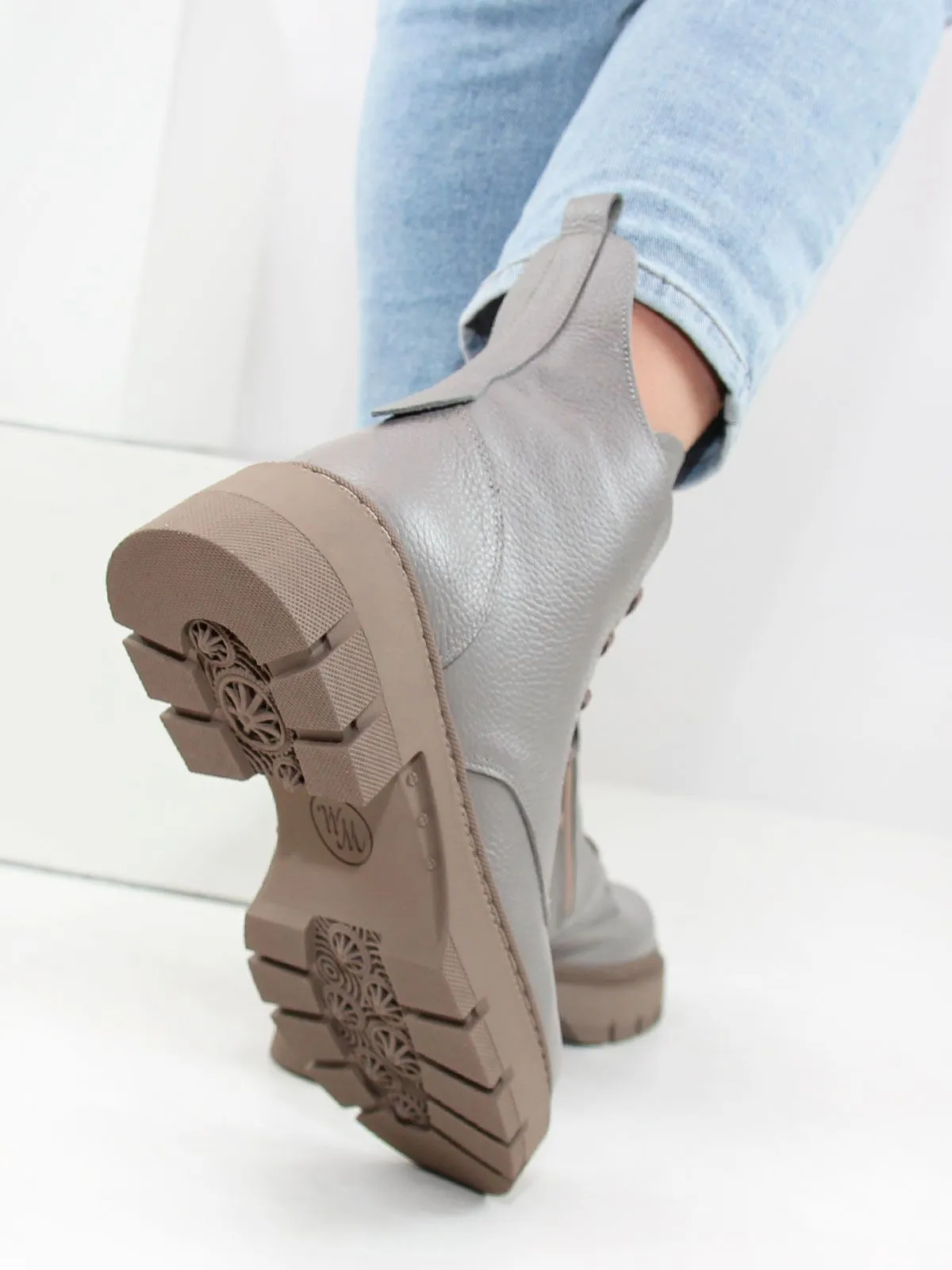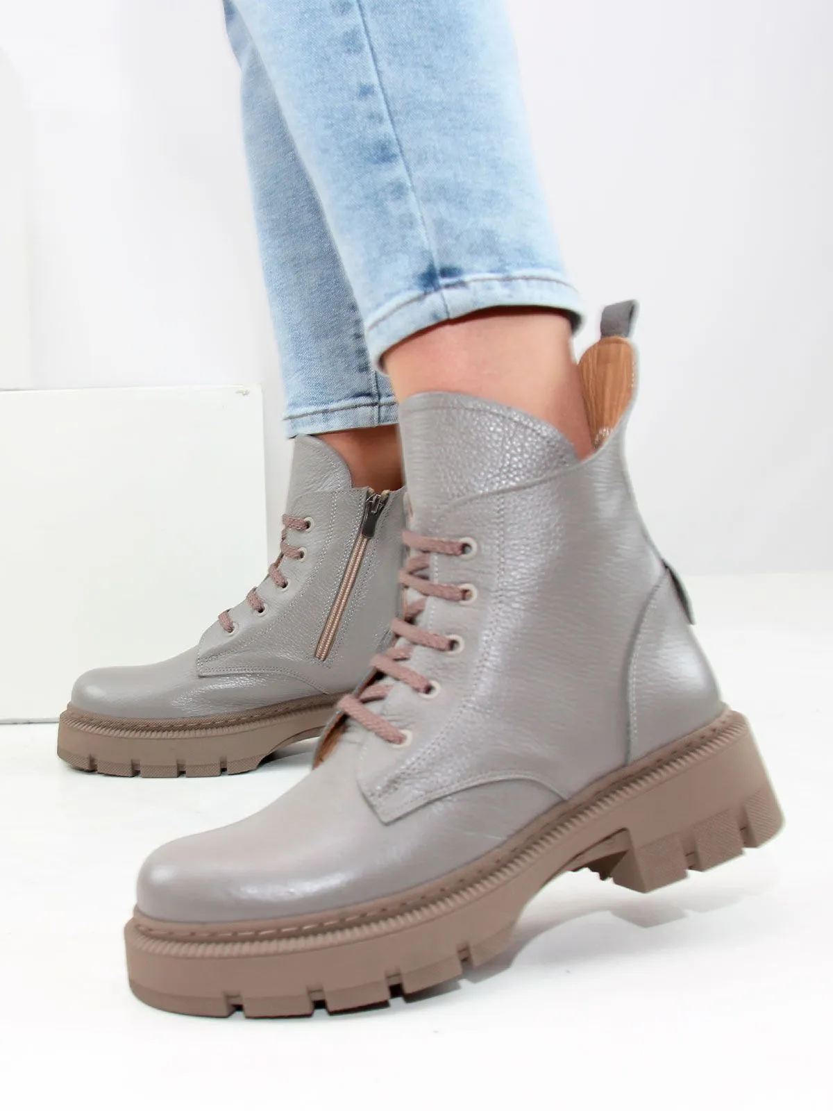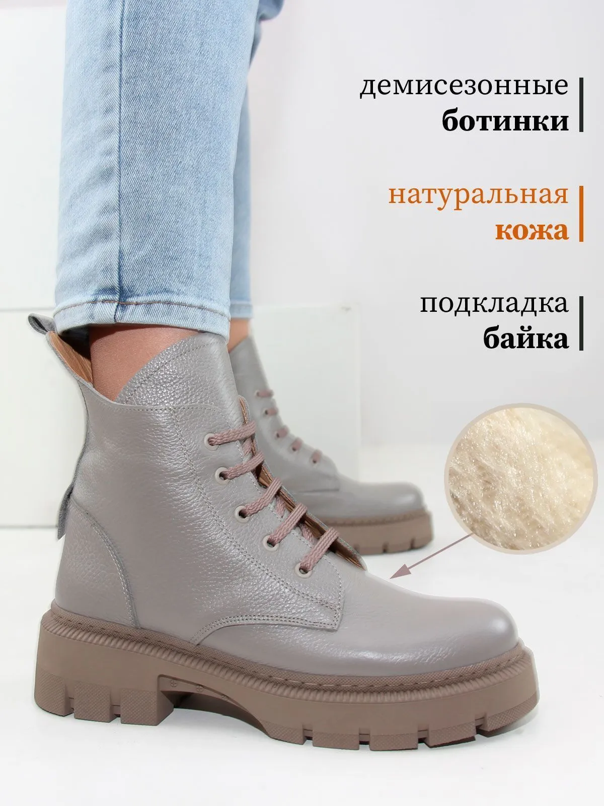 Идеальные универсальные женские ботинки больших размеров из натуральной кожи. Демисезонные серые ботинки на шнуровке утеплены байкой и выполнены на нескользкой тракторной подошве.