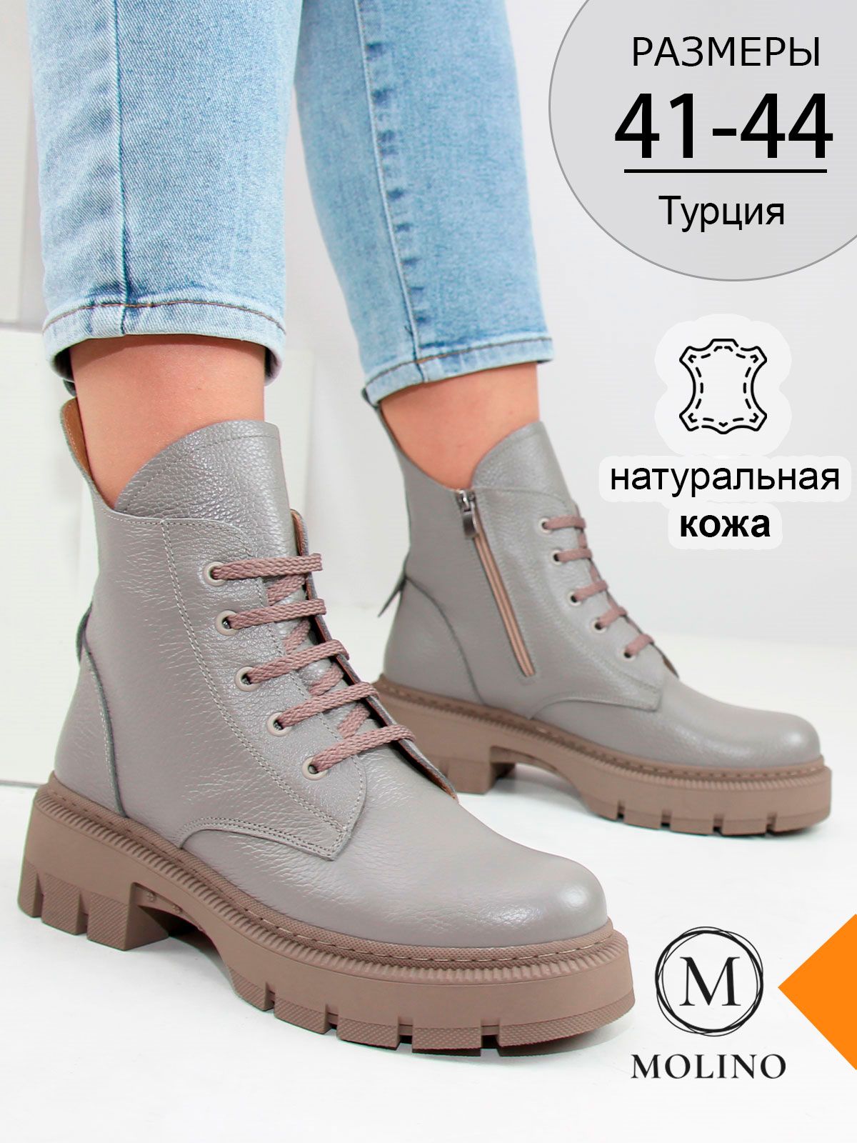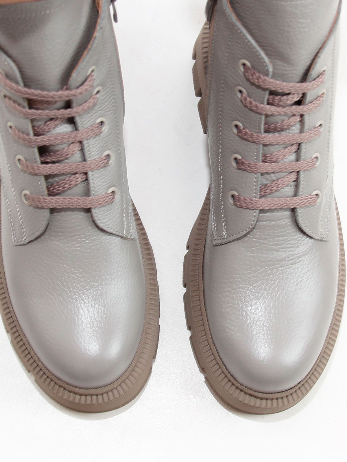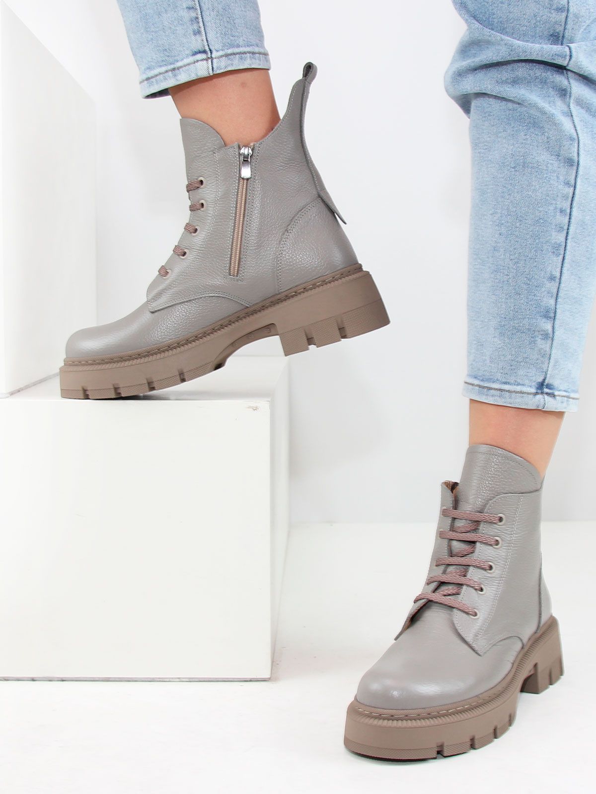 Идеальные универсальные женские ботинки больших размеров из натуральной кожи. Зимние серые ботинки на шнуровке утеплены натуральным мехом и выполнены на нескользкой тракторной подошве.