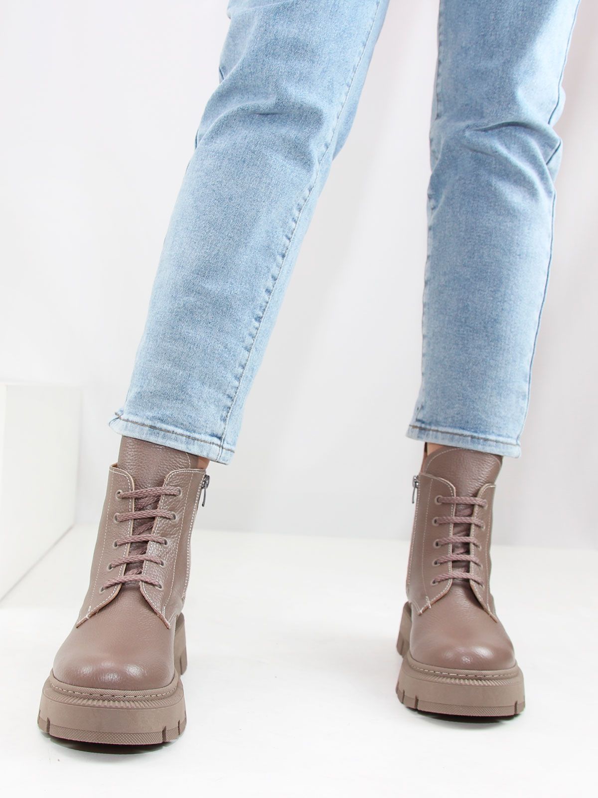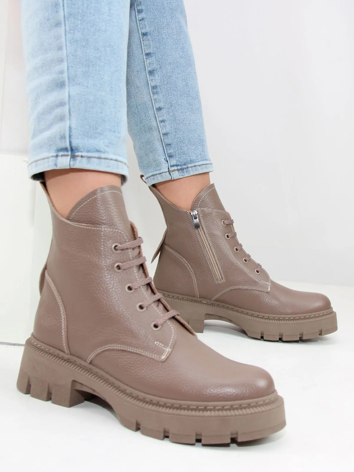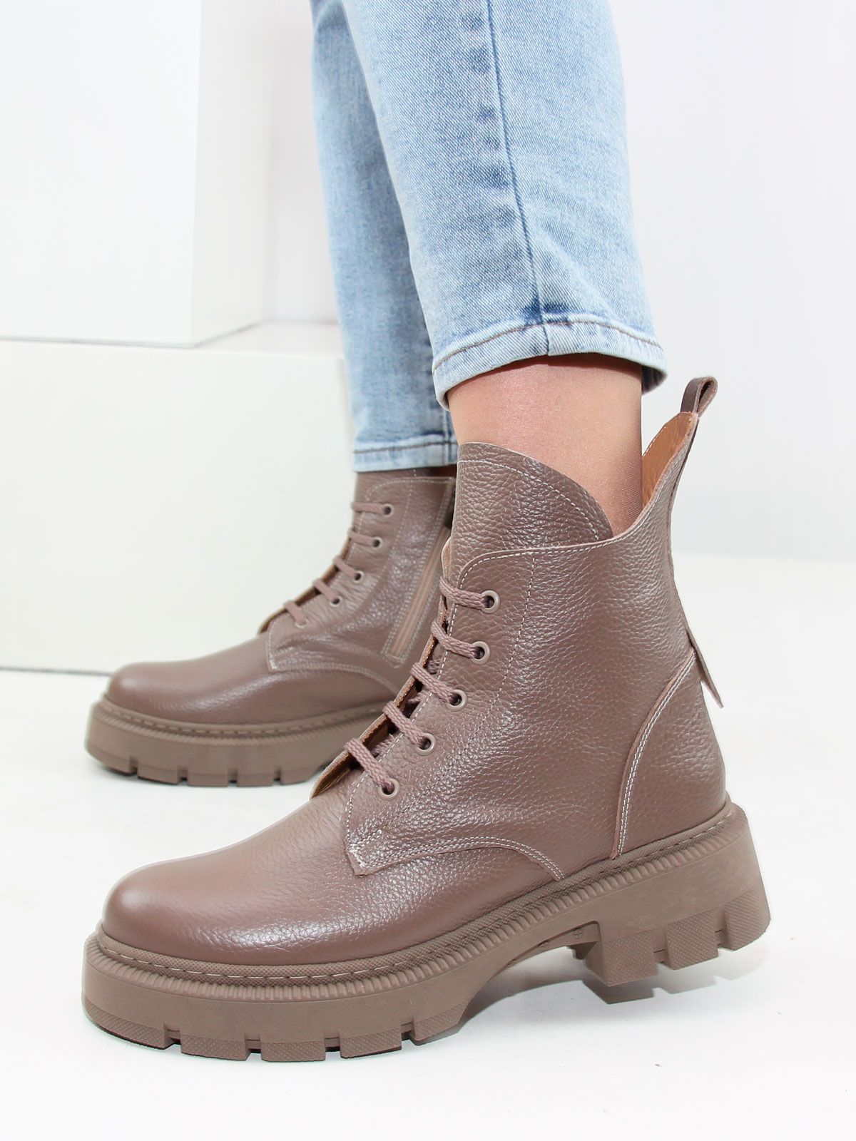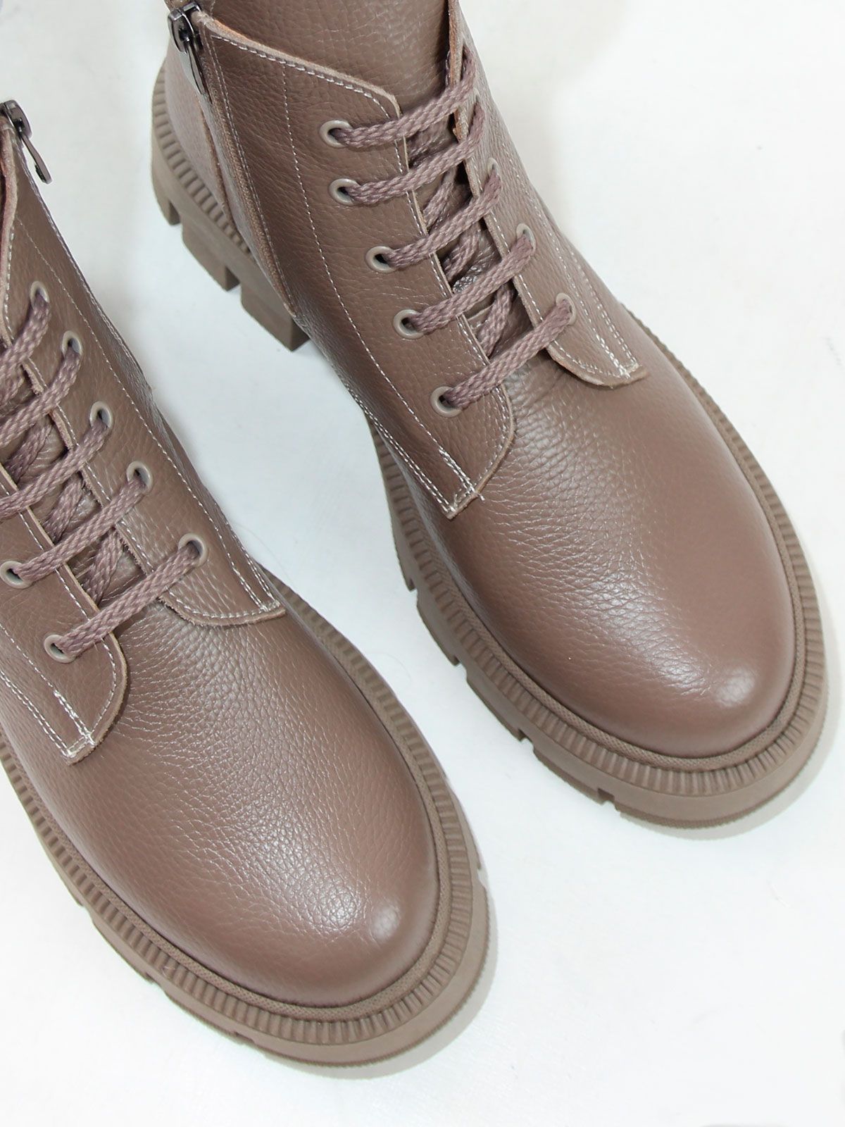 Идеальные универсальные женские ботинки больших размеров из текстурной натуральной кожи актуального темно-бежевого цвета. Зимние ботинки на шнуровке утеплены натуральным мехом и выполнены на нескользкой тракторной подошве в цвет кожи.