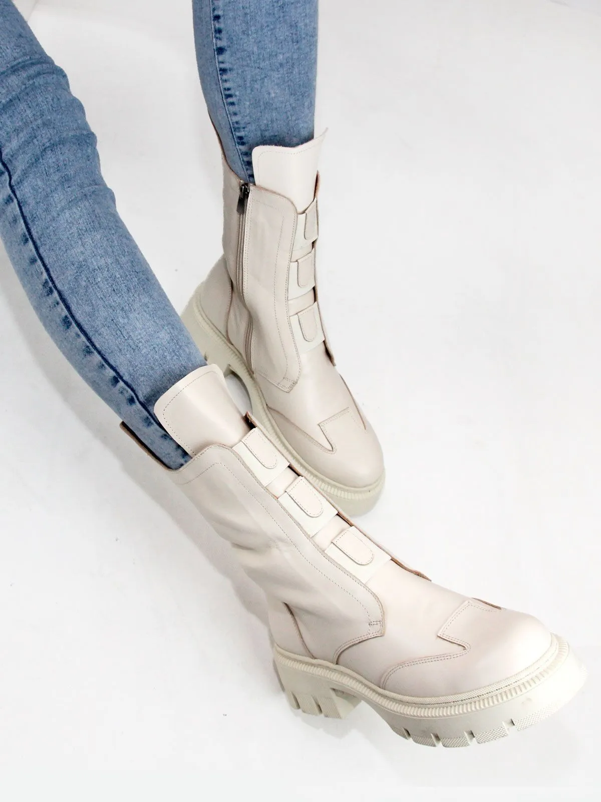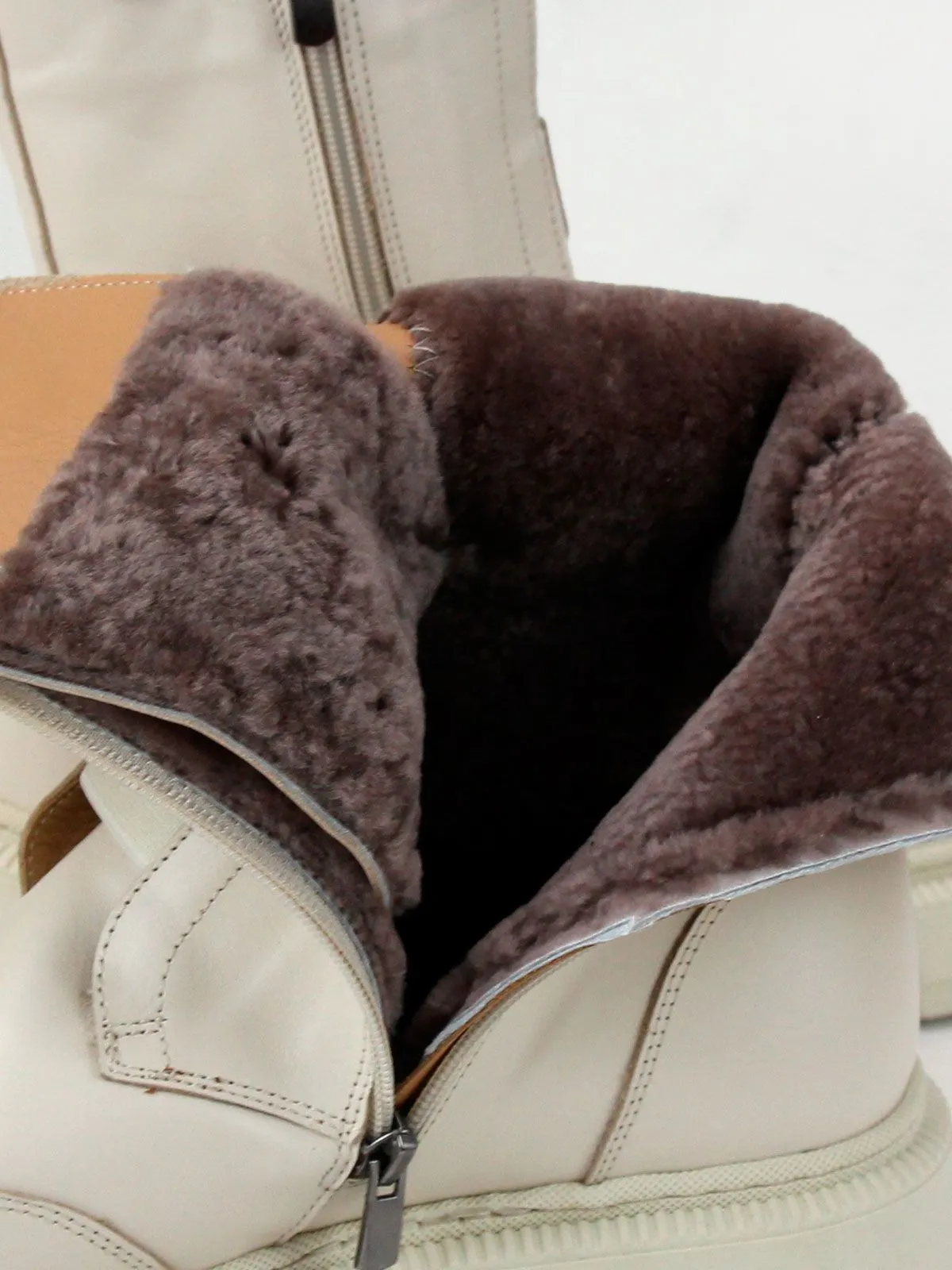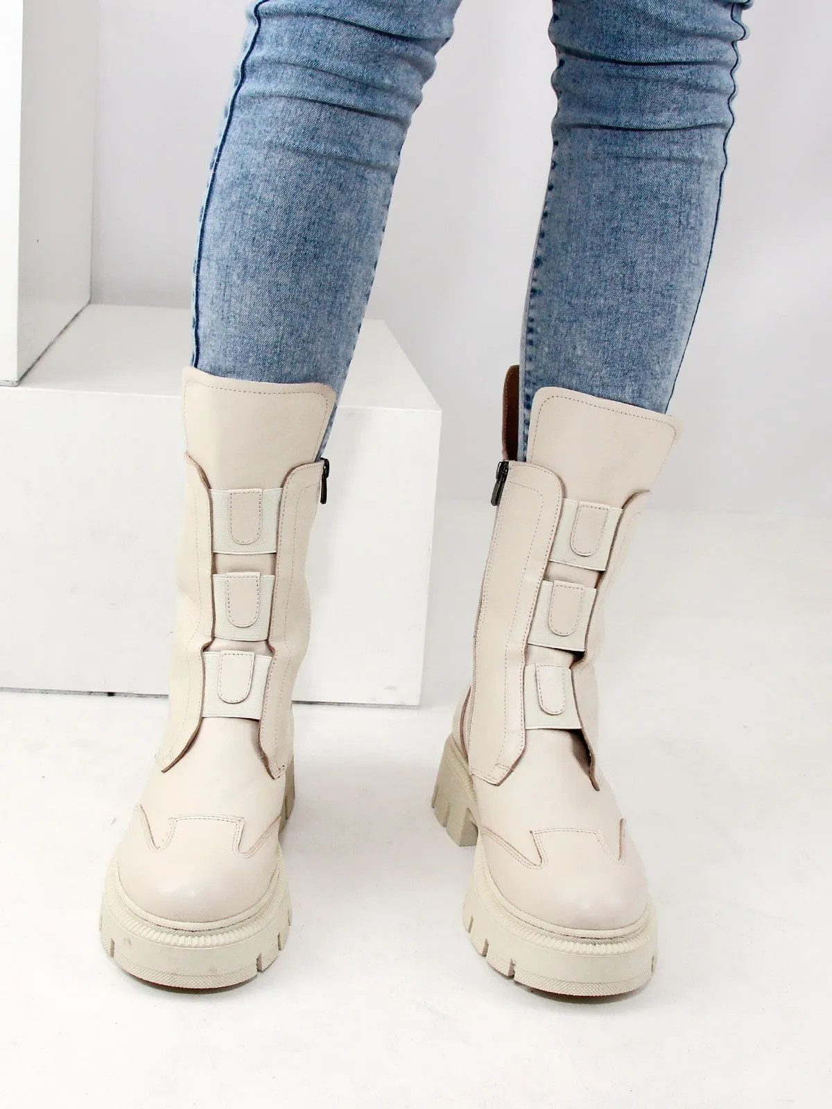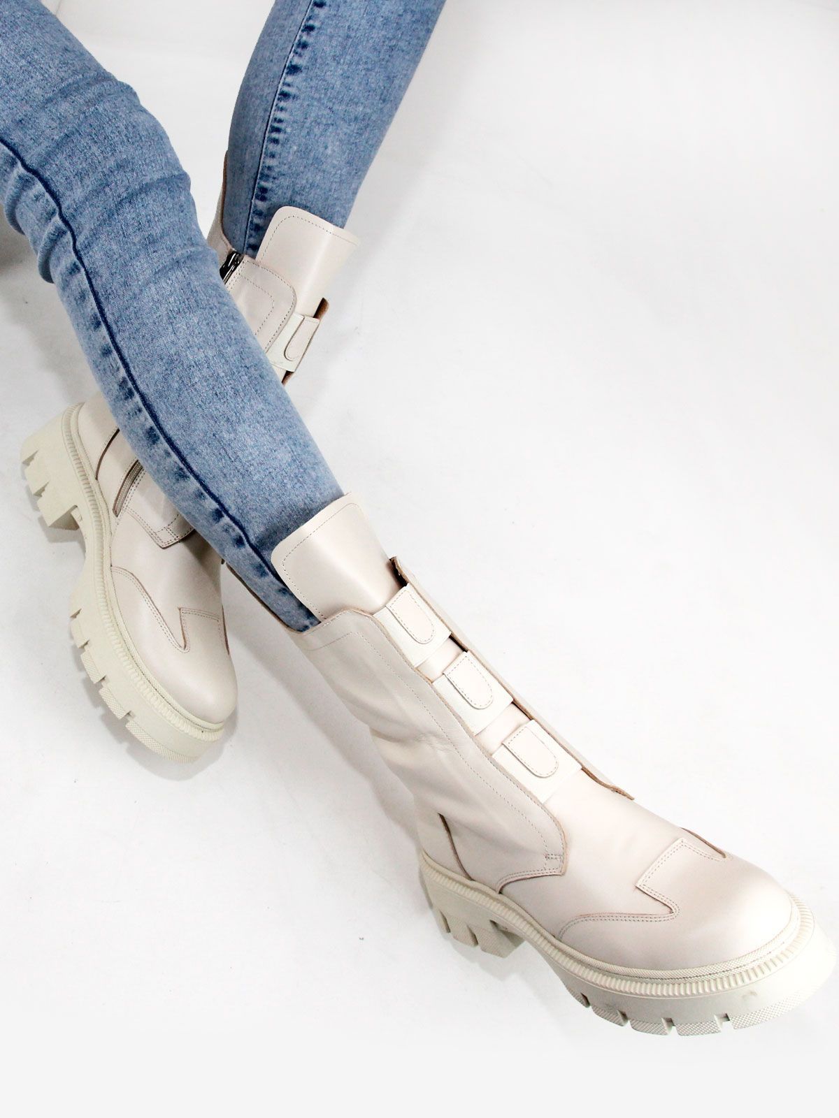 Идеальные универсальные женские ботинки больших размеров из натуральной матовой гладкой кожи классического бежевого цвета, на платформе. Зимние ботинки на молнии утеплены натуральным мехом и выполнены на нескользкой тракторной подошве с протектором в цвет кожи. Сбоку - молния. Модель большемерит,пожалуйста, ориентируйтесь на длину стельки в описании.