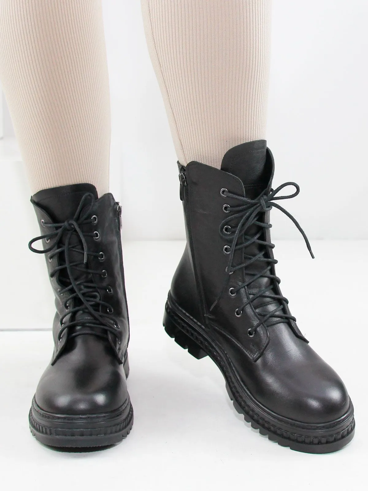 Стильные женские черные ботинки большого размера из натуральной кожи. Подойдут на стандартную и широкую стопу. Подскладка - байка.Нескользкая резиновая подошва. Застежка - шнуровка + молния сбоку.