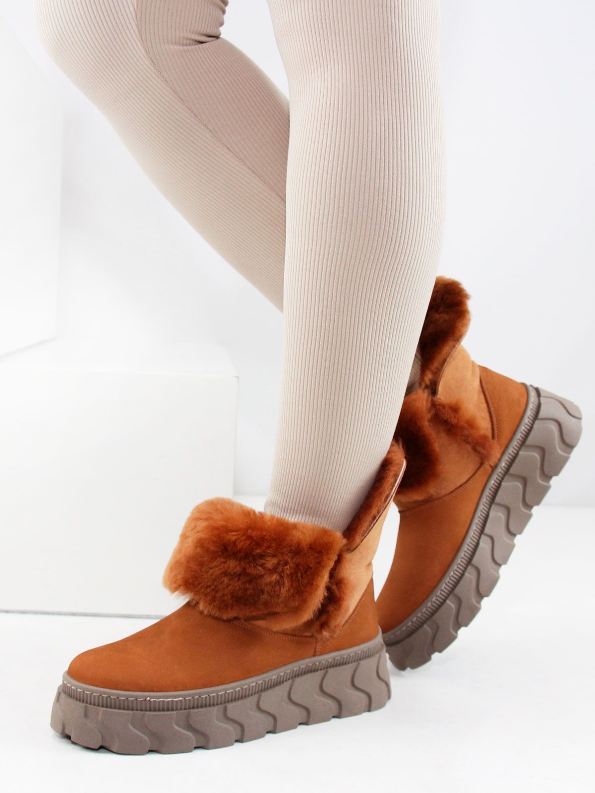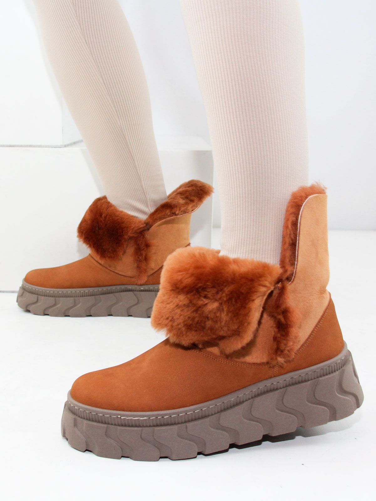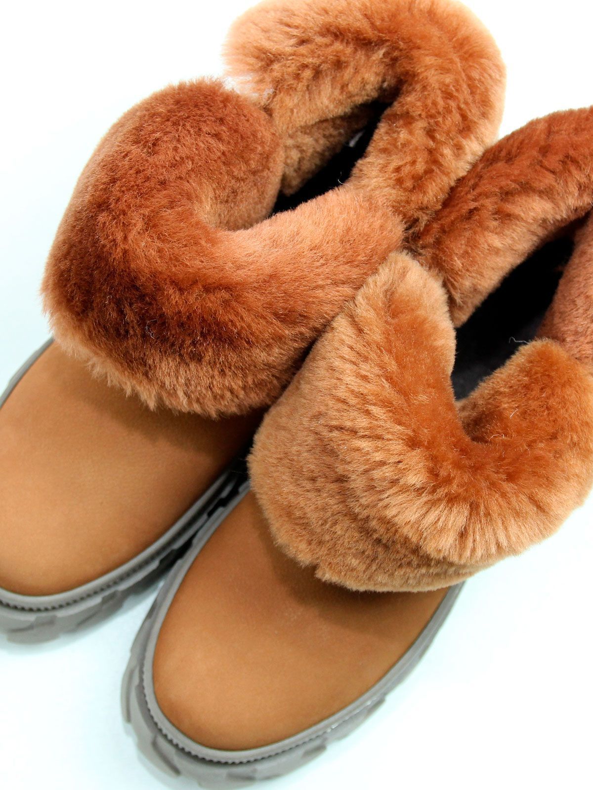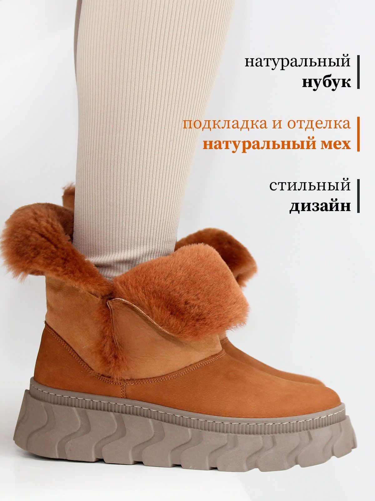 Зимние ботинки женские больших размеров рыжего цвета. Ботинки из натурального нубука с толстым натуральным мехом по всей высоте, очень теплые. Подошва из современного полимерного материала - прочная, морозоустойчивая и не скользит. Подойдут на стандартную полноту.