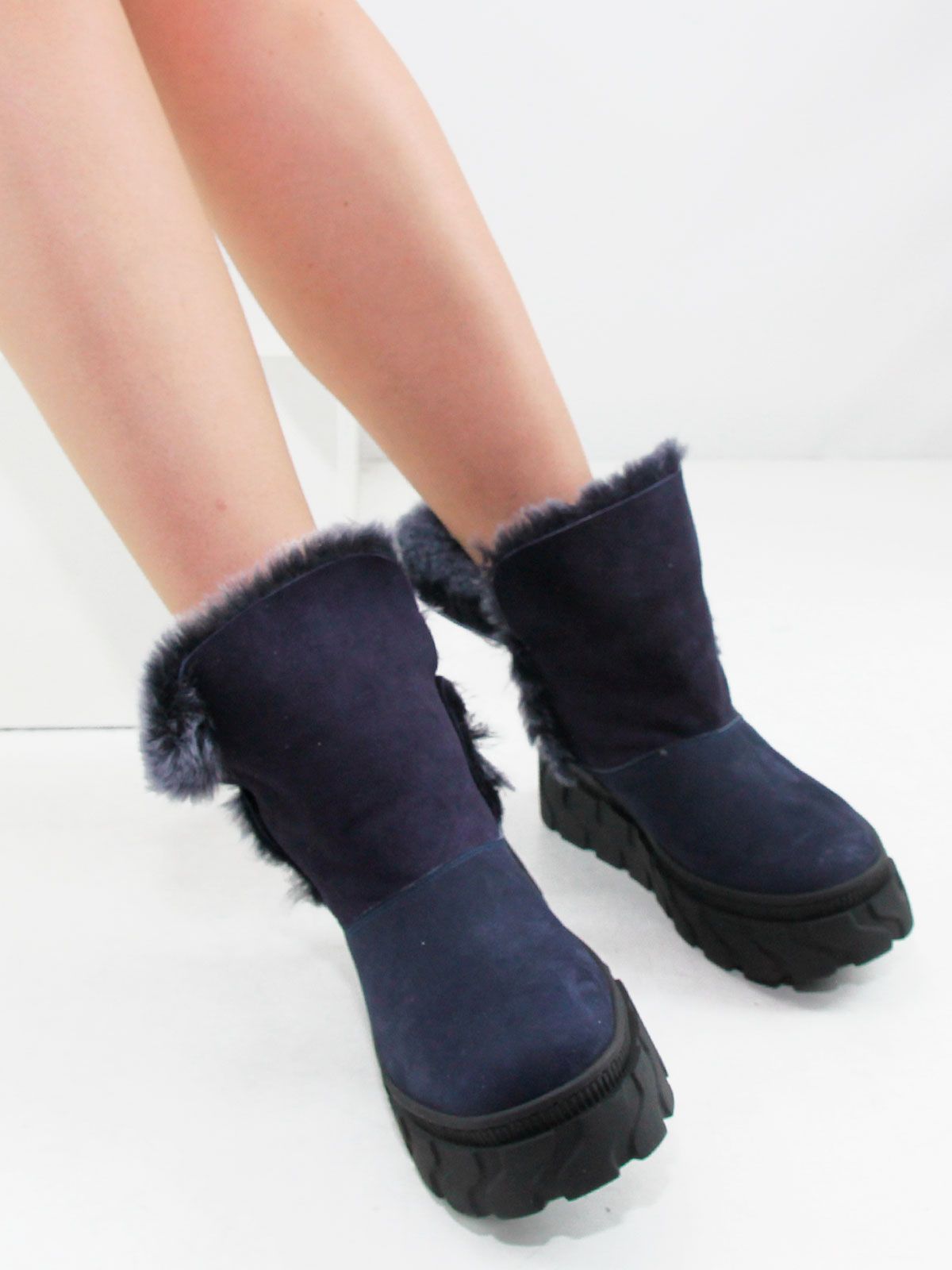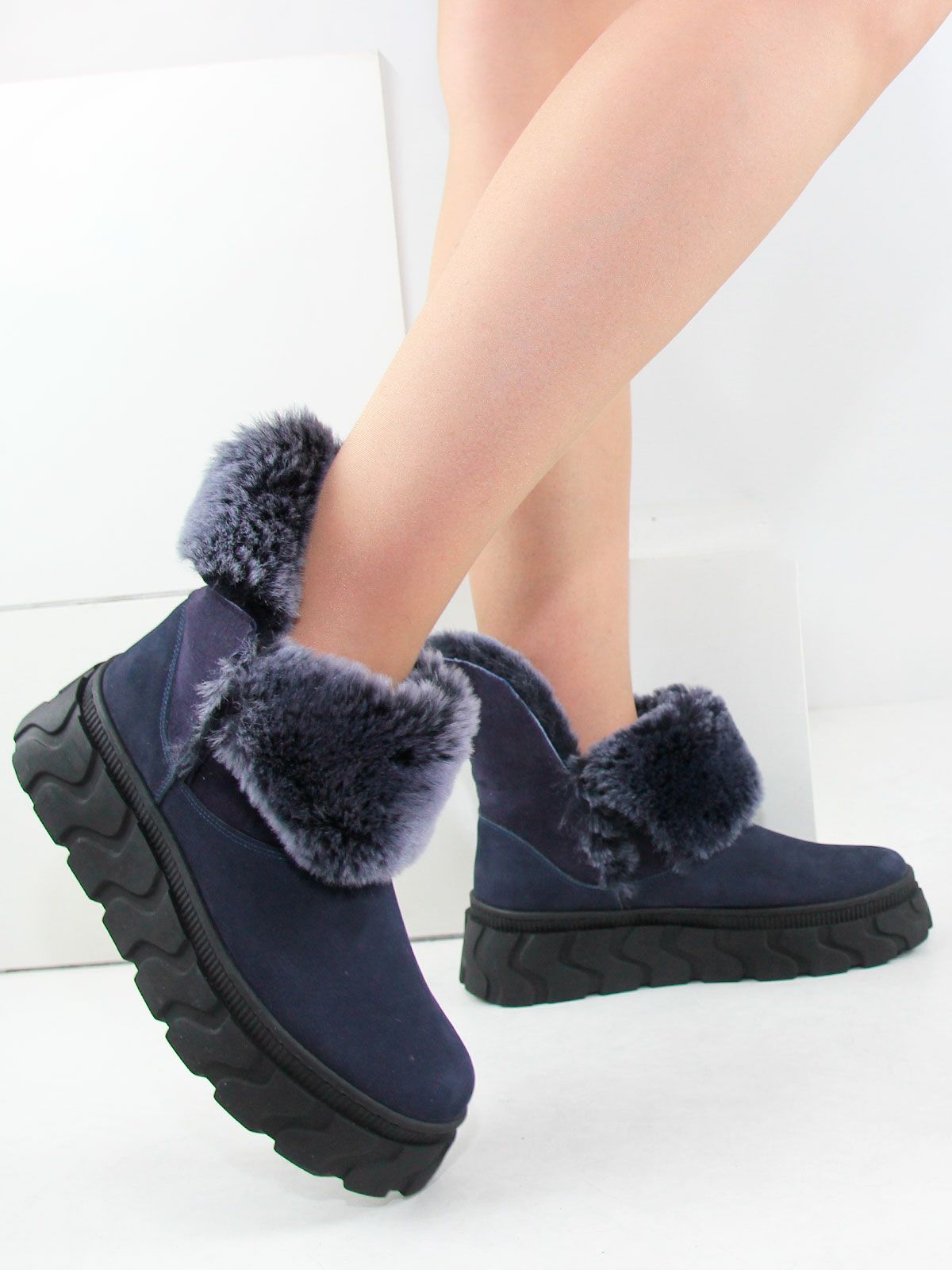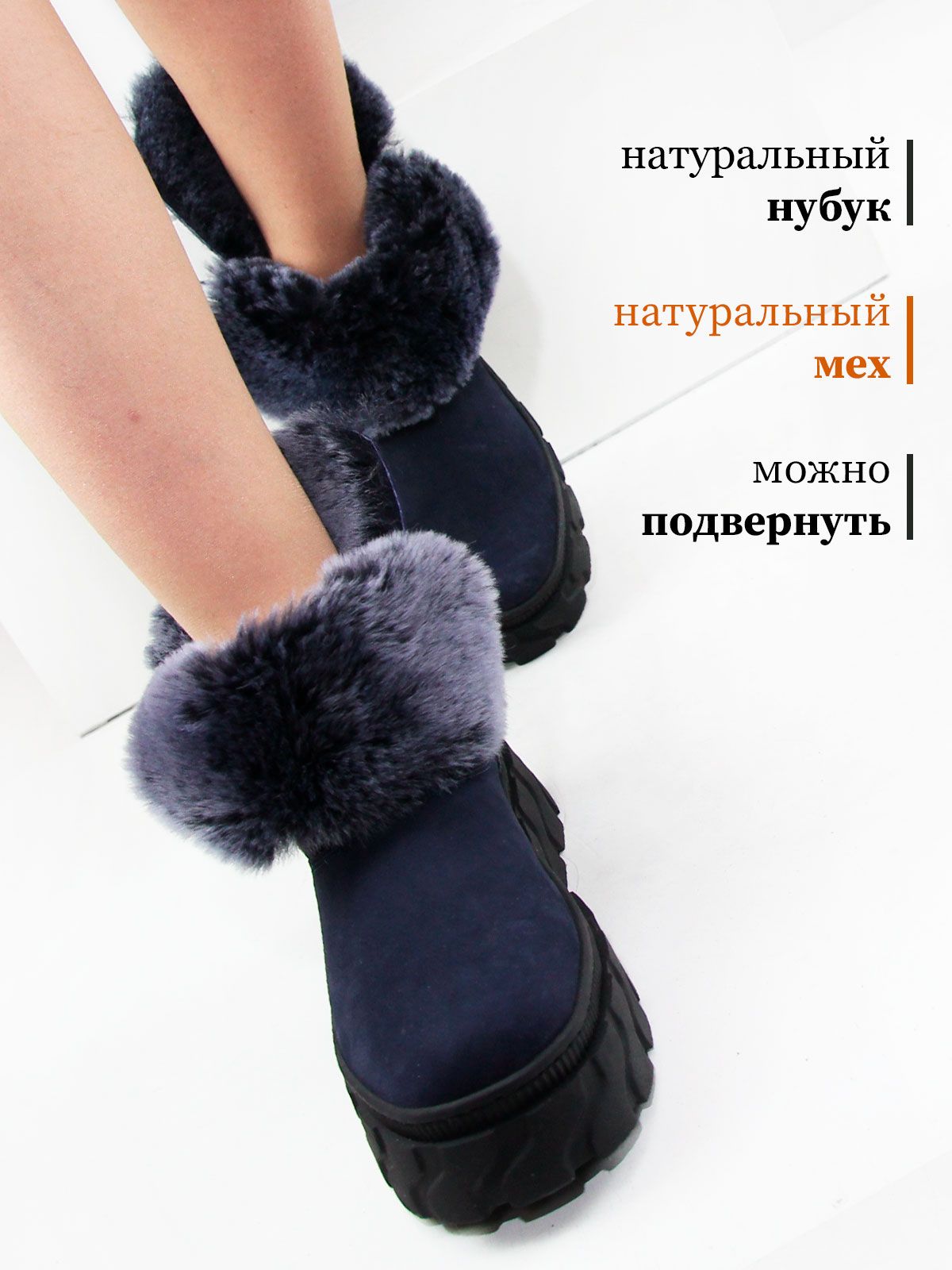 Зимние ботинки женские больших размеров синего цвета. Ботинки из натурального нубука с толстым натуральным мехом по всей высоте, очень теплые. Подошва из современного полимерного материала - прочная, морозоустойчивая и не скользит. Подойдут на стандартную полноту.