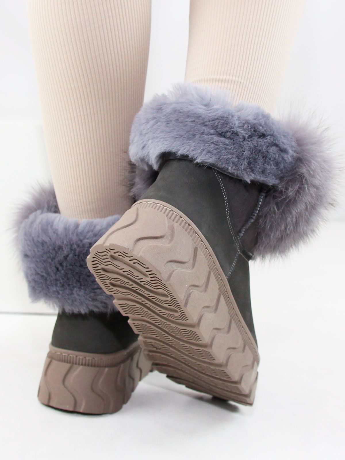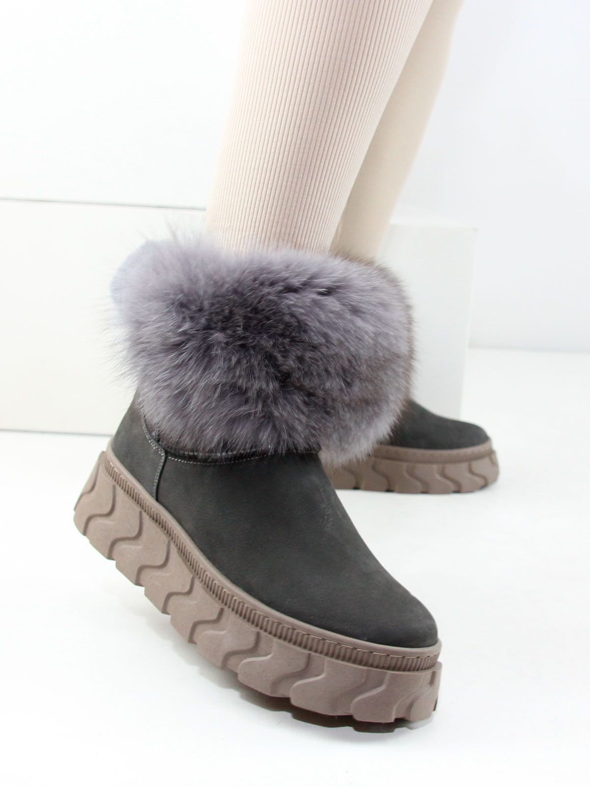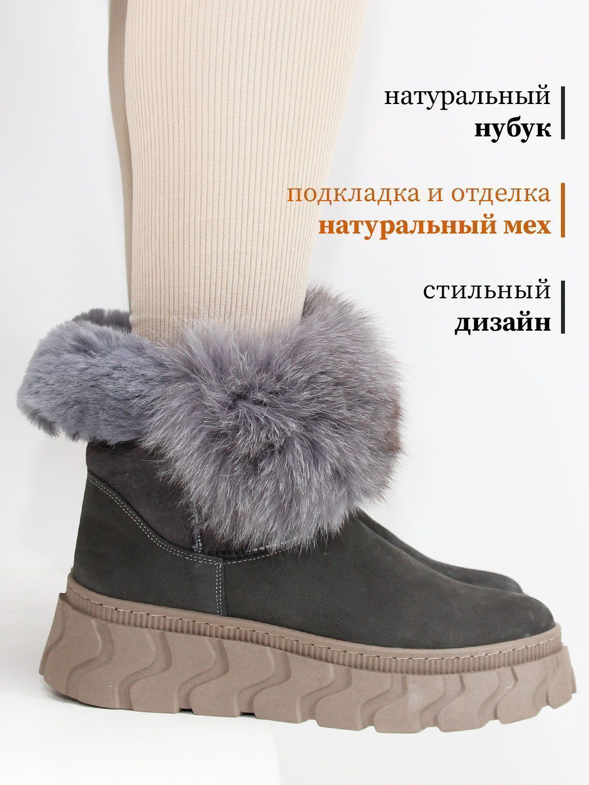 Зимние ботинки женские больших размеров серого цвета. Ботинки из натурального нубука с толстым натуральным мехом по всей высоте, очень теплые. Подошва из современного полимерного материала - прочная, морозоустойчивая и не скользит. Подойдут на стандартную полноту.