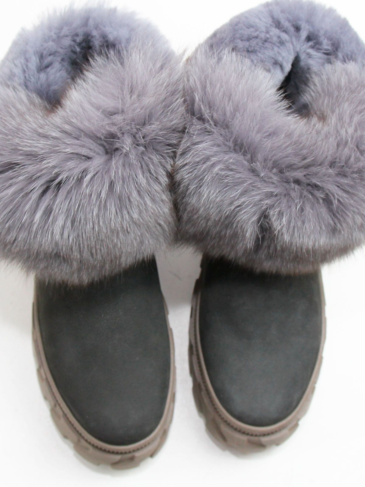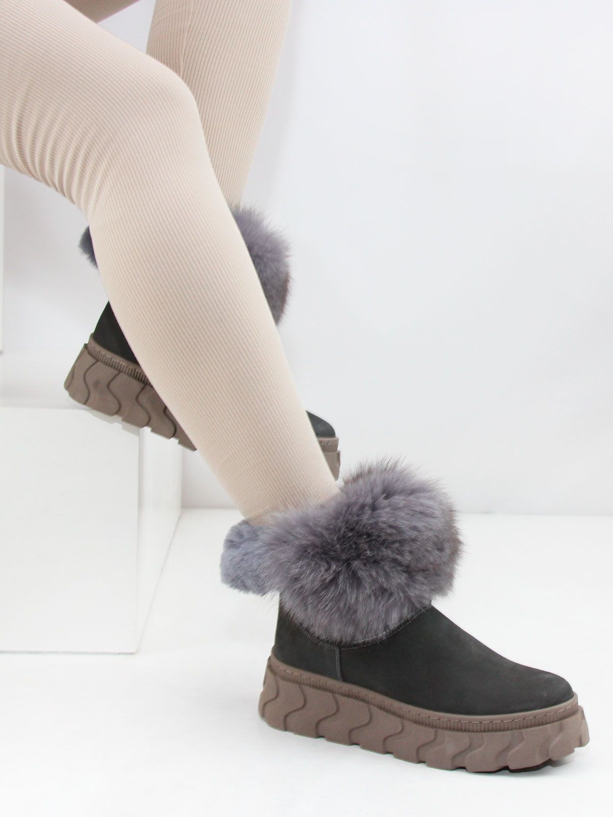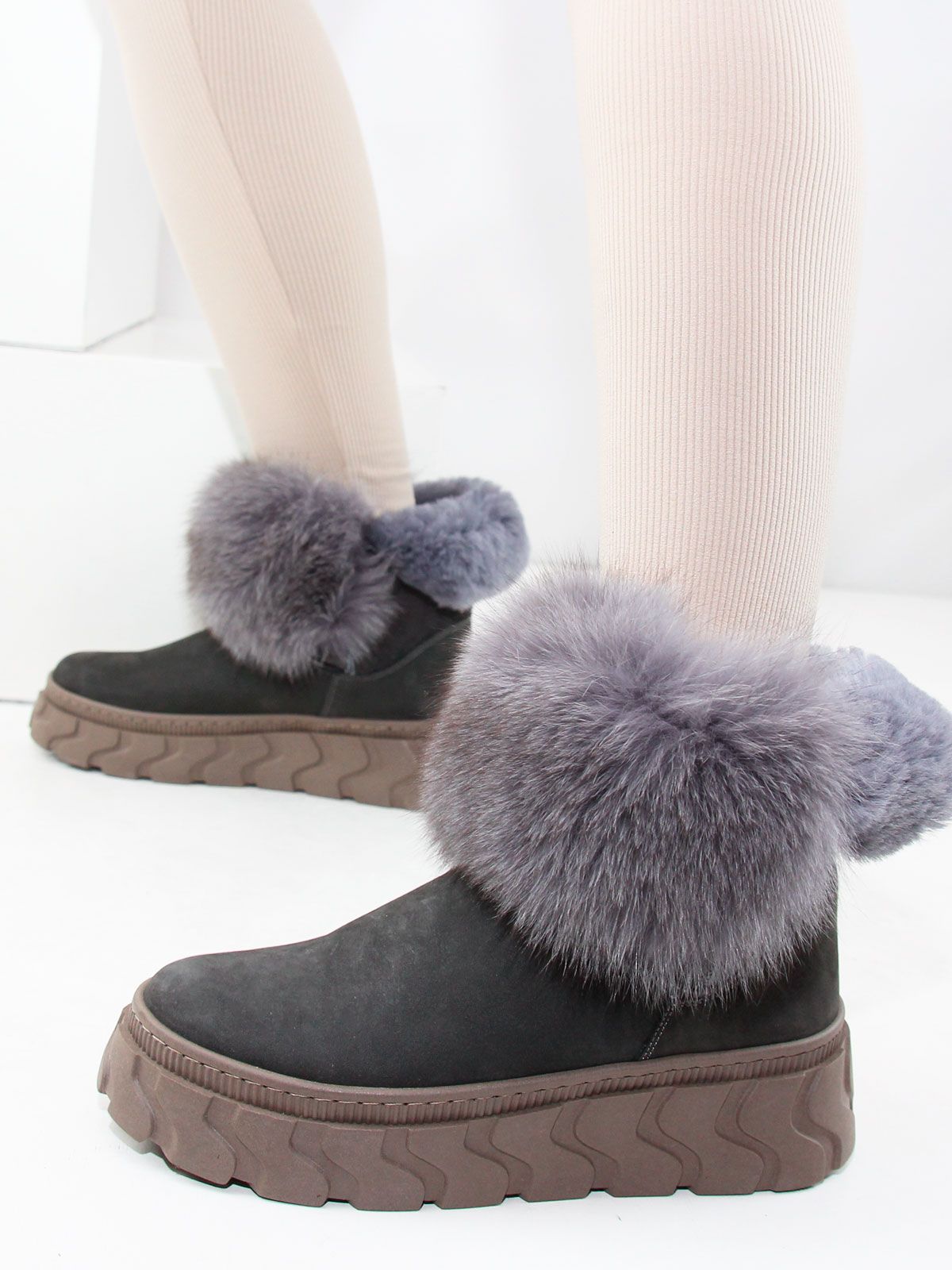 Зимние ботинки женские больших размеров серого цвета. Ботинки из натурального нубука с толстым натуральным мехом по всей высоте, очень теплые. Подошва из современного полимерного материала - прочная, морозоустойчивая и не скользит. Подойдут на стандартную полноту.