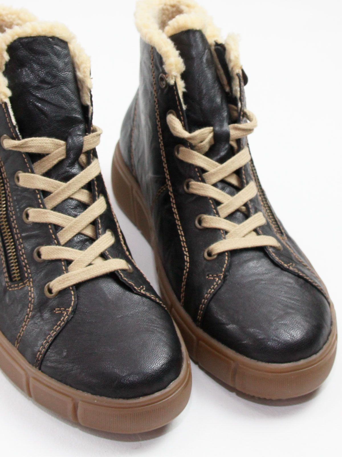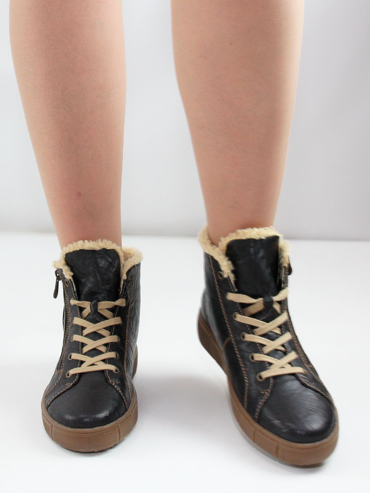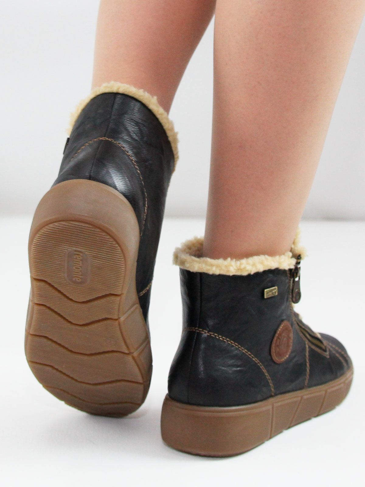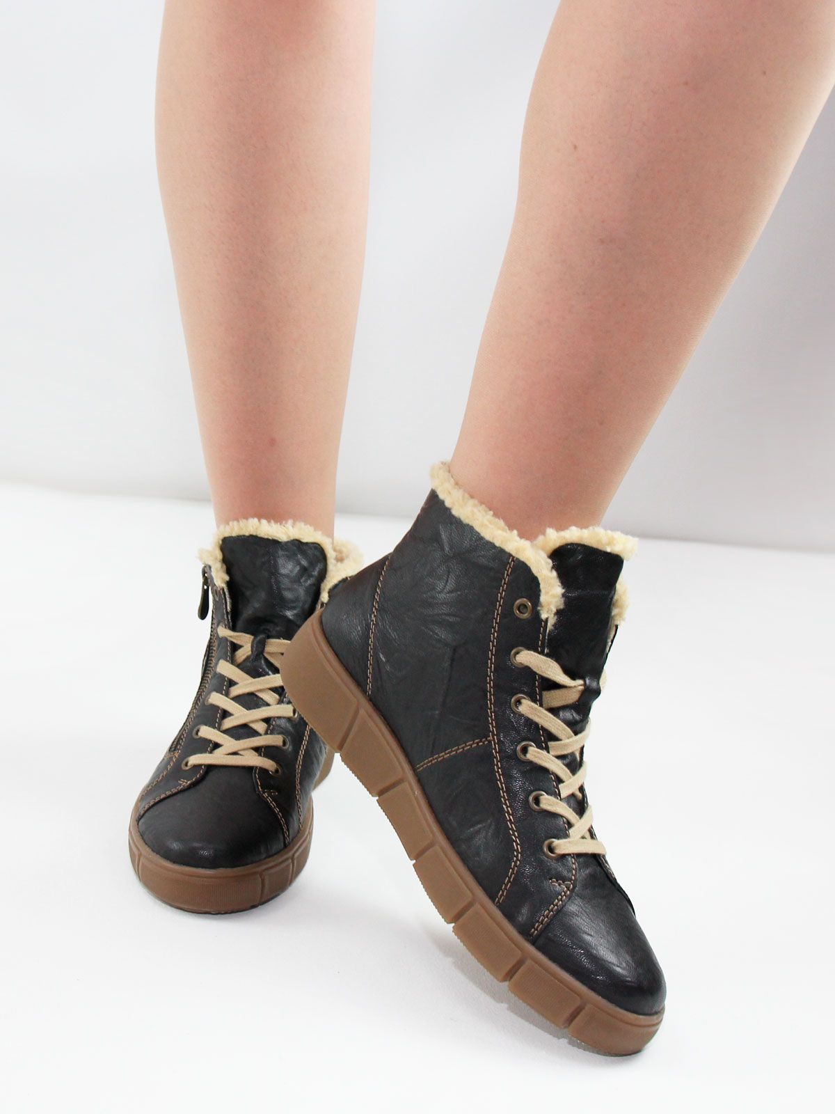 Черные женские ботинки remonte на молнии и шнуровке из натуральной кожи не только ультра-стильны, но и отличаются комфортом. Амортизирующая и сверхлегкая подошва в сочетании с мягкой и съемной стелькой создают ощущение комфорта при каждом шаге.