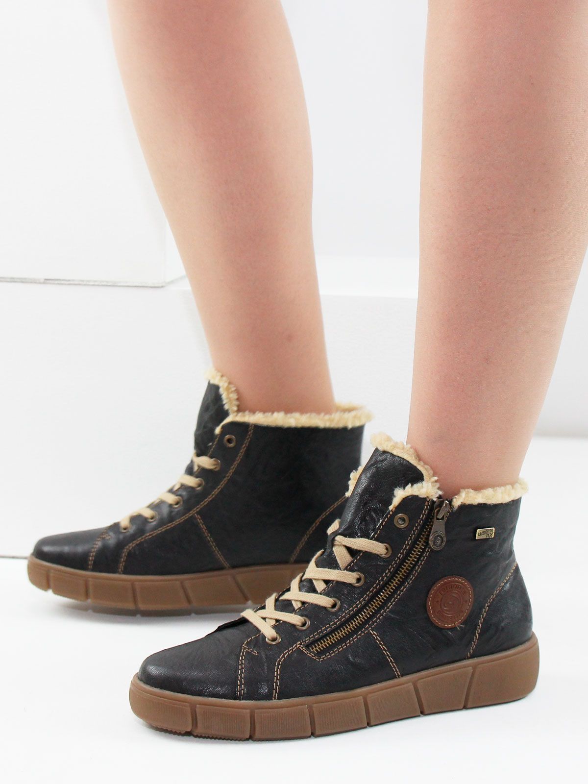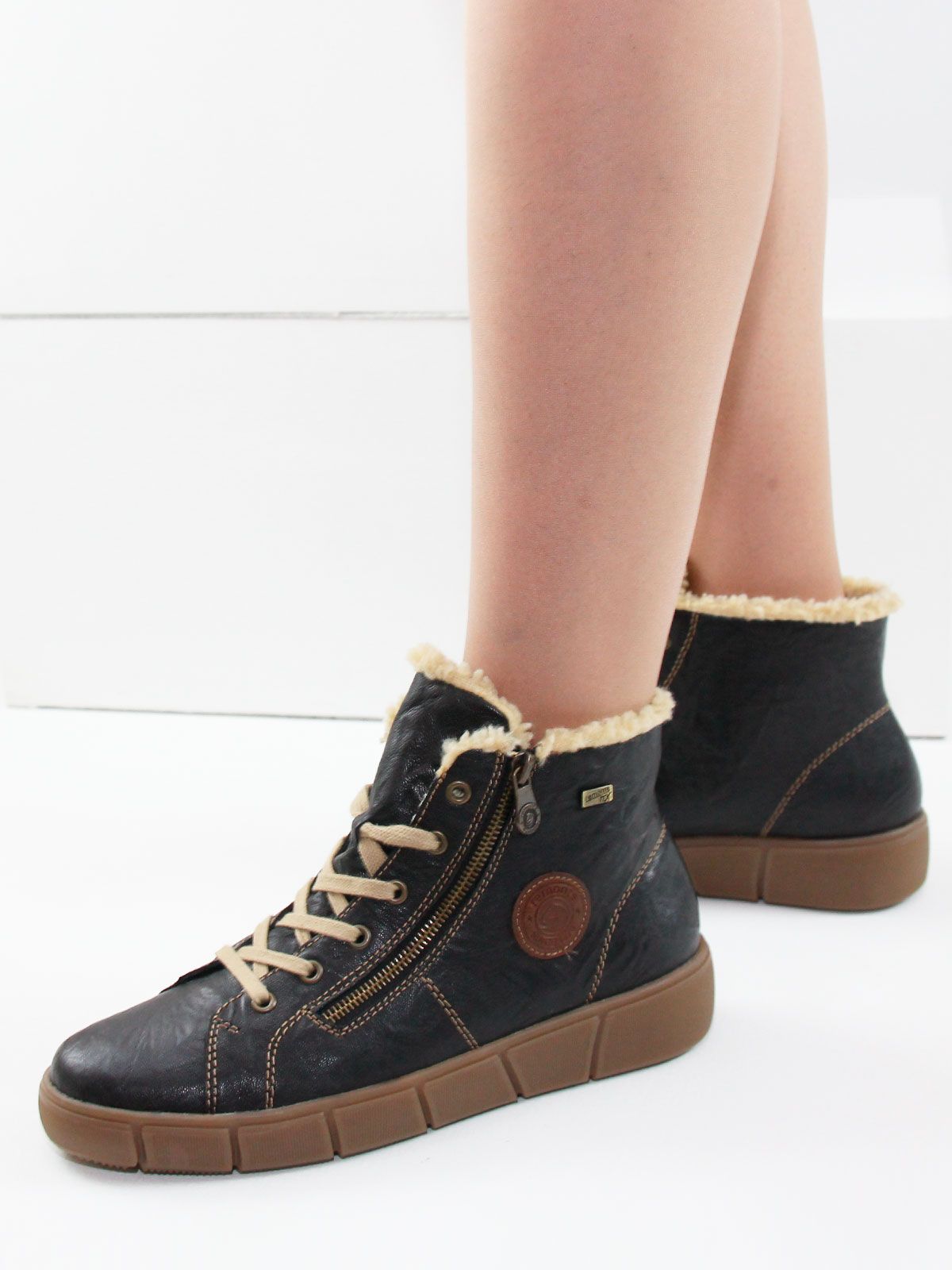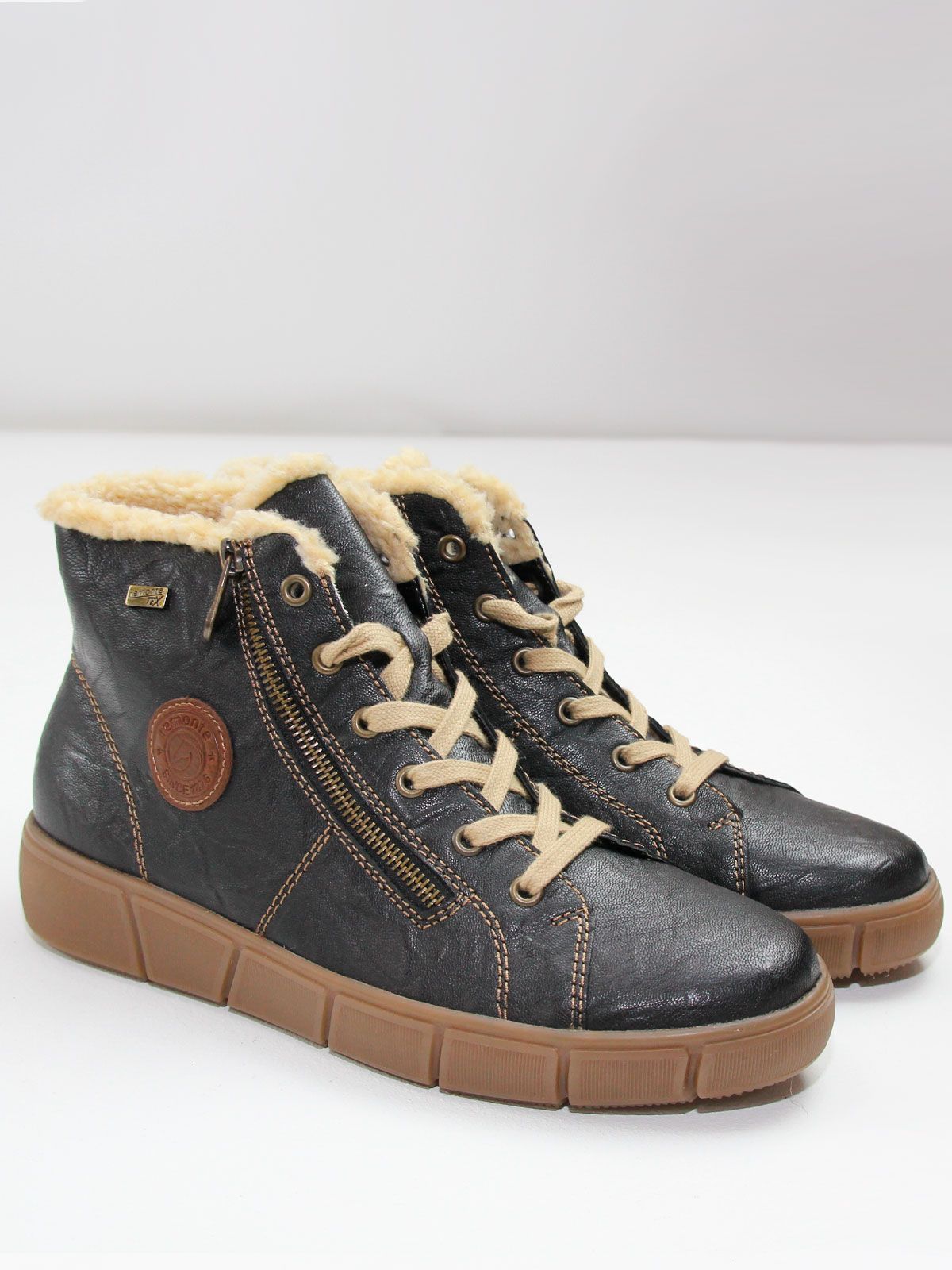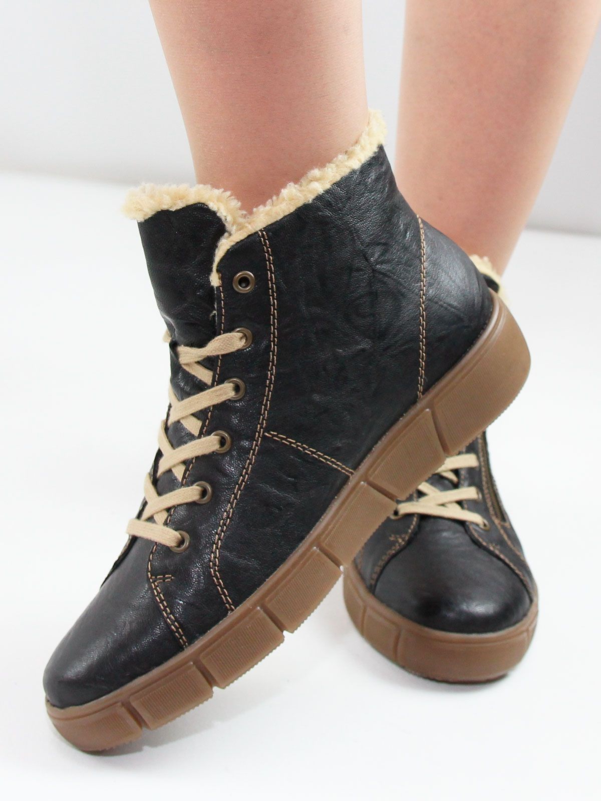 Черные женские ботинки remonte на молнии и шнуровке из натуральной кожи не только ультра-стильны, но и отличаются комфортом. Амортизирующая и сверхлегкая подошва в сочетании с мягкой и съемной стелькой создают ощущение комфорта при каждом шаге.