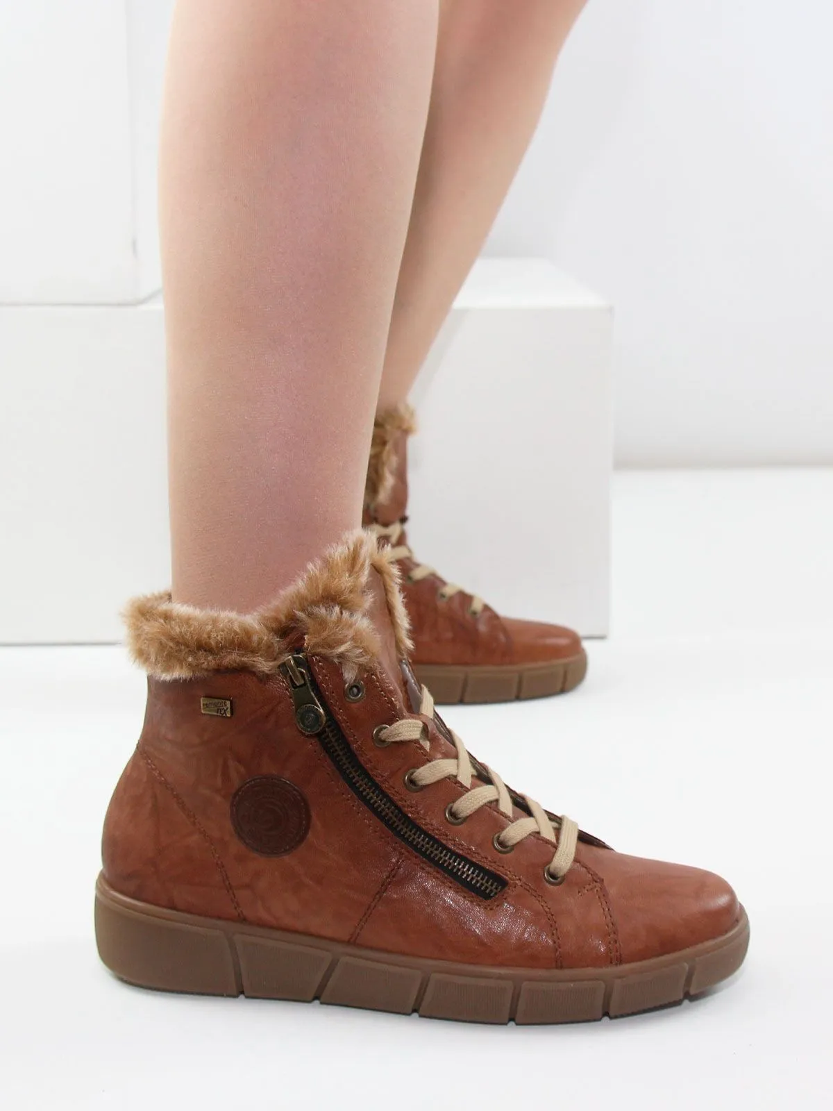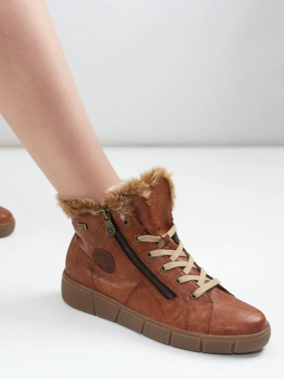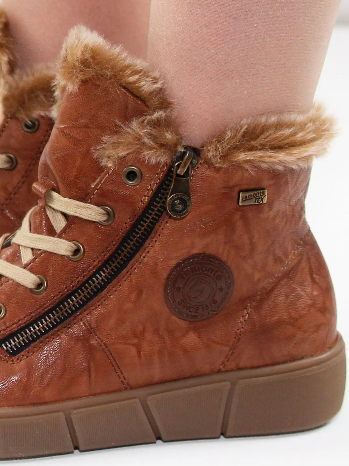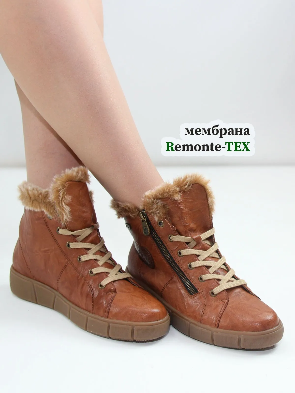 Коричневые женские ботинки Remonte на молнии и шнуровке из натуральной кожи не только ультра-стильны, но и отличаются комфортом. Амортизирующая и сверхлегкая подошва в сочетании с мягкой и съемной стелькой создают ощущение комфорта при каждом шаге. Мембрана Remonte-Tex представляет собой ультратонкий слой, расположенный между внешней и внутренней подкладкой обуви.