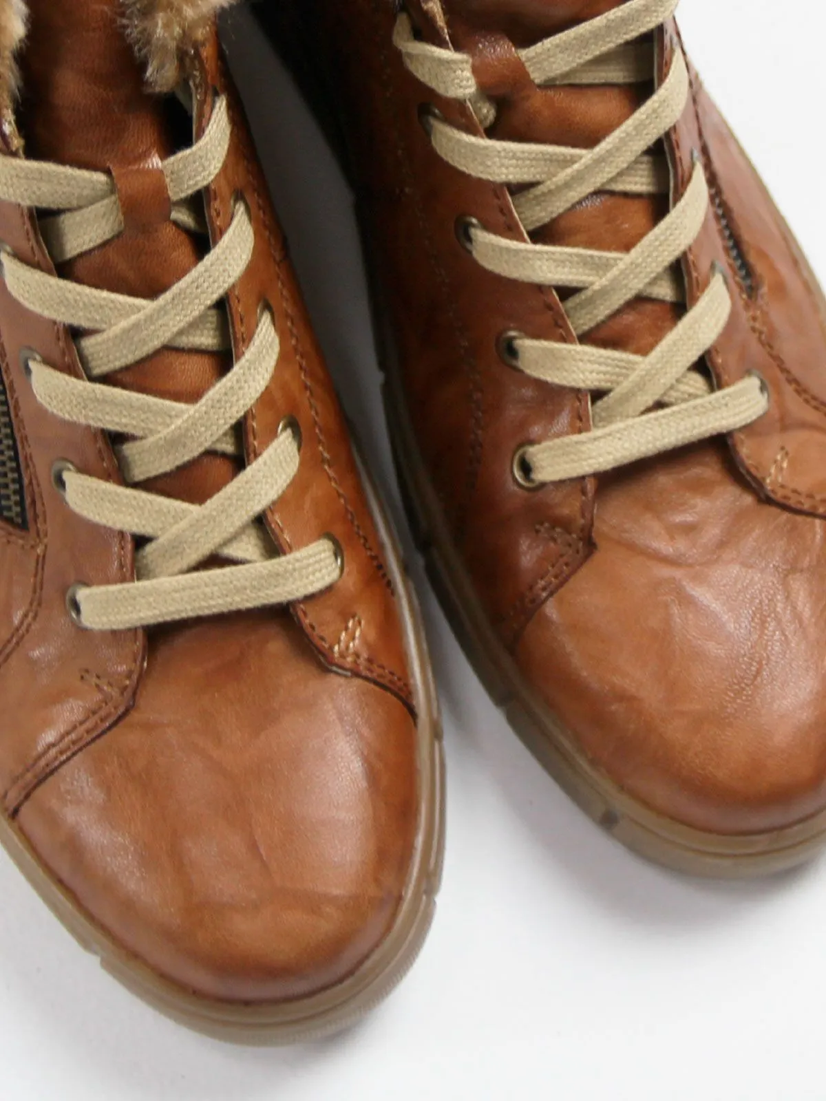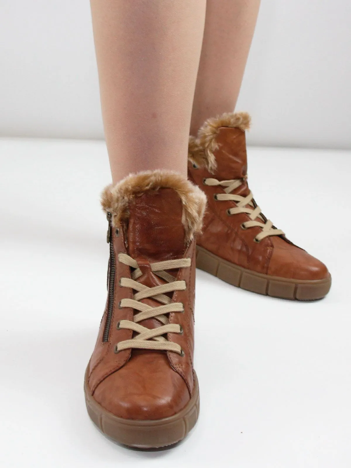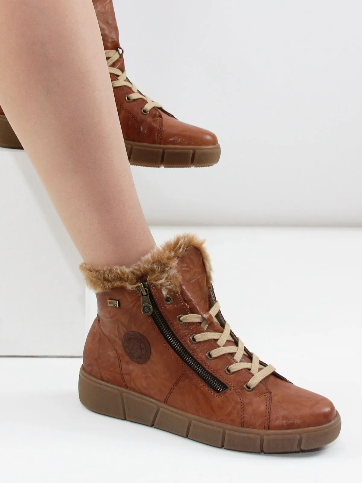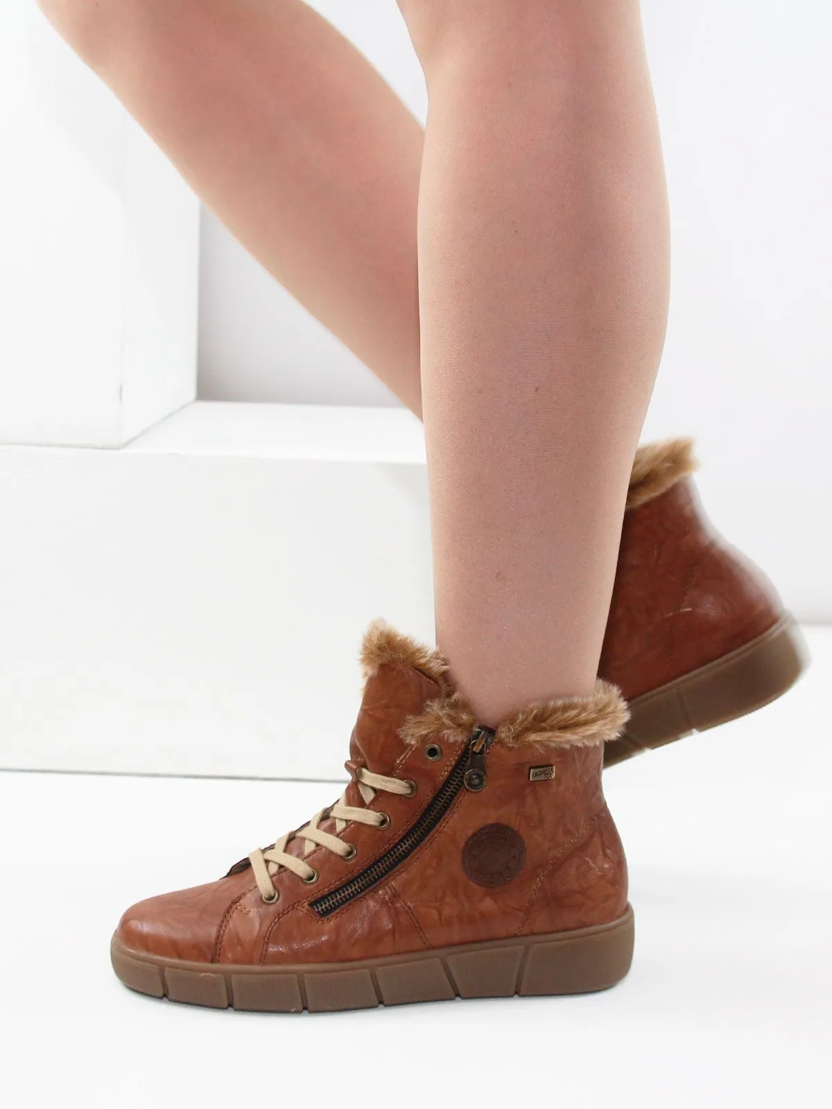 Коричневые женские ботинки Remonte на молнии и шнуровке из натуральной кожи не только ультра-стильны, но и отличаются комфортом. Амортизирующая и сверхлегкая подошва в сочетании с мягкой и съемной стелькой создают ощущение комфорта при каждом шаге. Мембрана Remonte-Tex представляет собой ультратонкий слой, расположенный между внешней и внутренней подкладкой обуви.