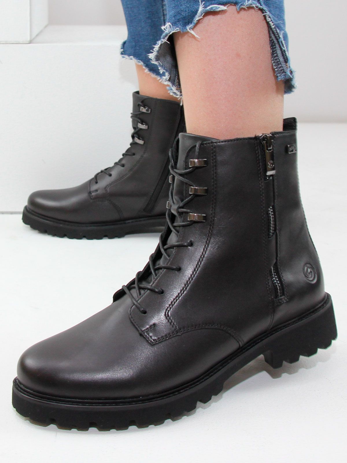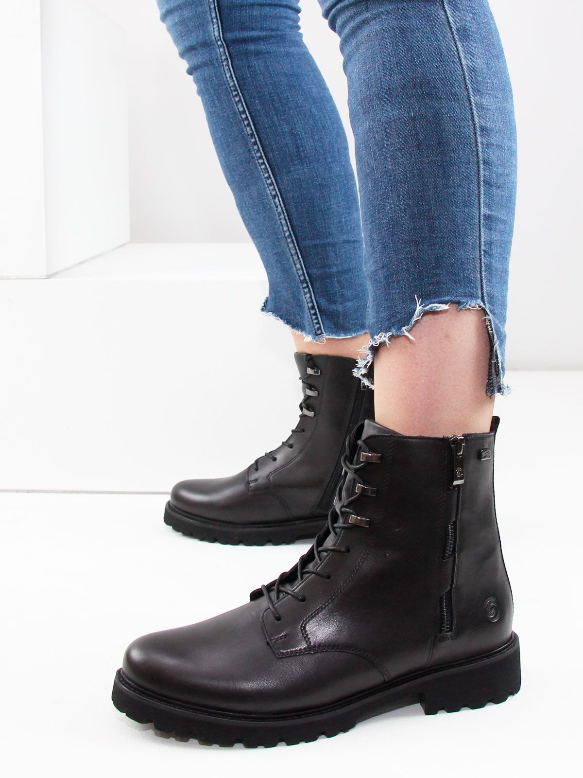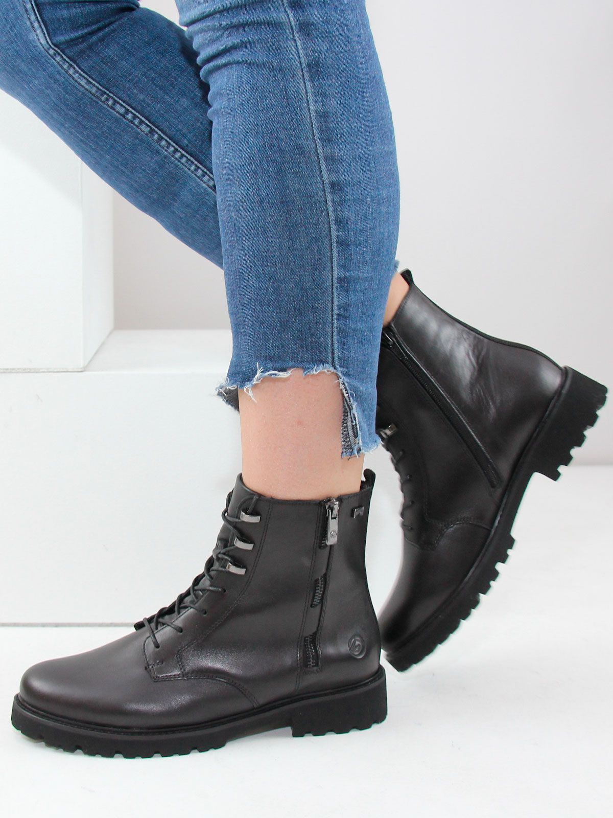 Черные женские ботинки remonte на шнуровке из гладкой кожи не только ультра-стильны, но и отличаются комфортом. Шнуровка дополнена застежкой-молнией, что гарантирует оптимальную фиксацию и идеальную посадку. Амортизирующая и сверхлегкая подошва в сочетании с мягкой и съемной стелькой создают ощущение комфорта при каждом шаге. Шнуровкой можно отрегулировать полноту по размеру для комфорта.